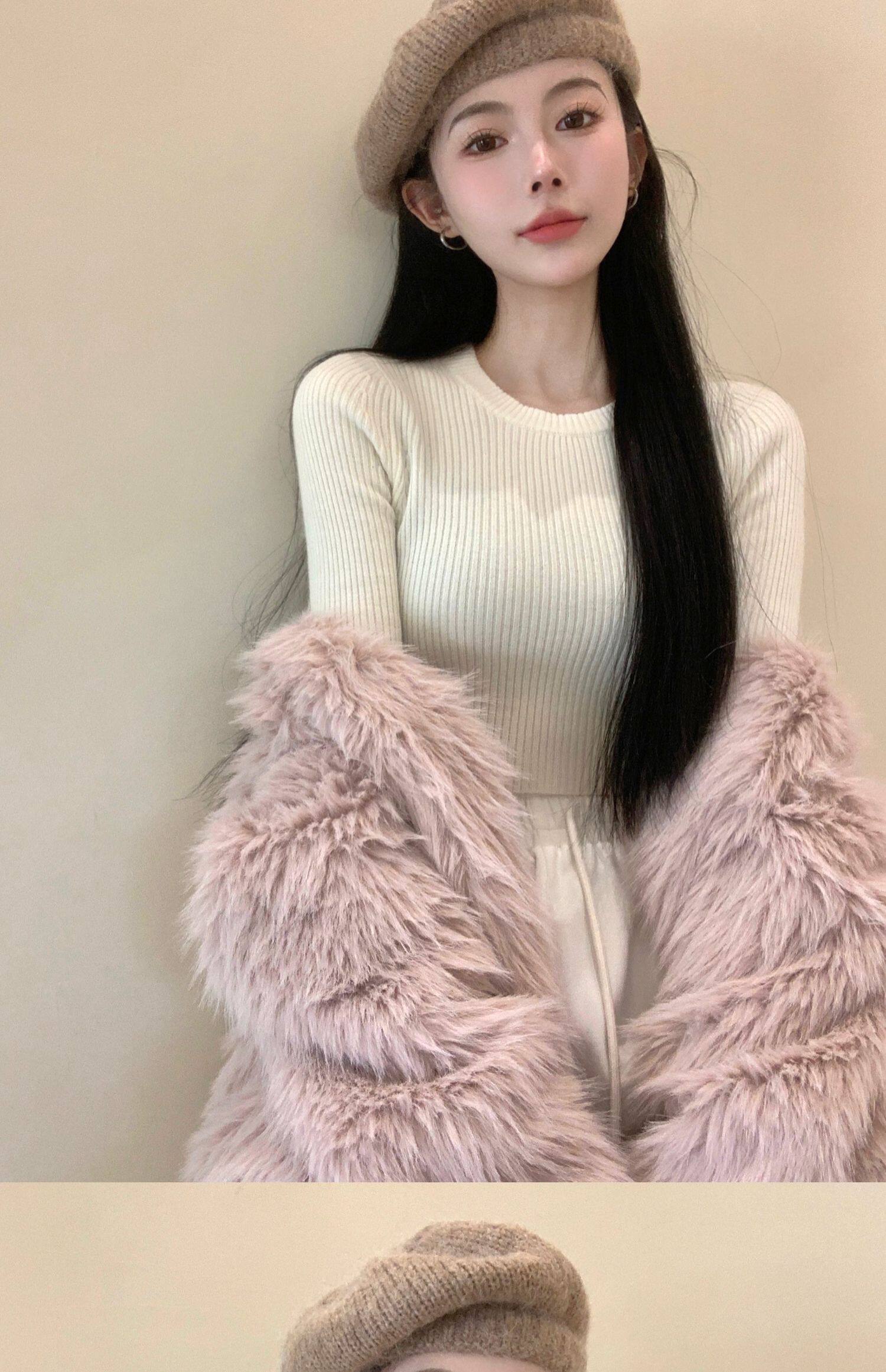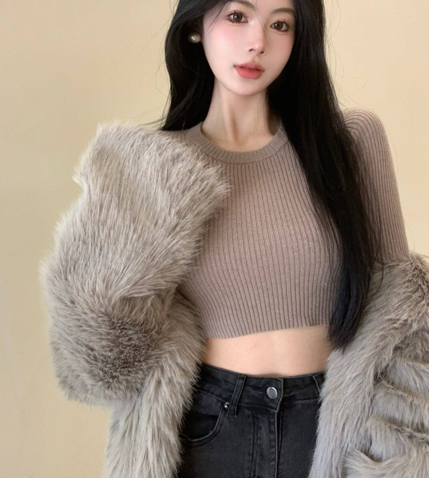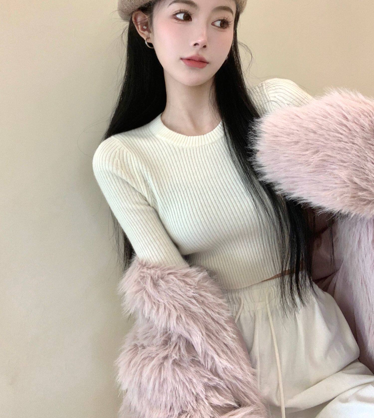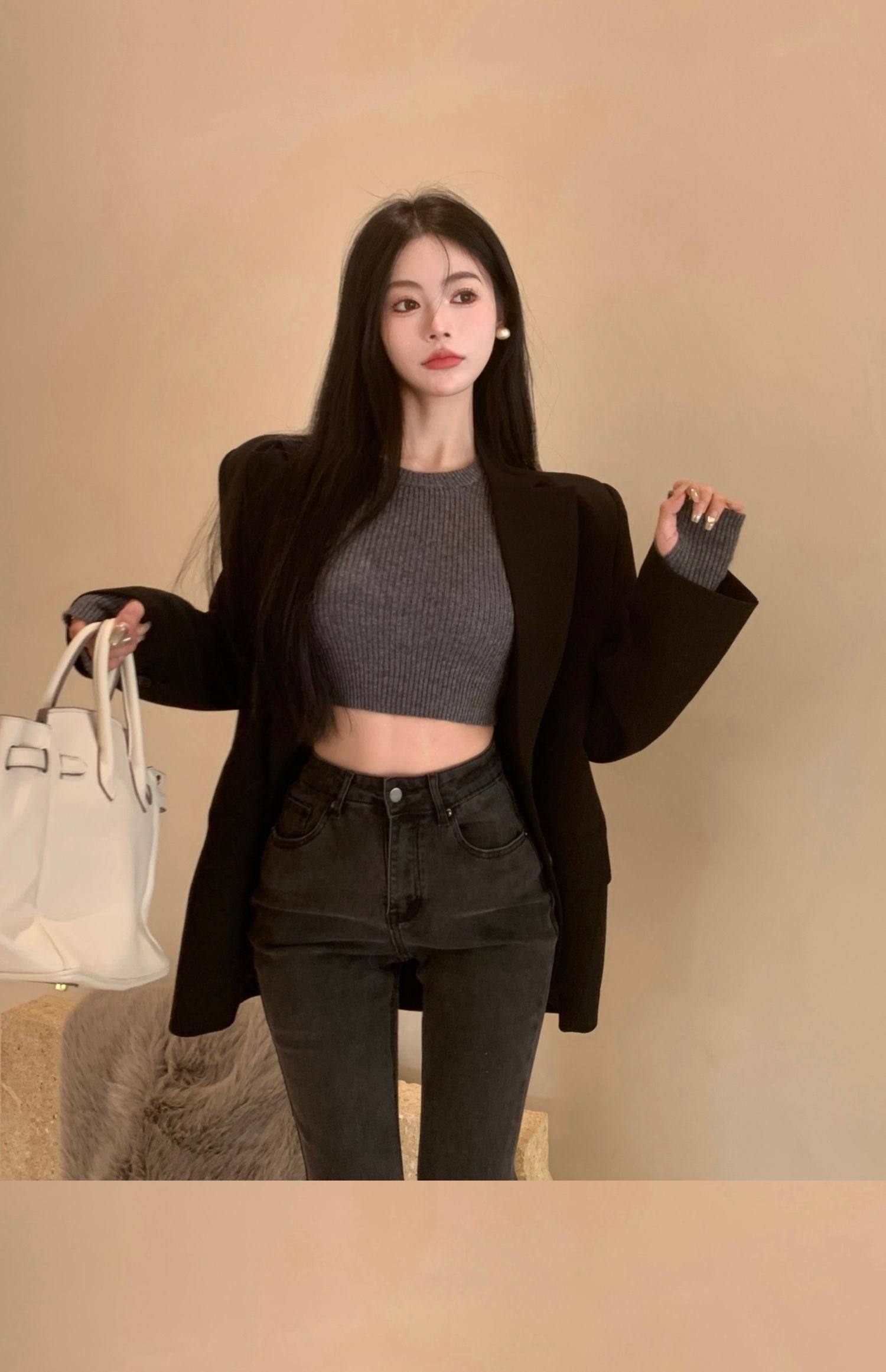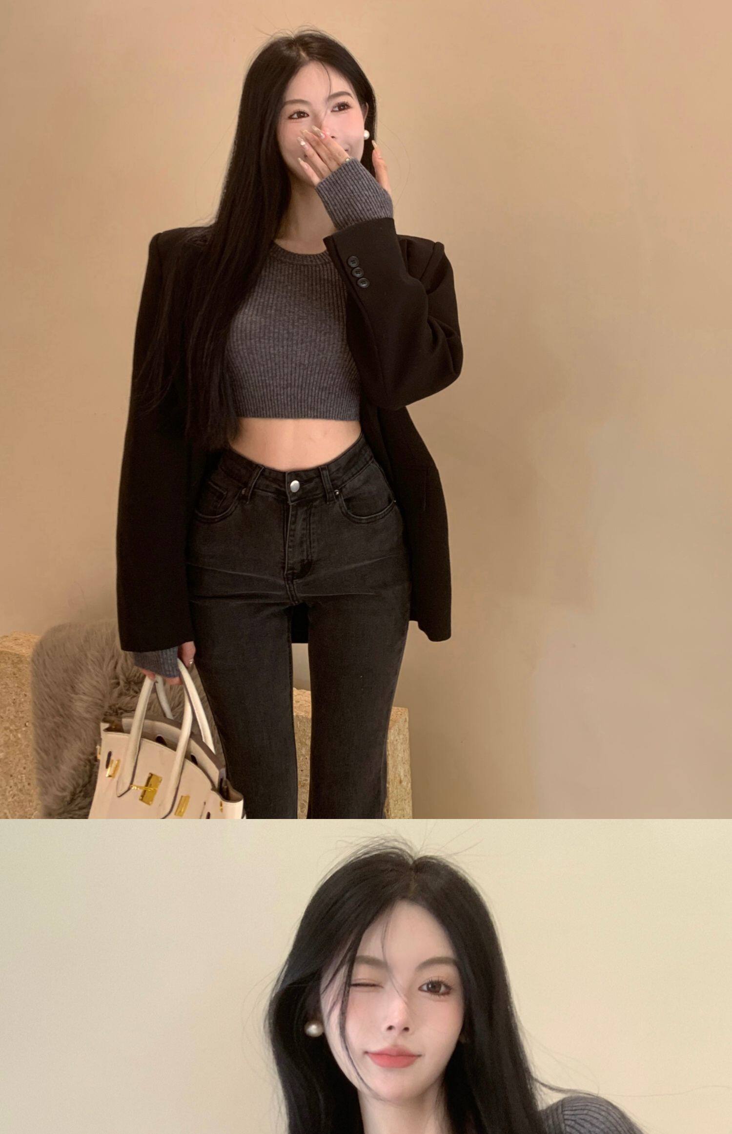 灰色長袖針織衫女2025春秋內搭修身短款露臍洋氣緊身打底衫上衣潮