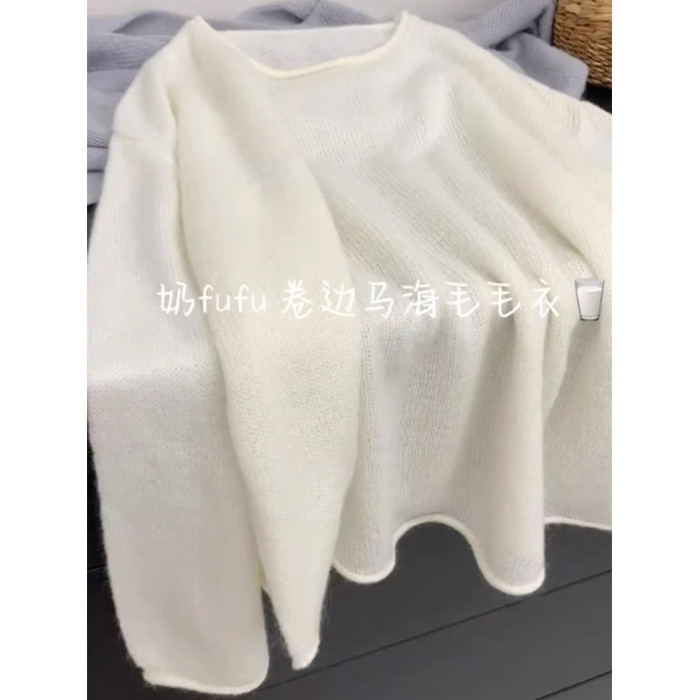 日系牛油果綠卷邊馬海毛針織衫女早秋薄款軟糯打底毛衣高級感上衣