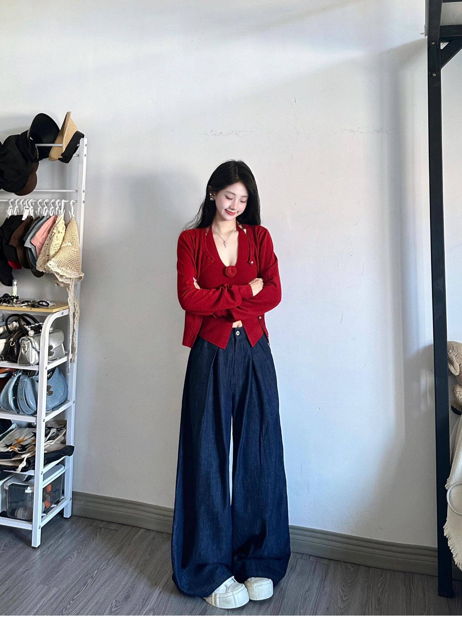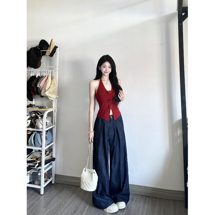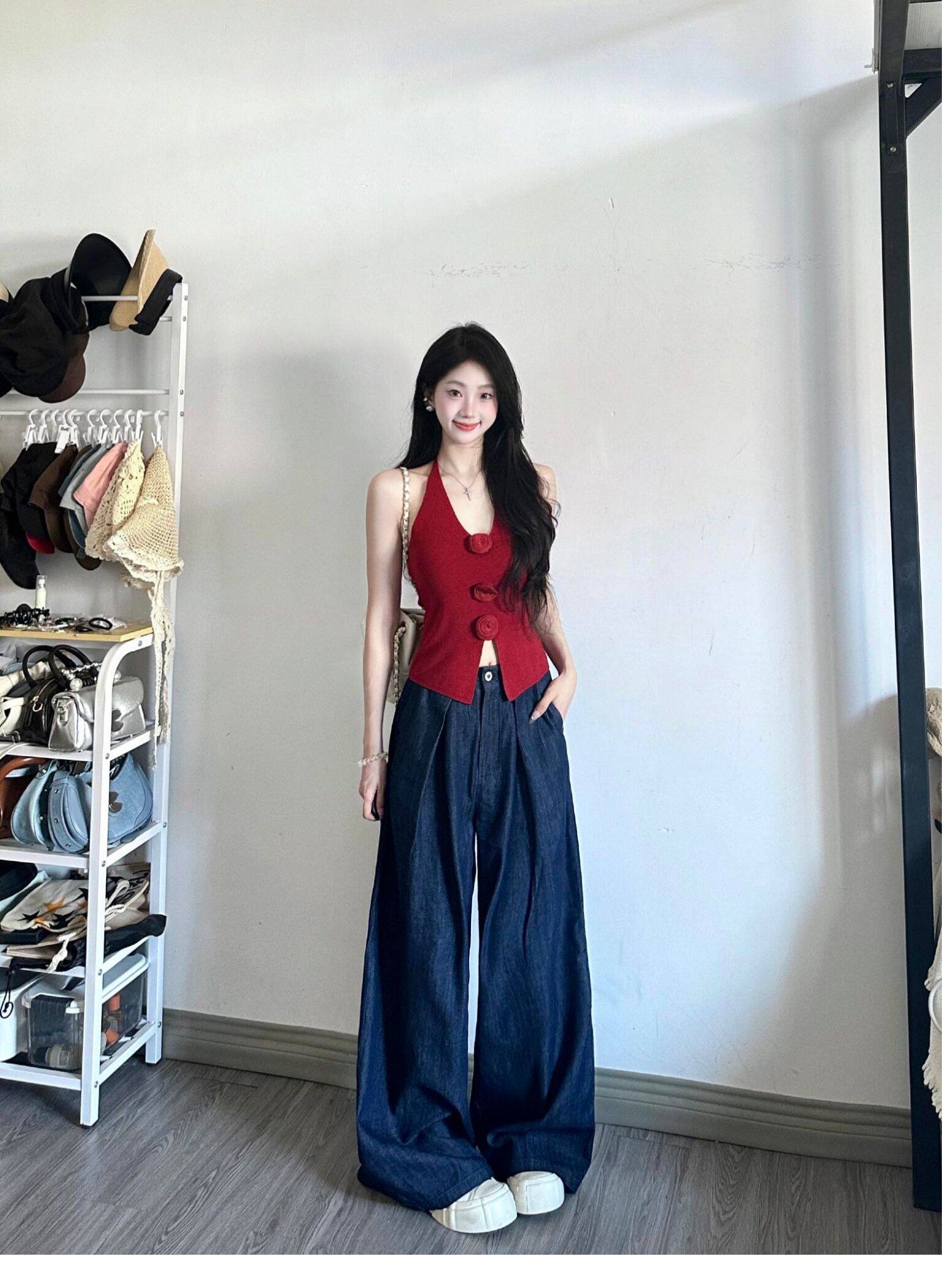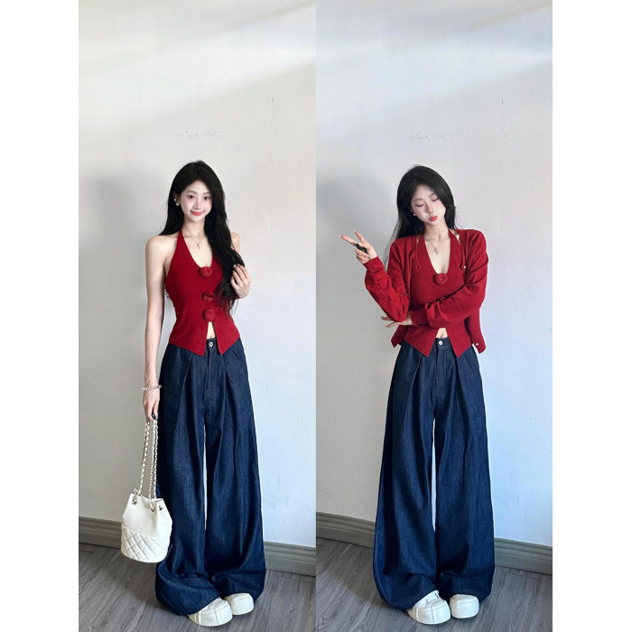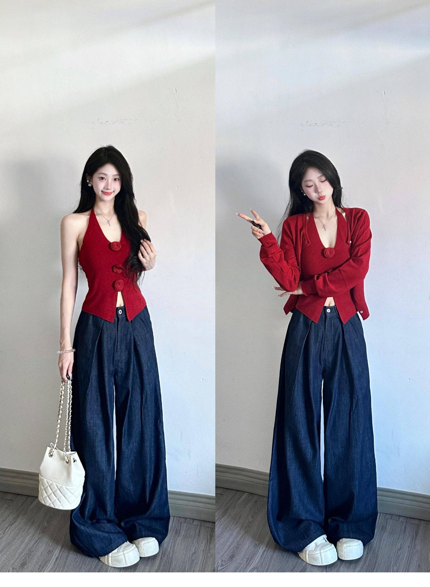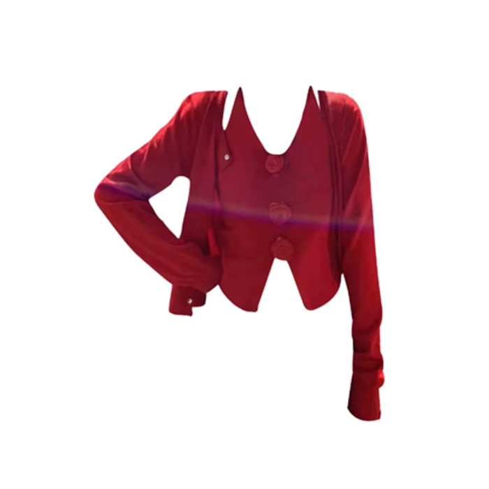 法式紅色套裝女春季新款時尚氣質針織開衫修身花朵掛脖背心兩件套