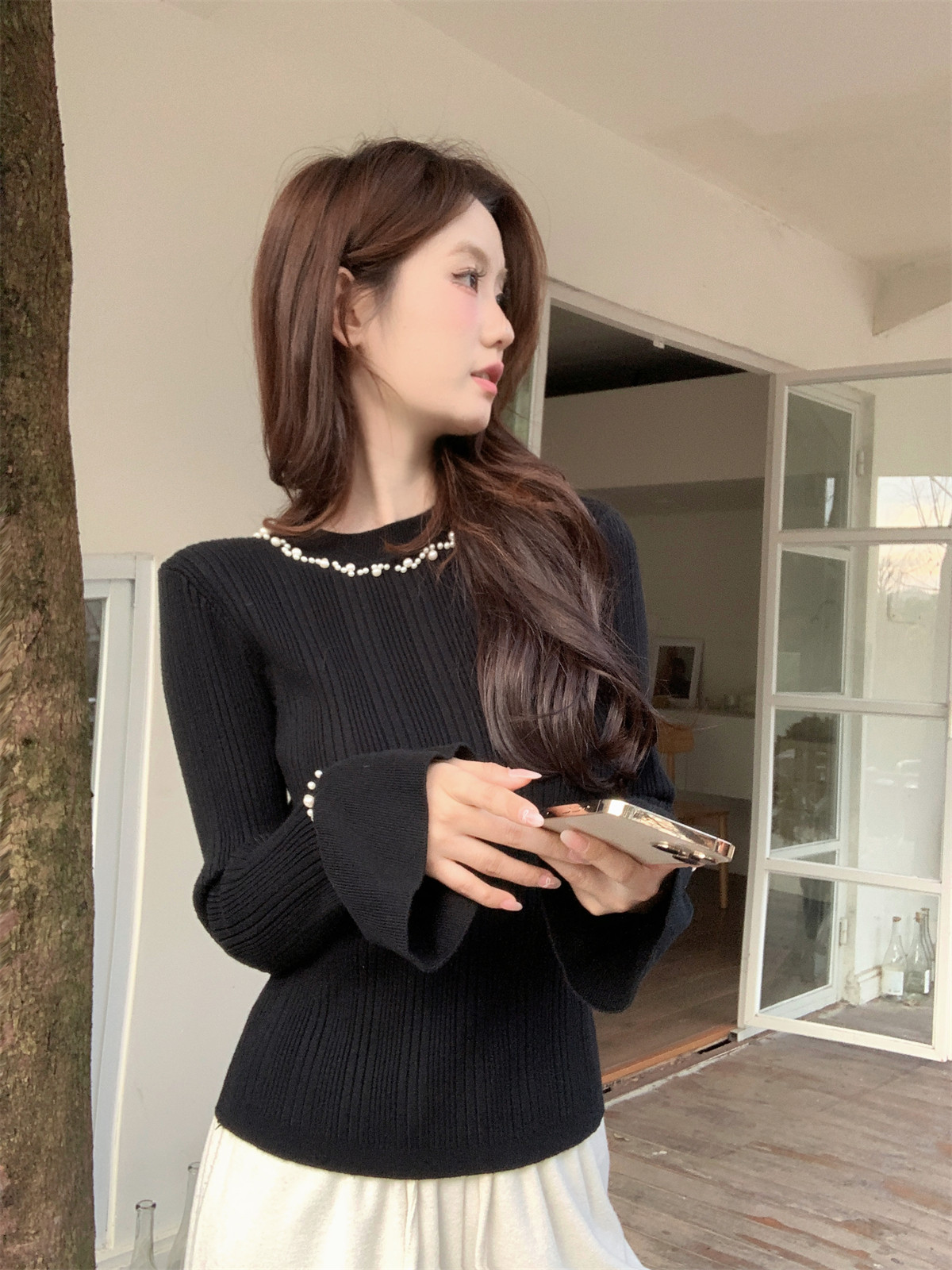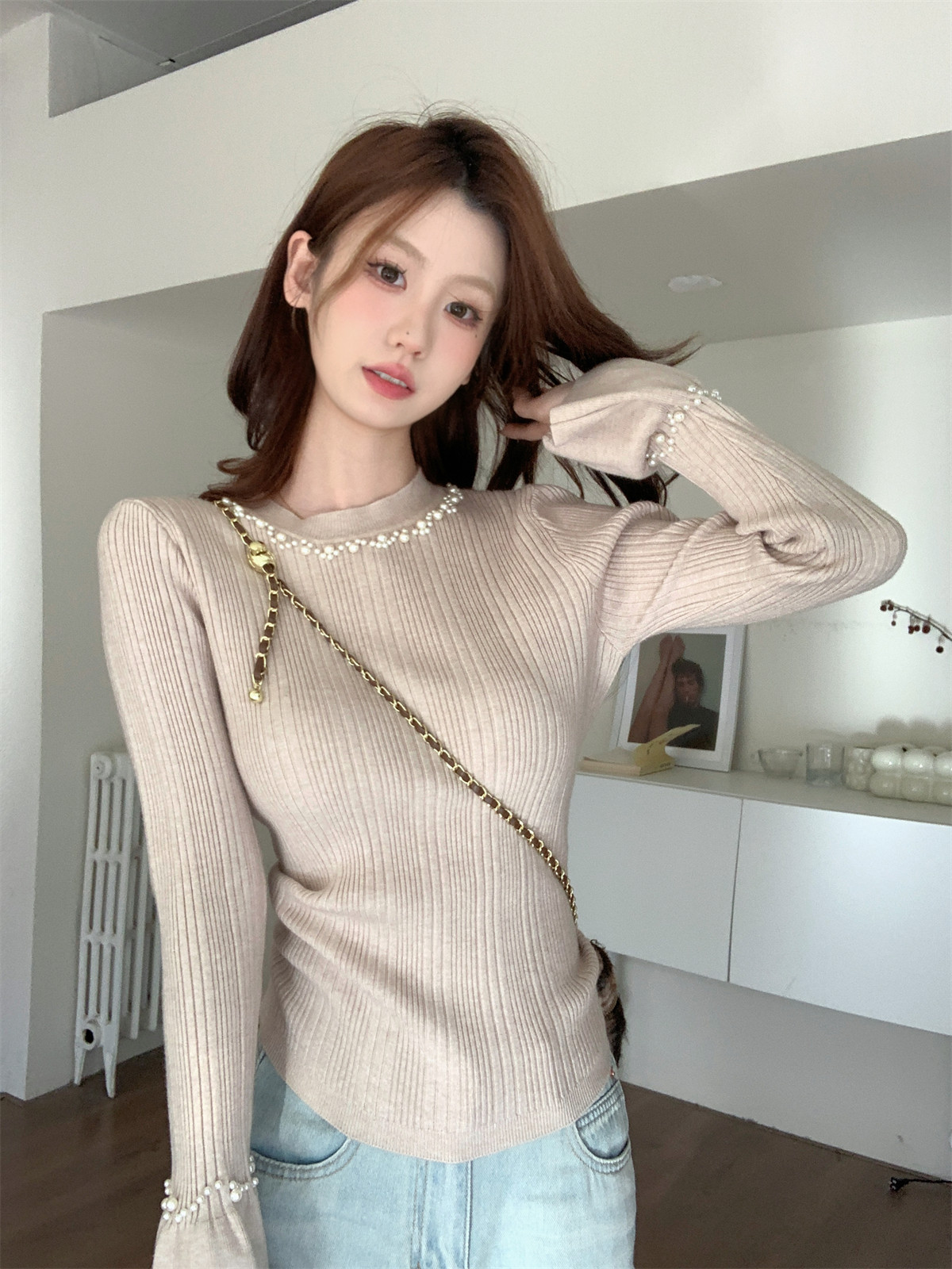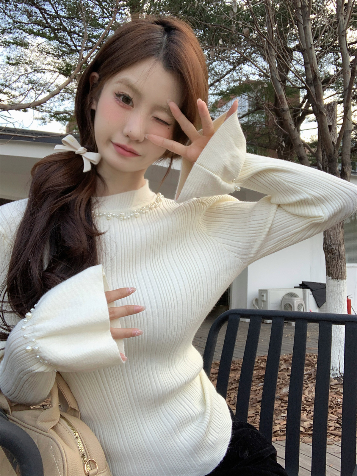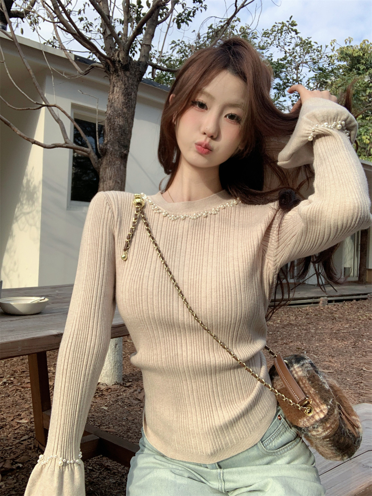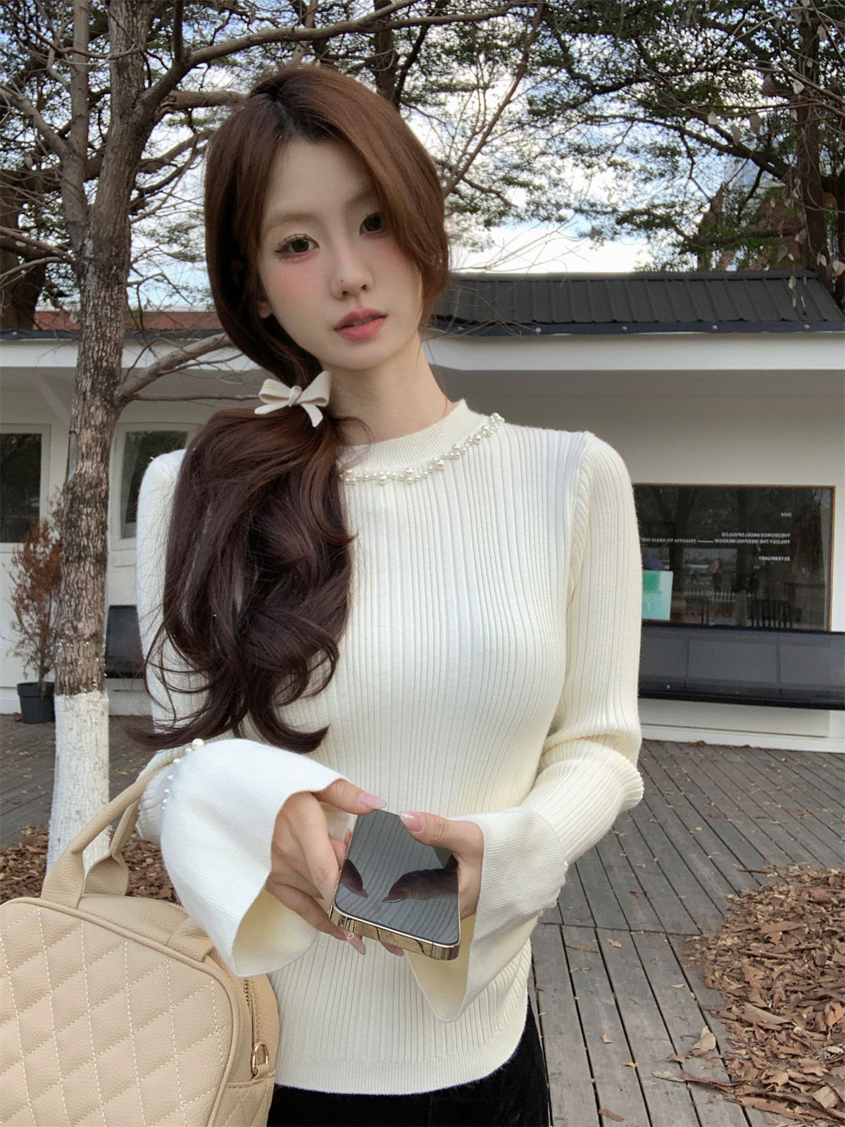 絕美釘珠高級打底衫女秋冬法式喇叭袖針織衫內搭修身毛衣洋氣上衣