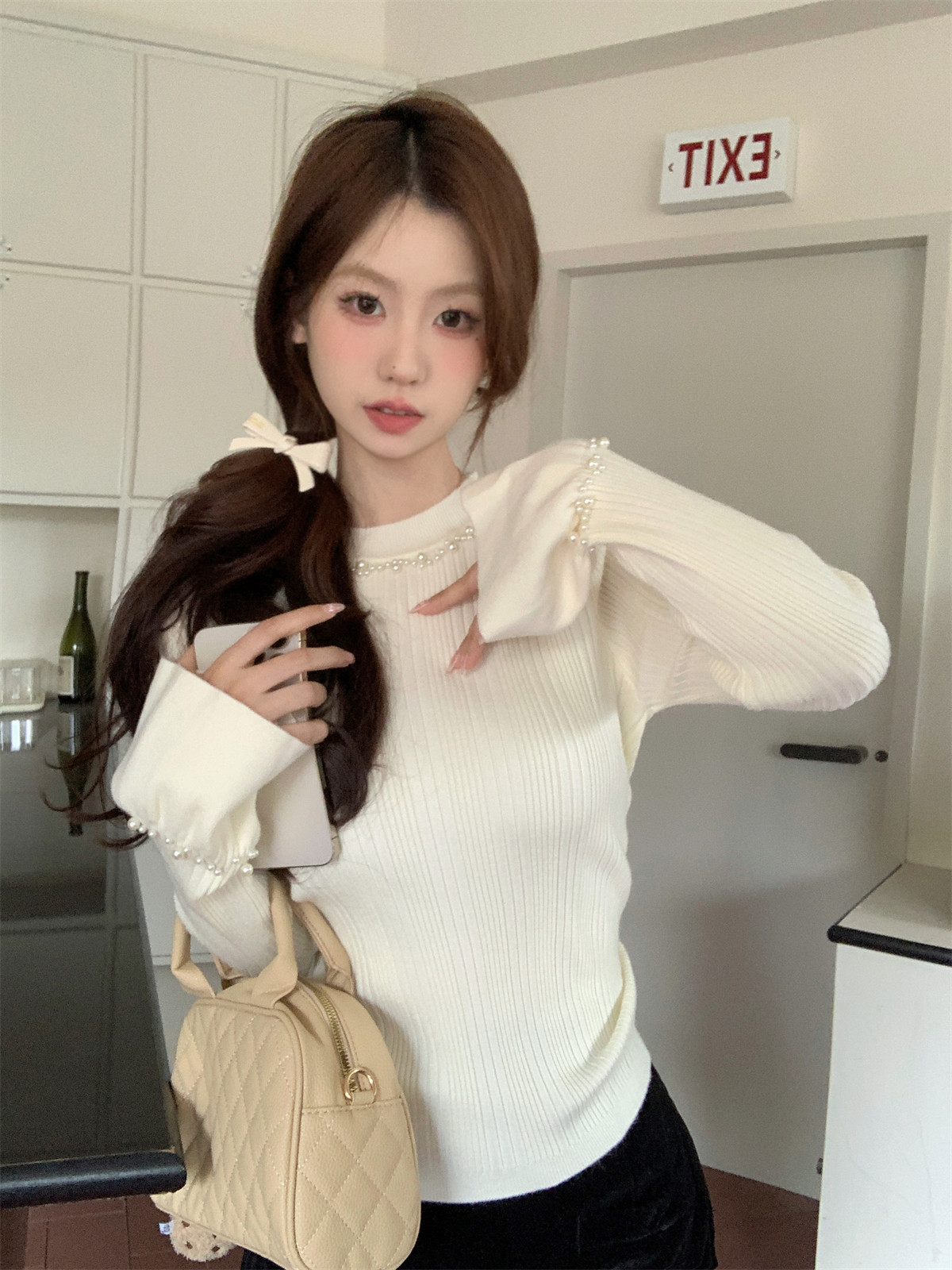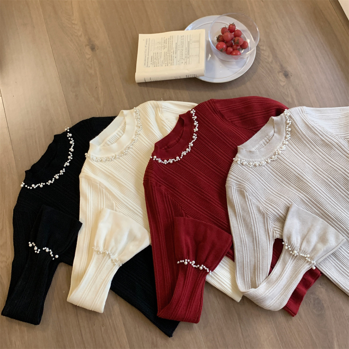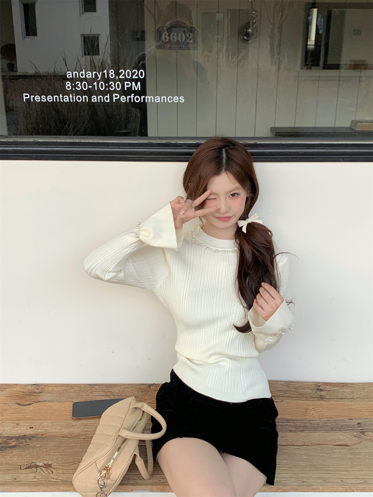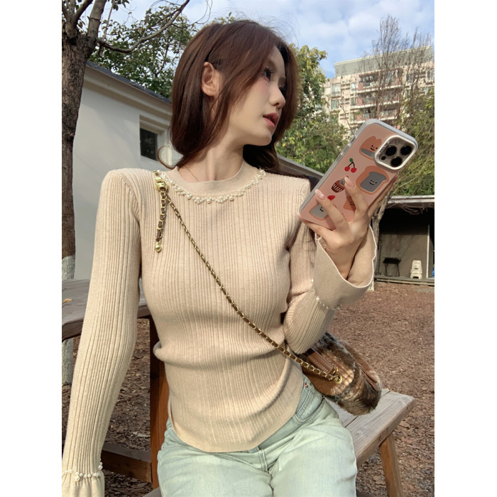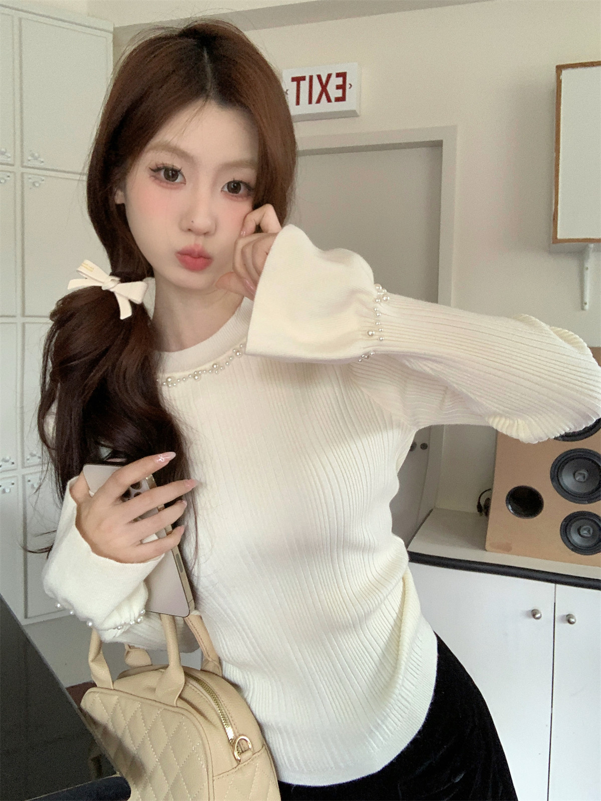 絕美釘珠高級打底衫女秋冬法式喇叭袖針織衫內搭修身毛衣洋氣上衣