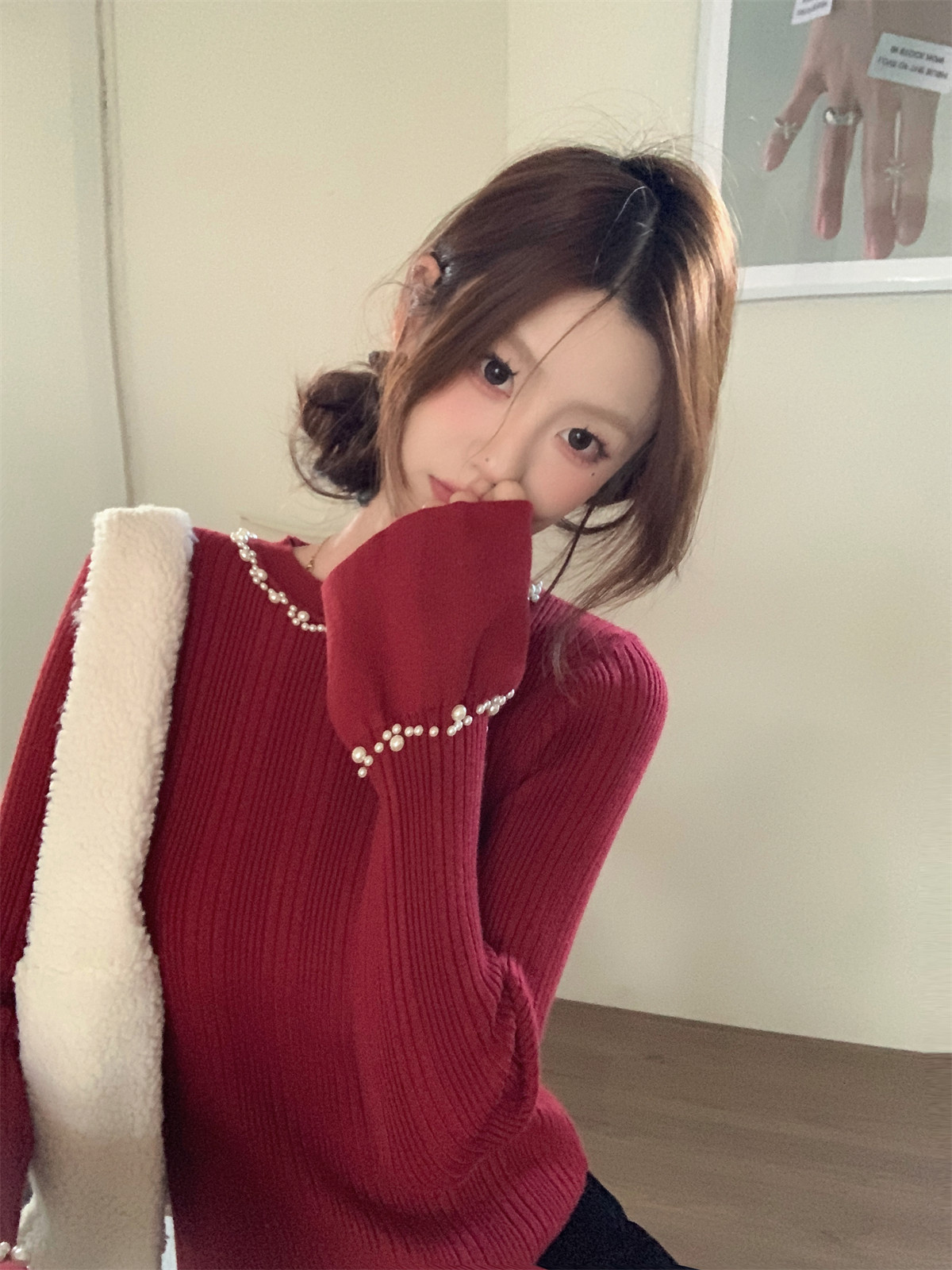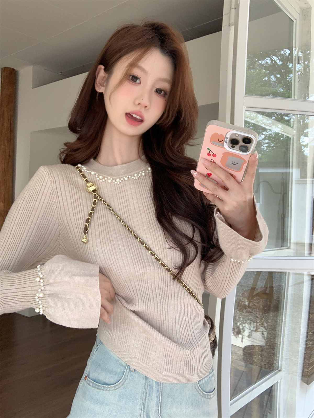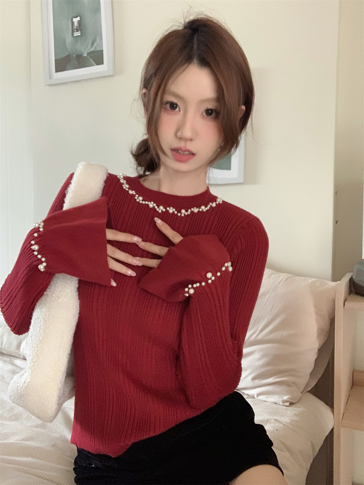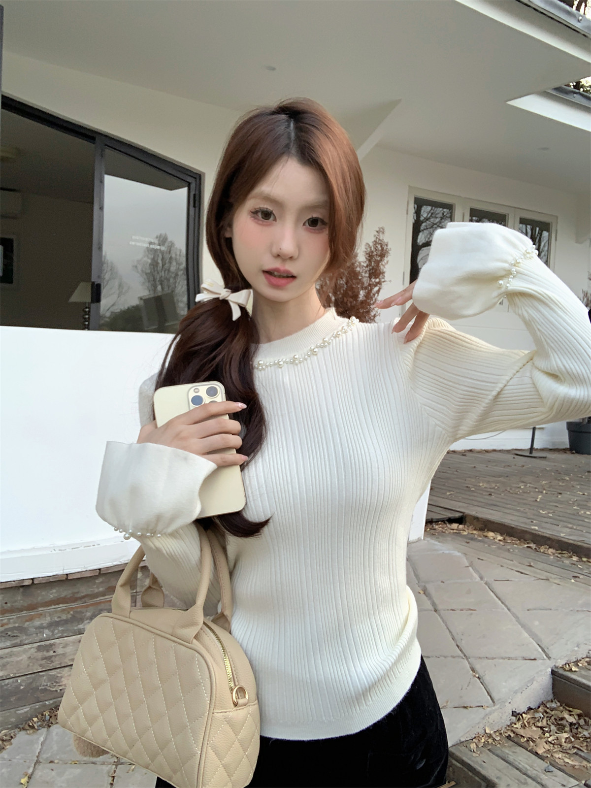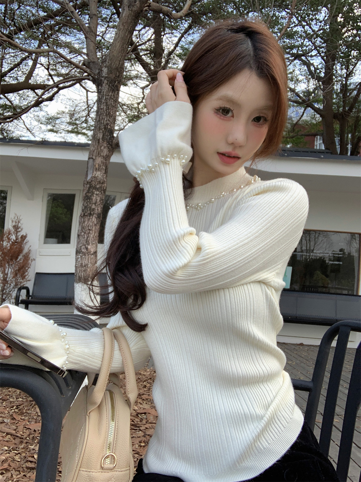 絕美釘珠高級打底衫女秋冬法式喇叭袖針織衫內搭修身毛衣洋氣上衣