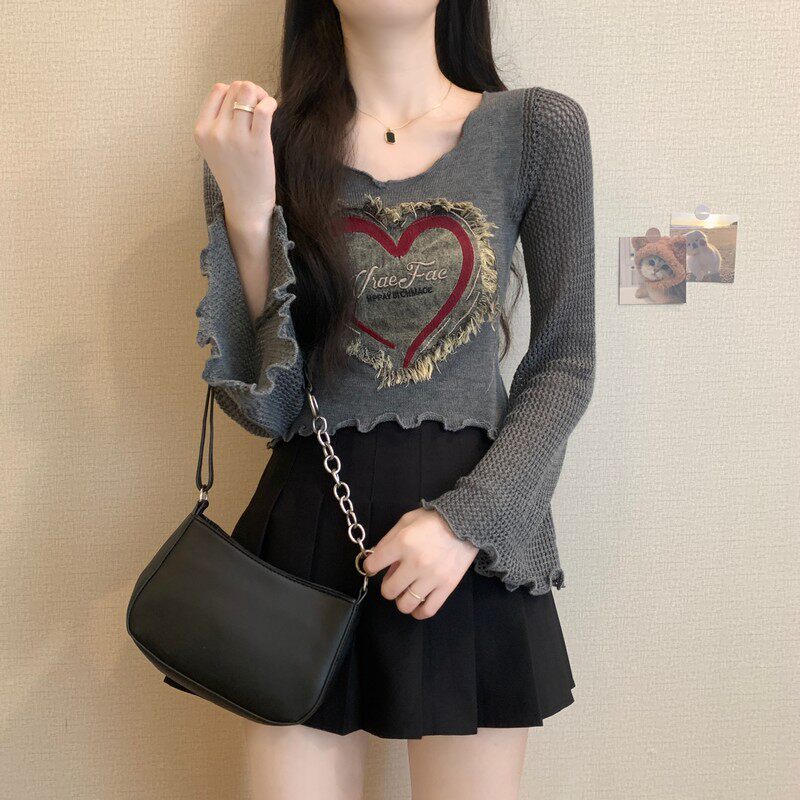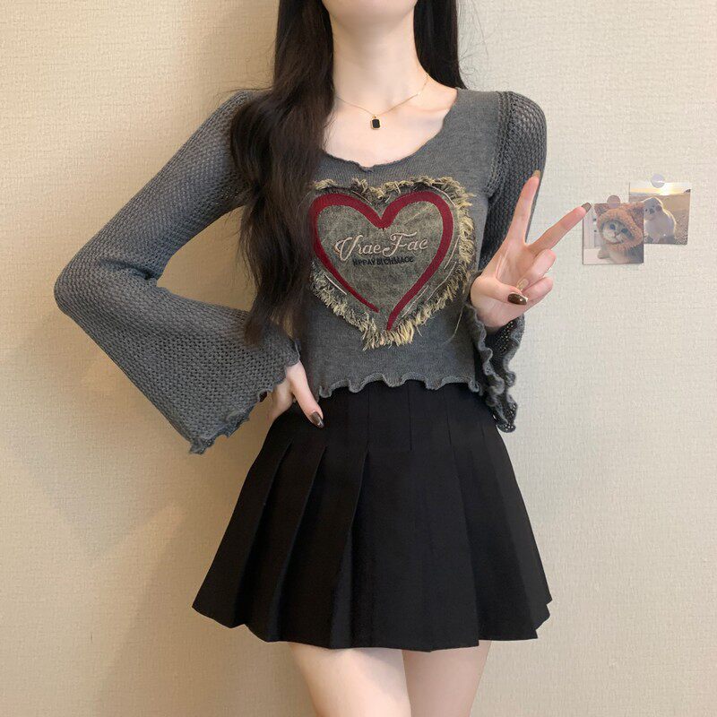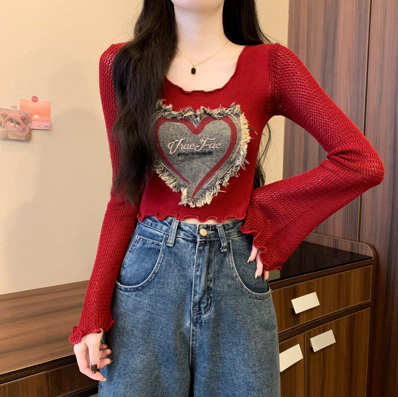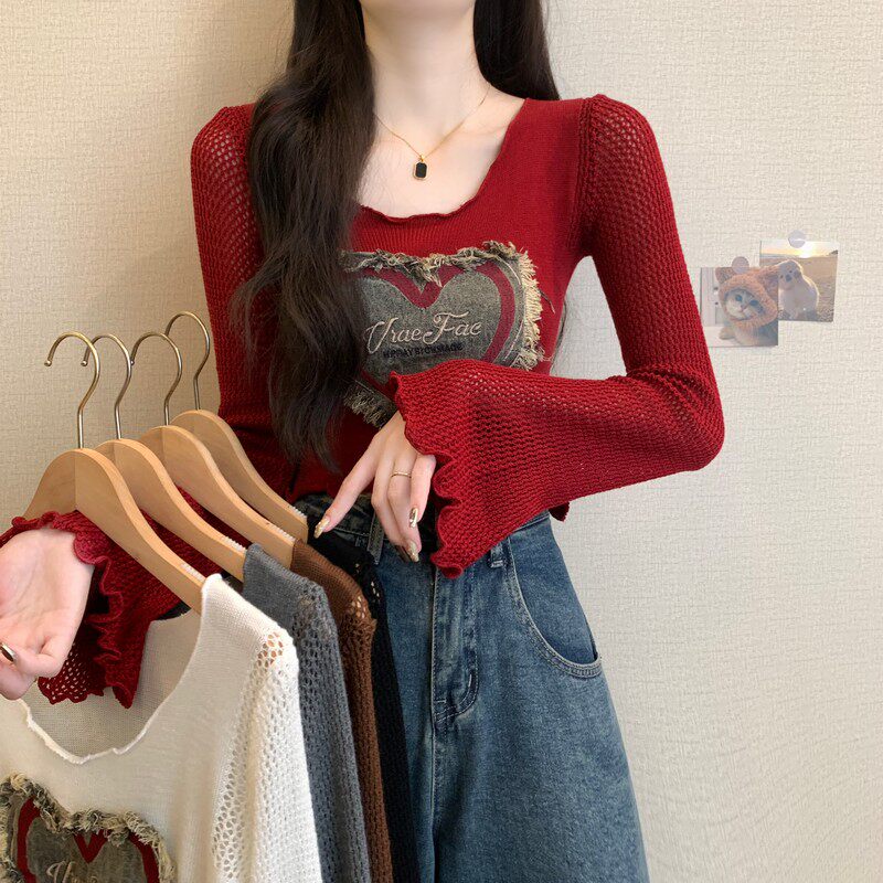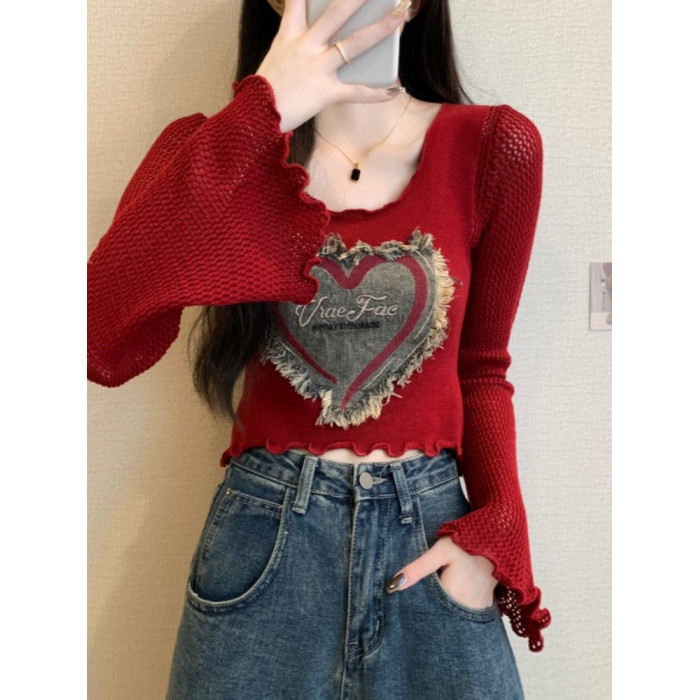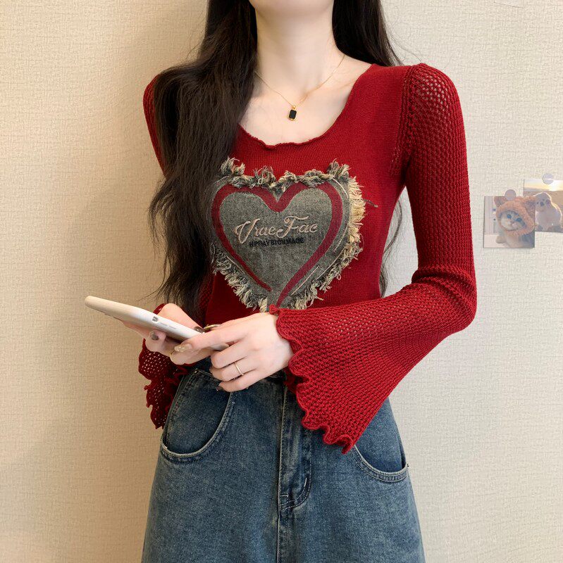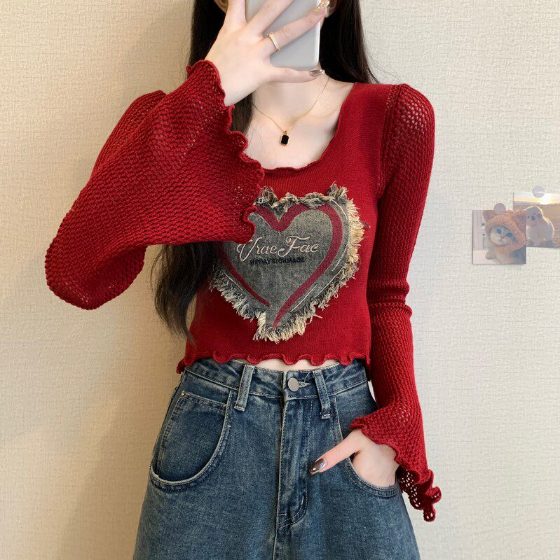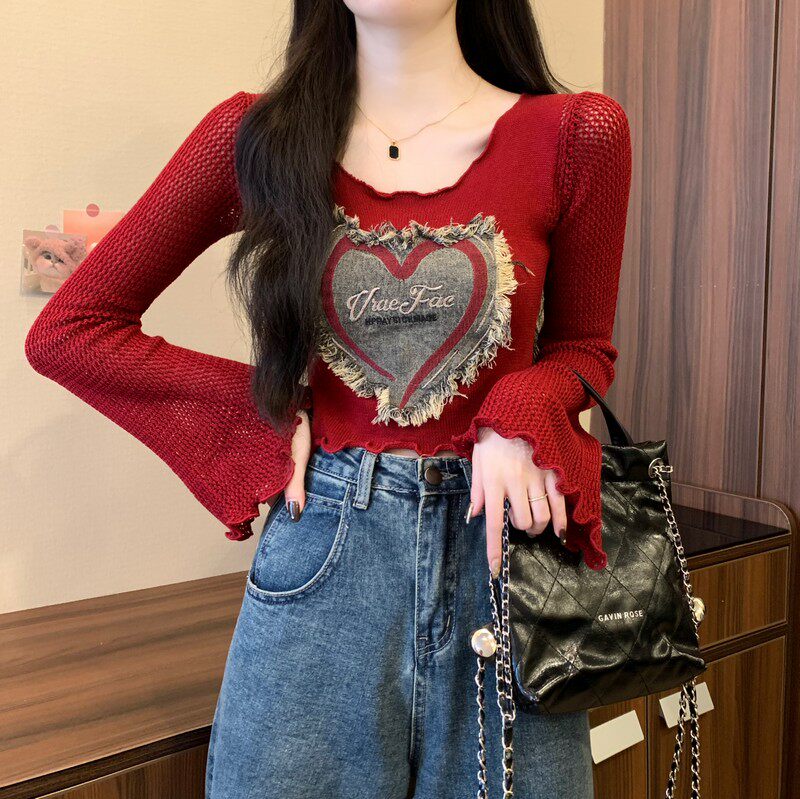 安哥拉紅V領針織打底衫女秋冬露膚穿搭短款喇叭長袖大郎毛衣上衣