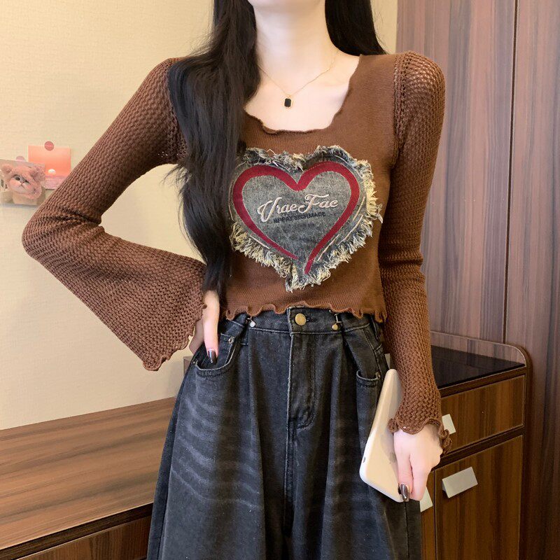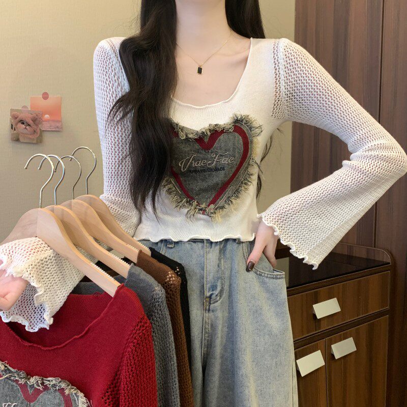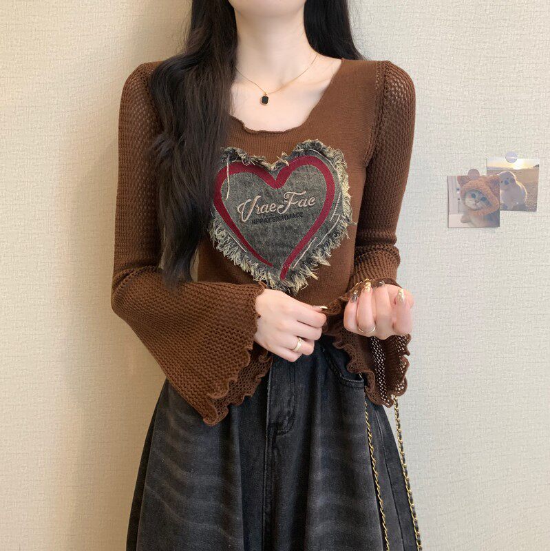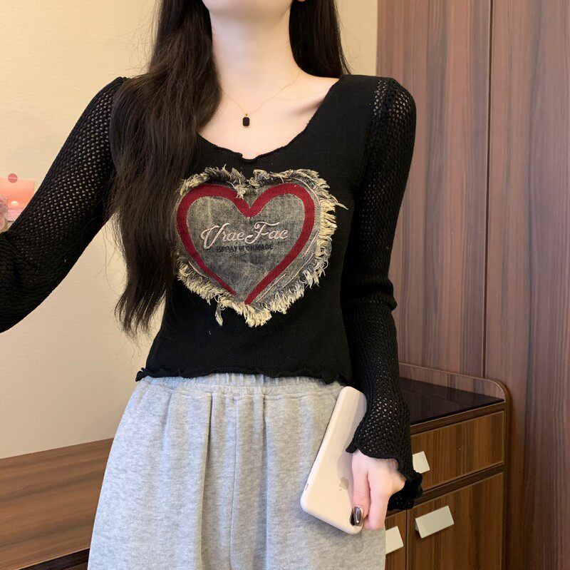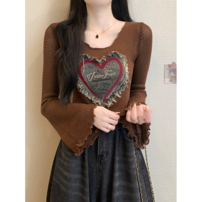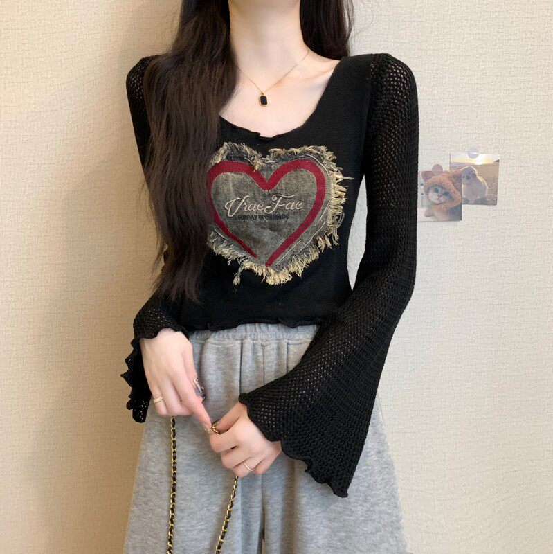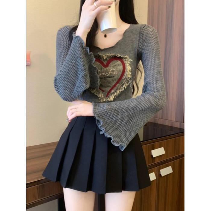 安哥拉紅V領針織打底衫女秋冬露膚穿搭短款喇叭長袖大郎毛衣上衣