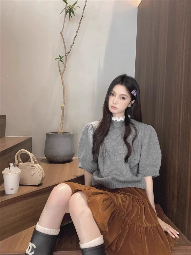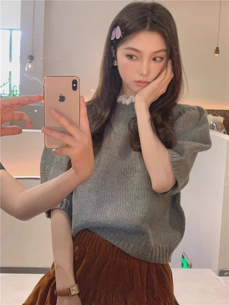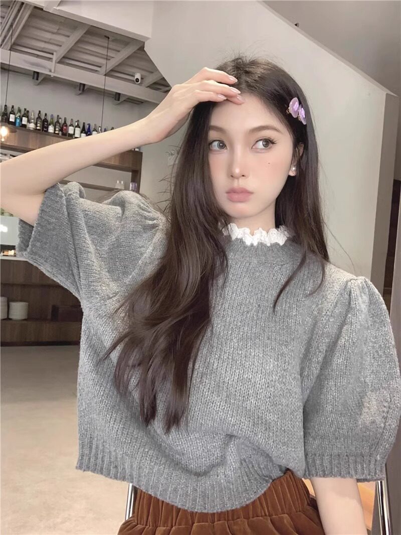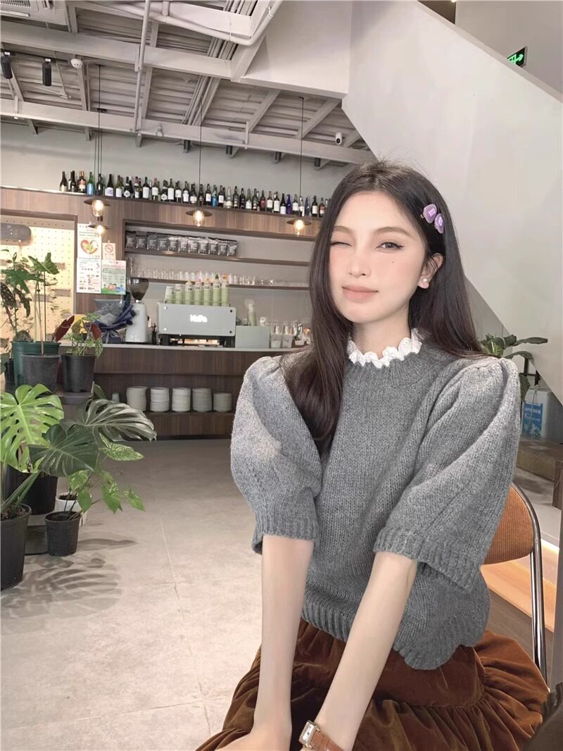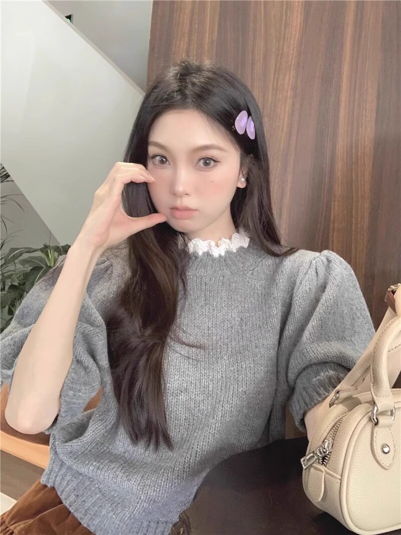 蕾絲邊半高領針織衫女設計感小衆春秋泡泡袖純欲上衣內搭短袖毛衣