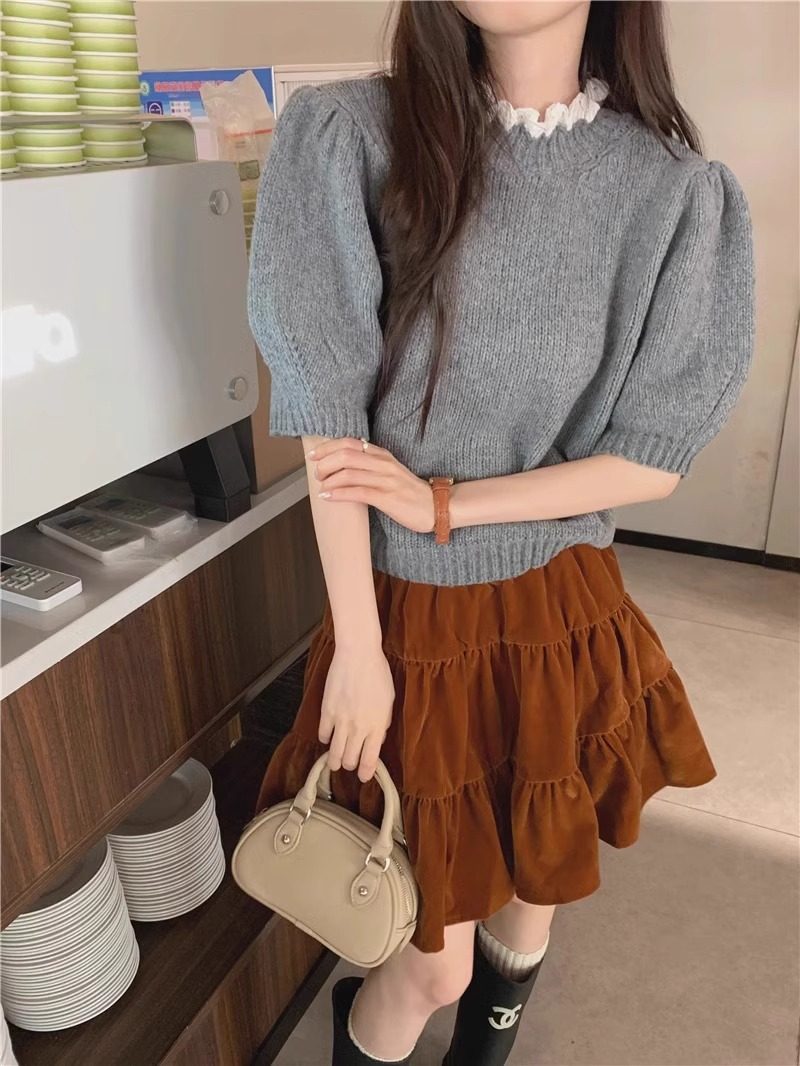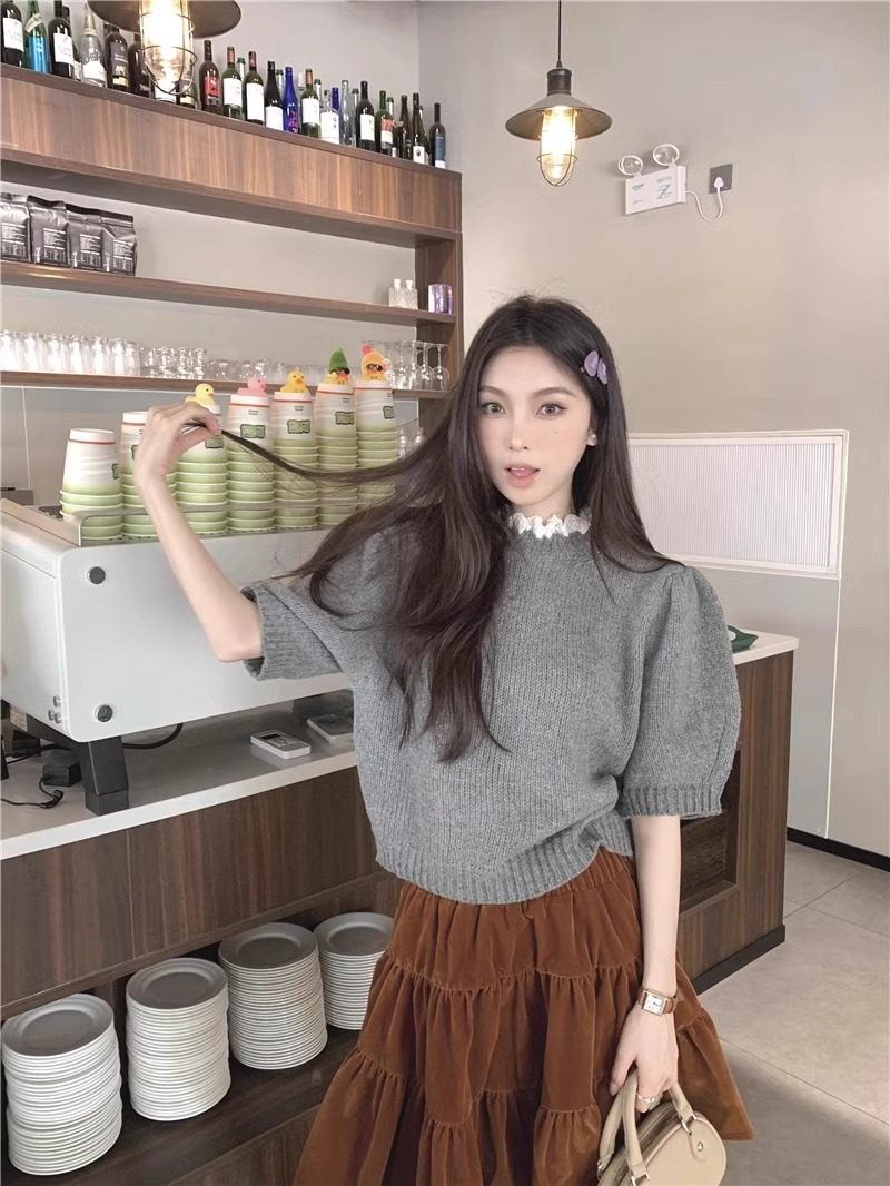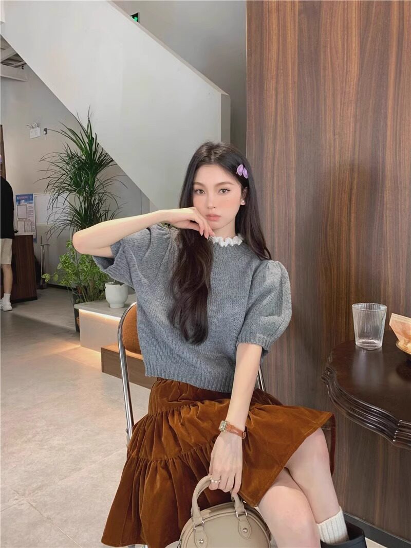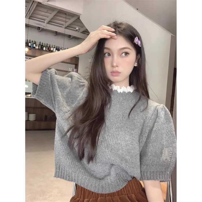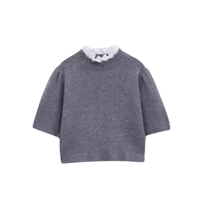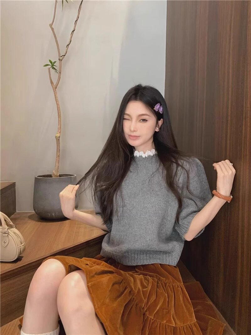 蕾絲邊半高領針織衫女設計感小衆春秋泡泡袖純欲上衣內搭短袖毛衣