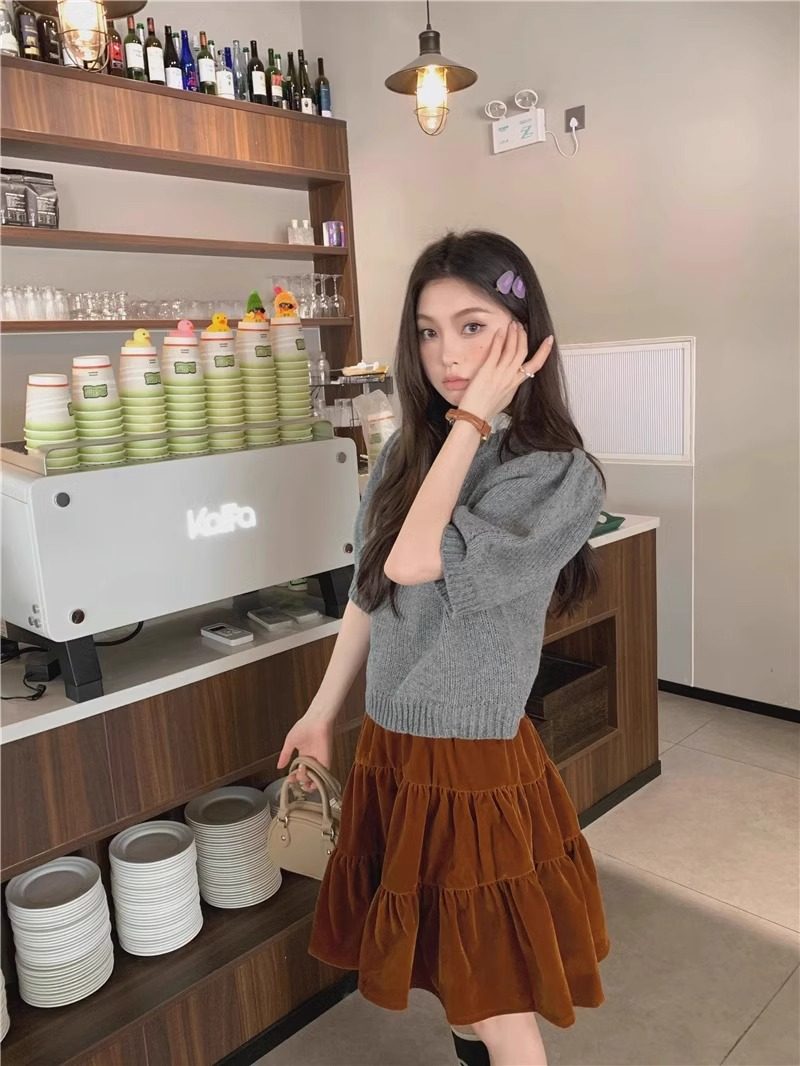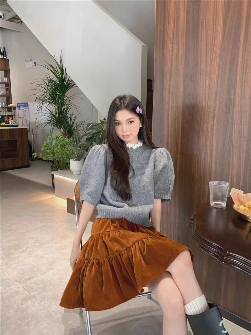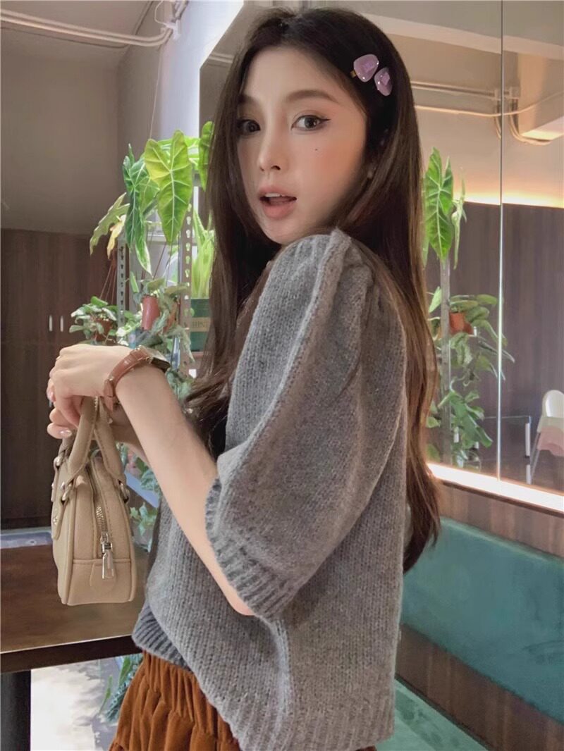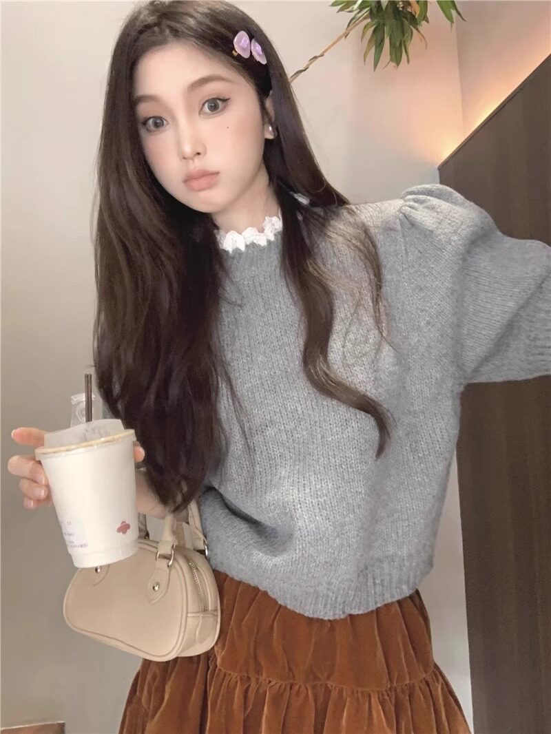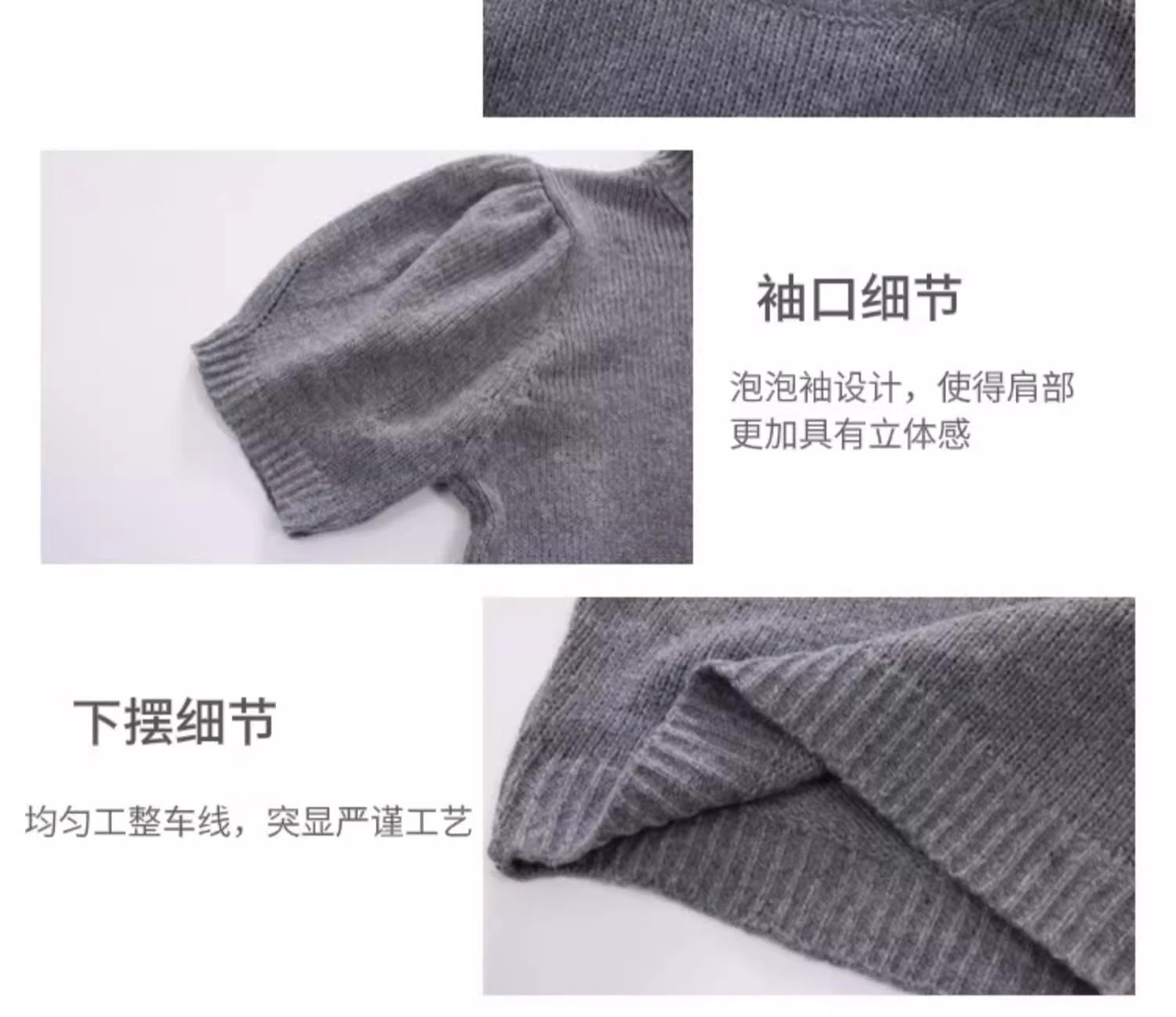 蕾絲邊半高領針織衫女設計感小衆春秋泡泡袖純欲上衣內搭短袖毛衣