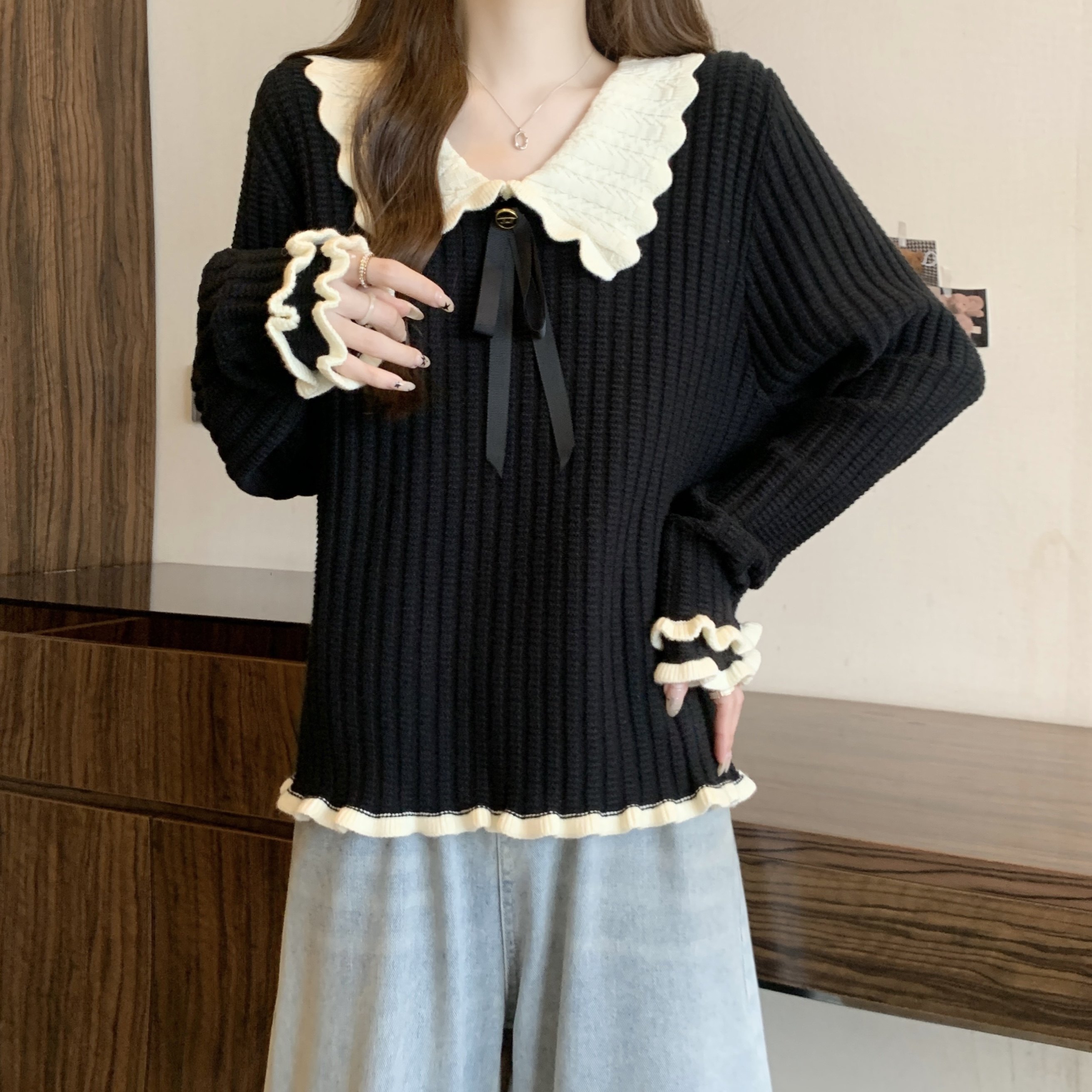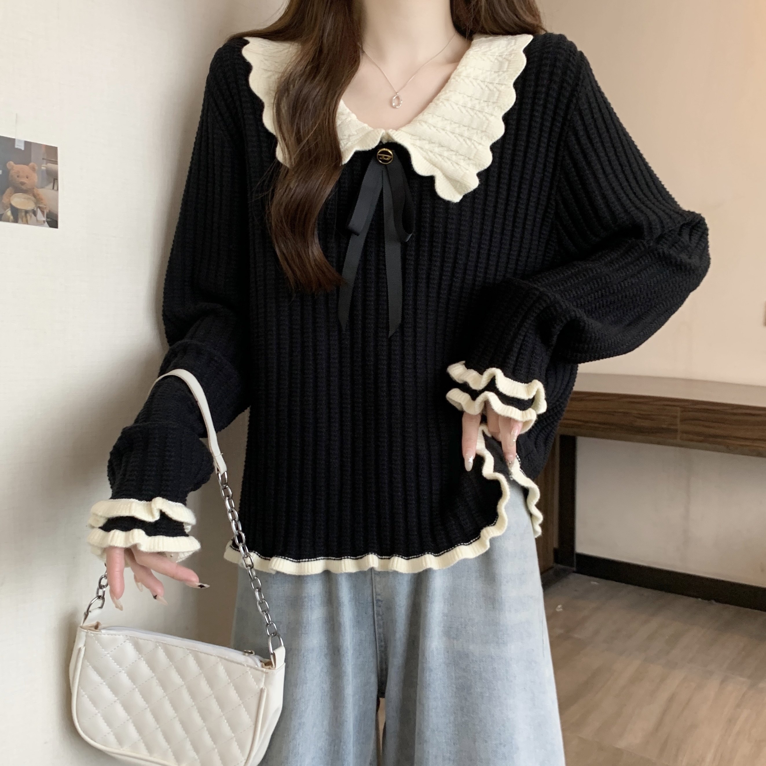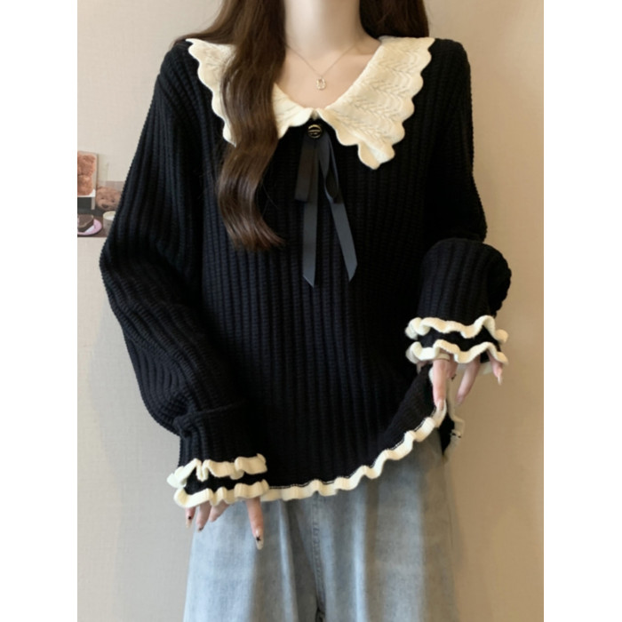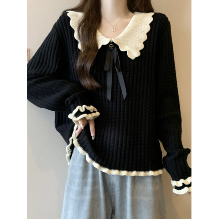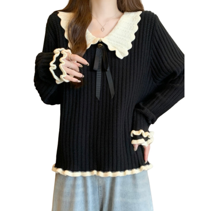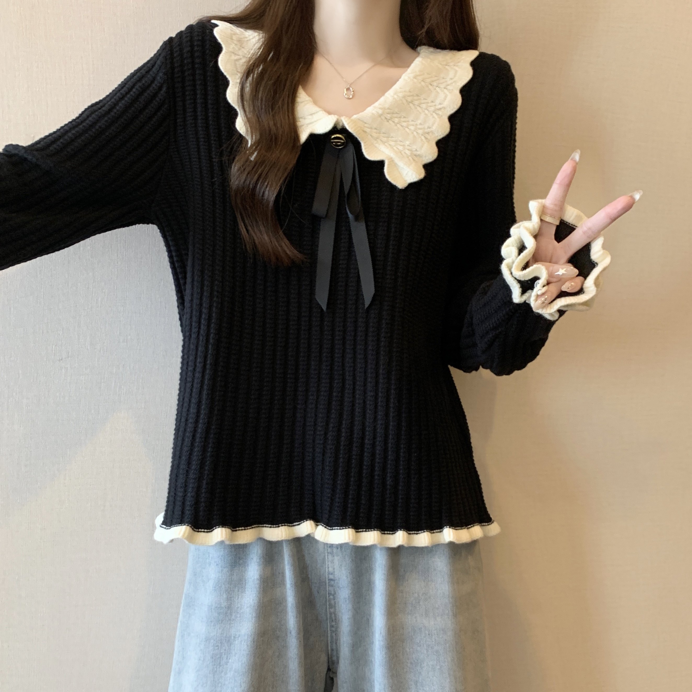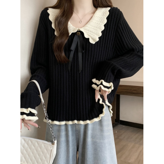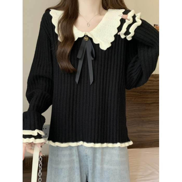 大碼設計感撞色娃娃領針織衫長袖女秋冬胖MM寬松顯瘦內搭打底上衣