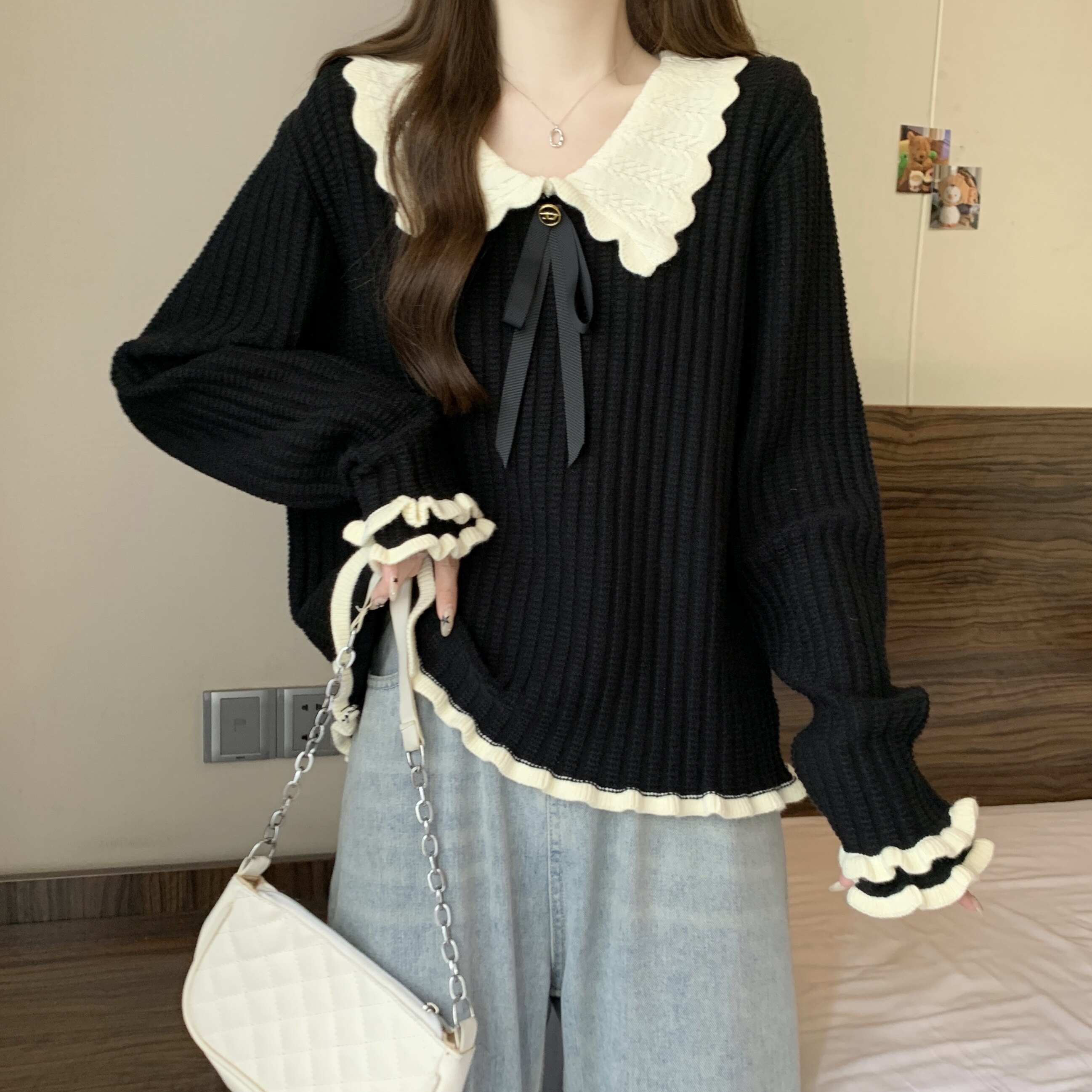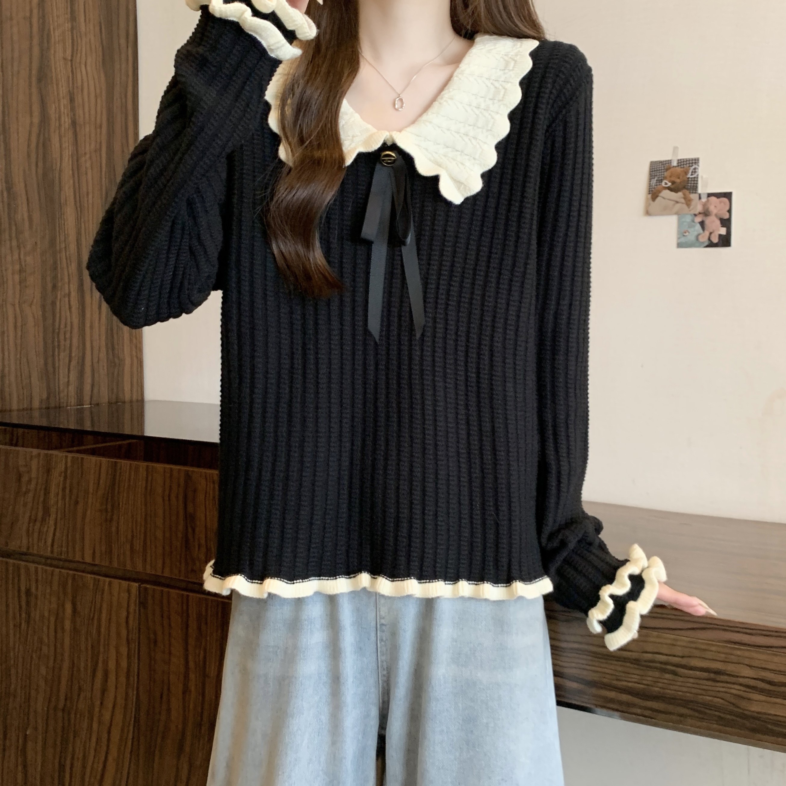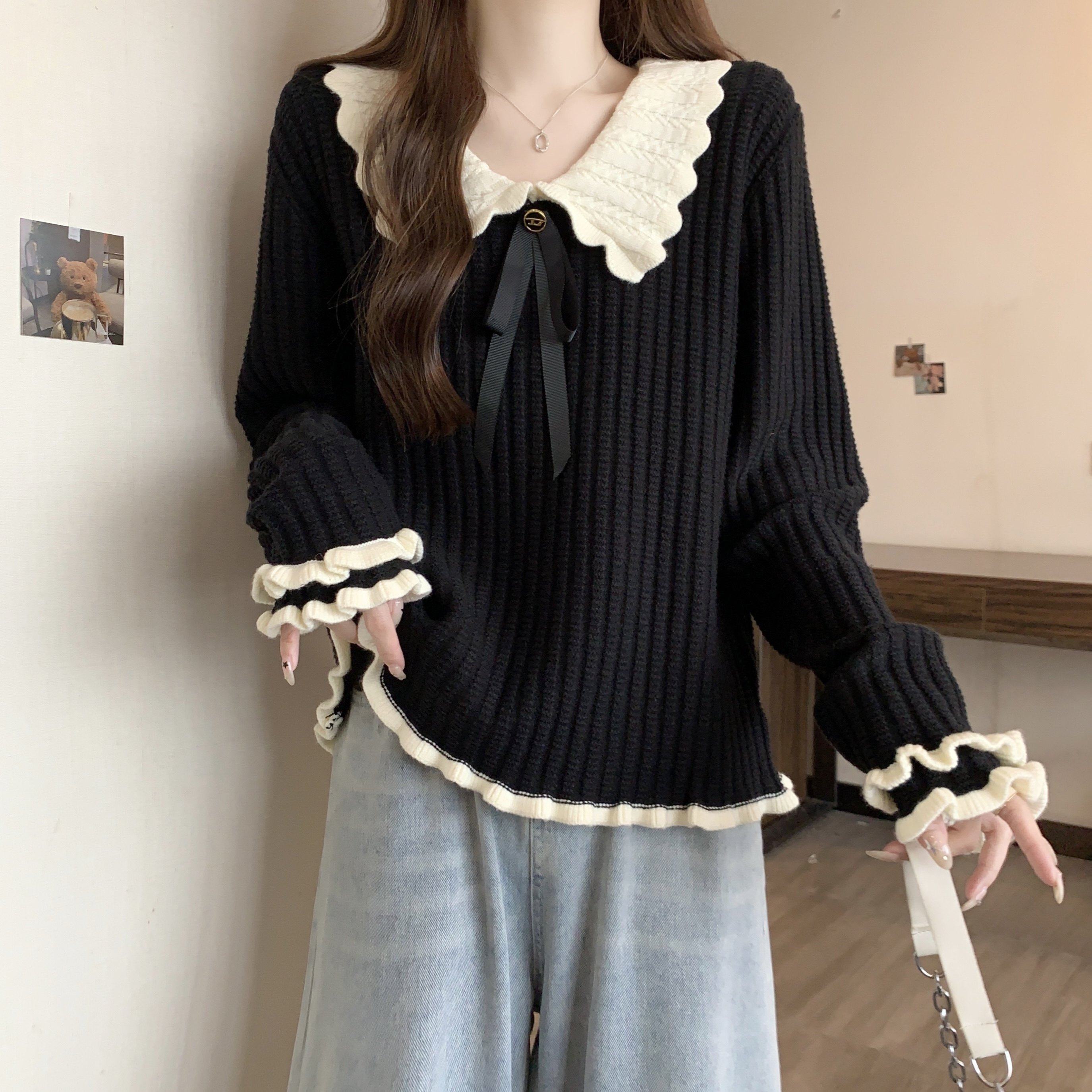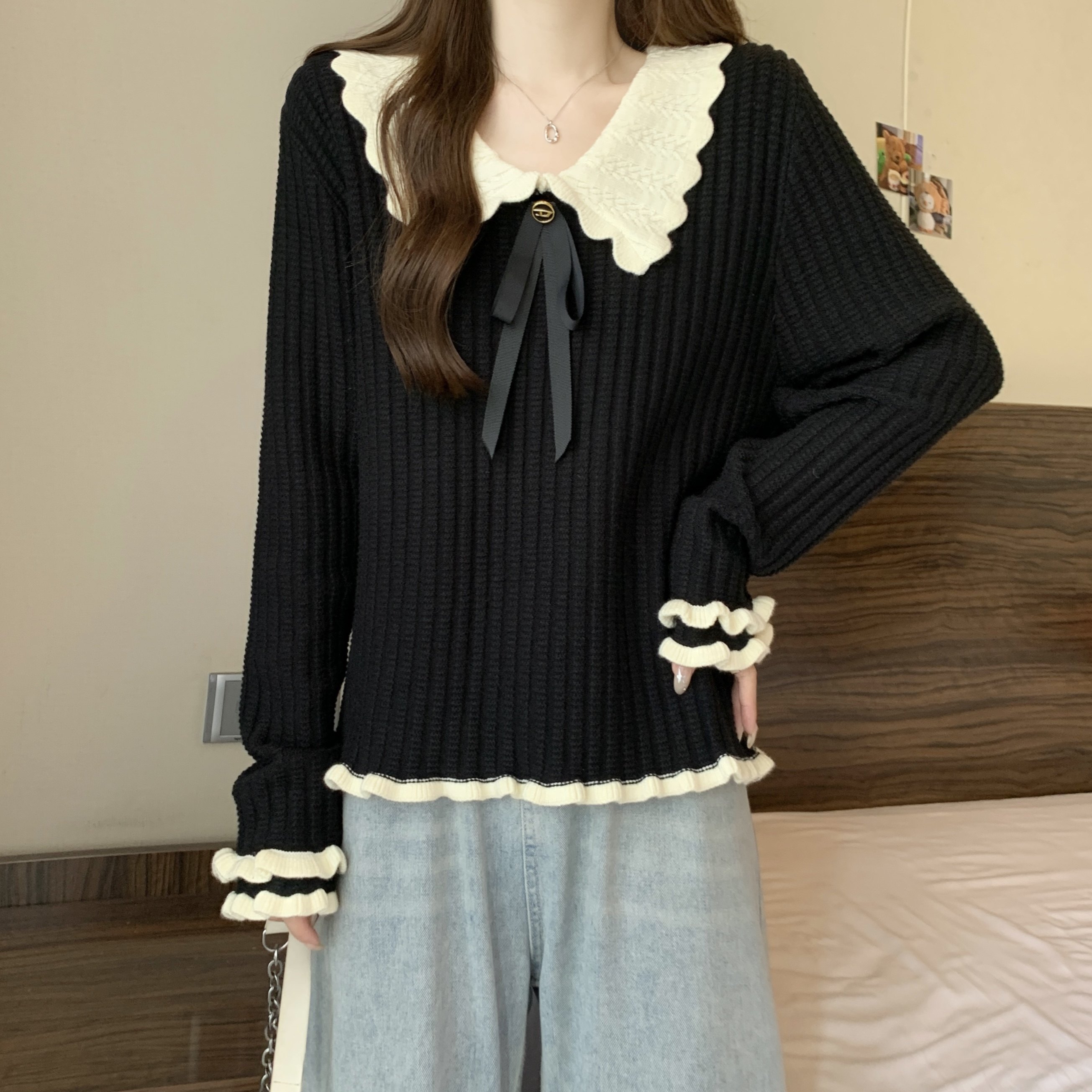 大碼設計感撞色娃娃領針織衫長袖女秋冬胖MM寬松顯瘦內搭打底上衣