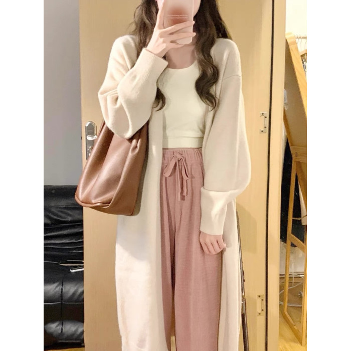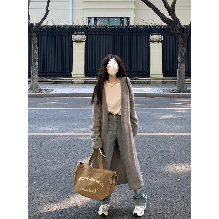 灰色中長款過膝毛衣外套女春秋冬季慵懶風加厚百搭針織衫開衫大衣