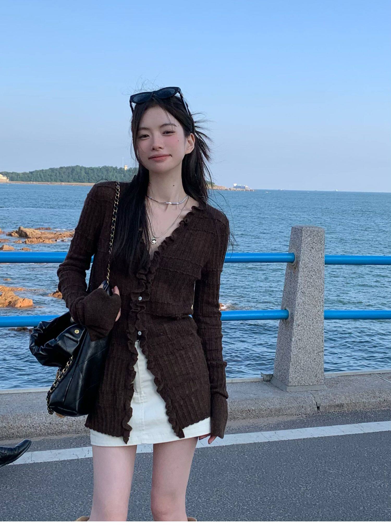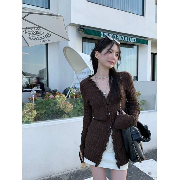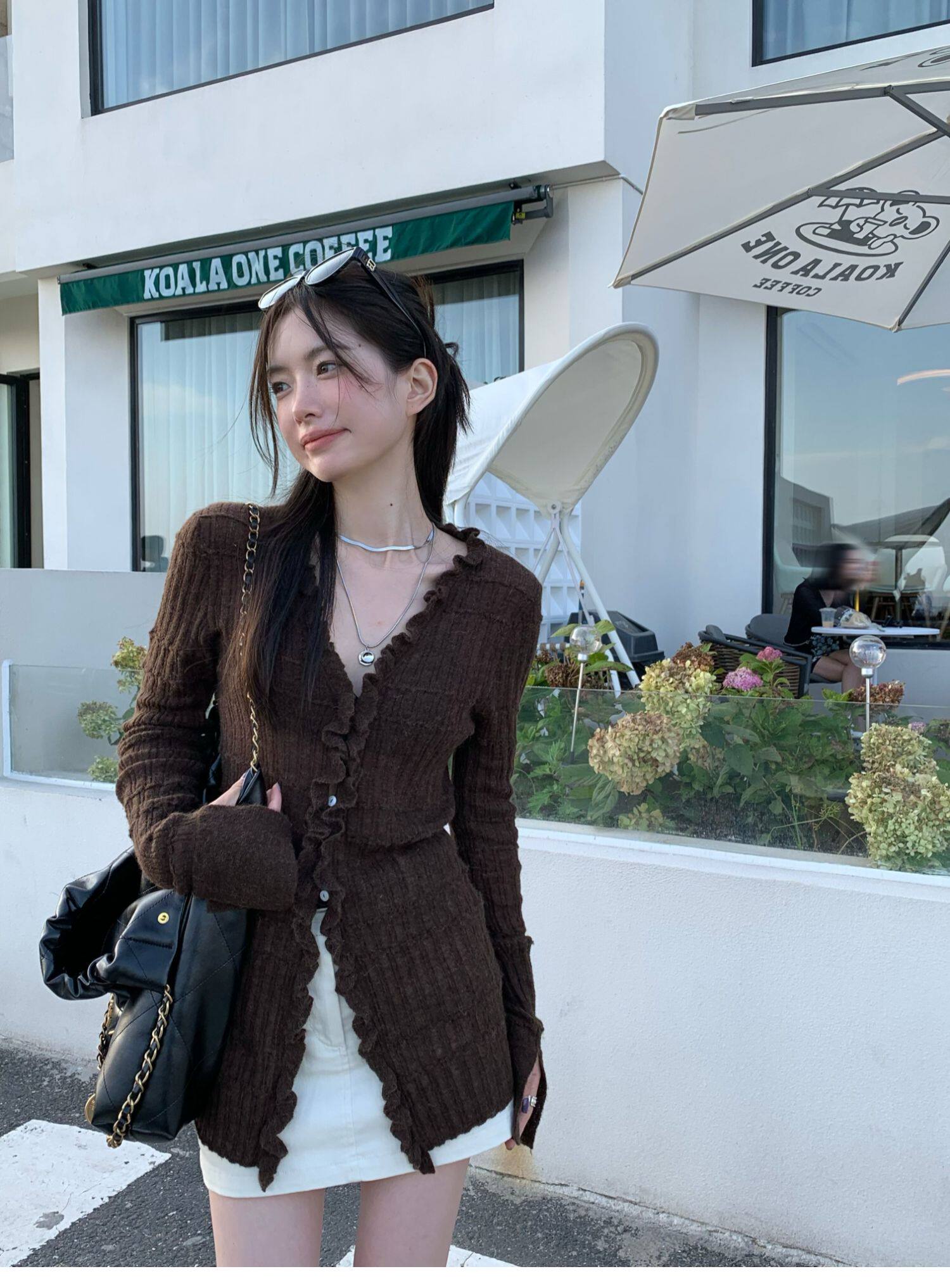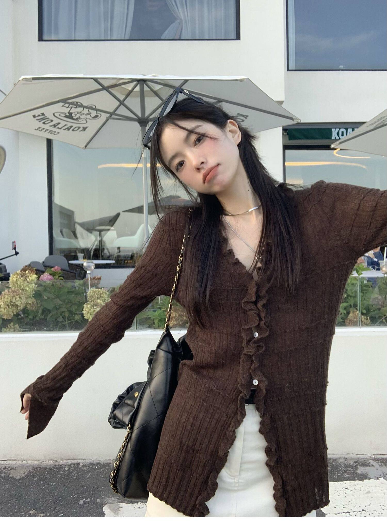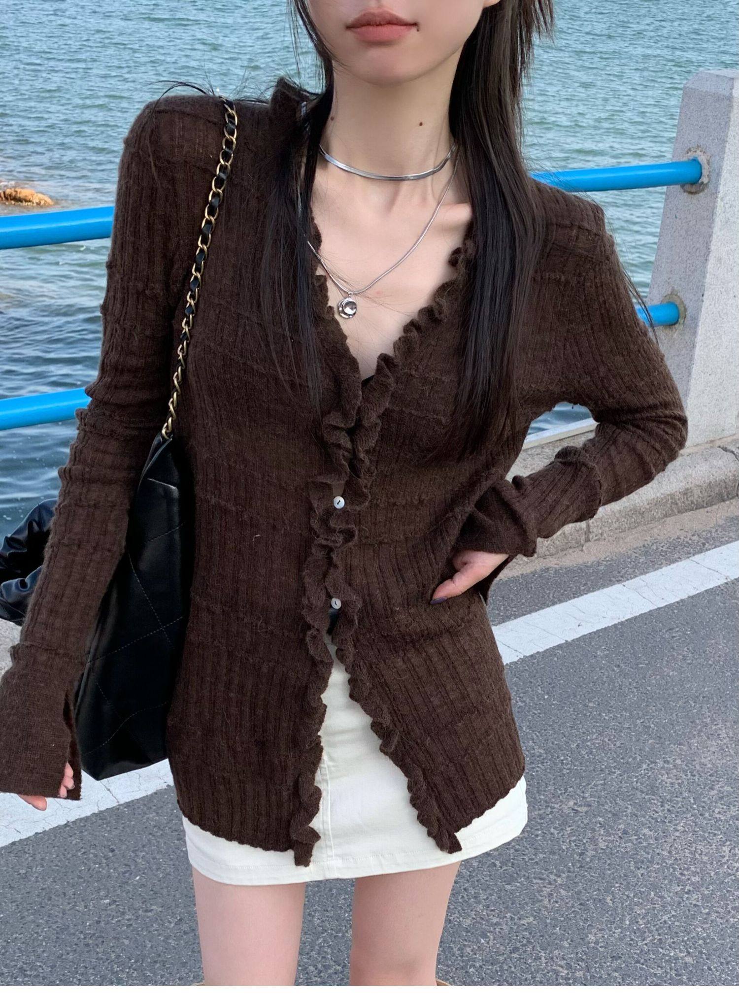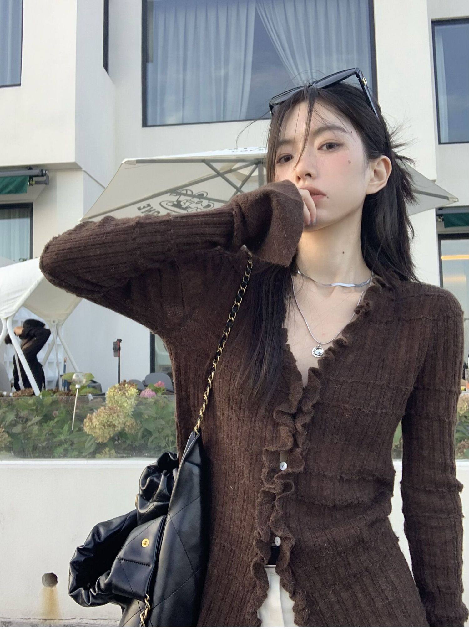 復古木耳邊V領長袖針織開衫女秋季2025新款時尚百搭修身咖色上衣
