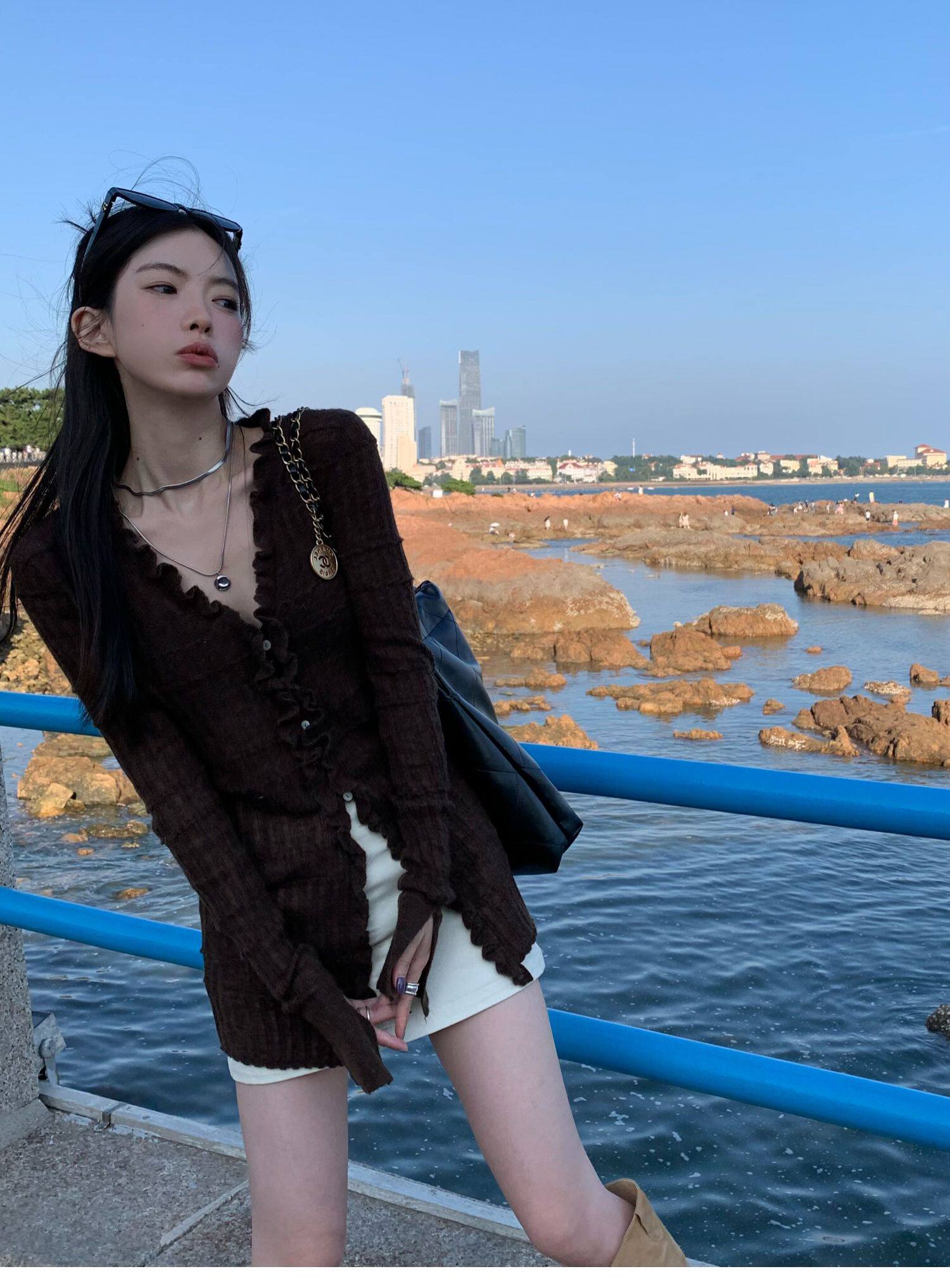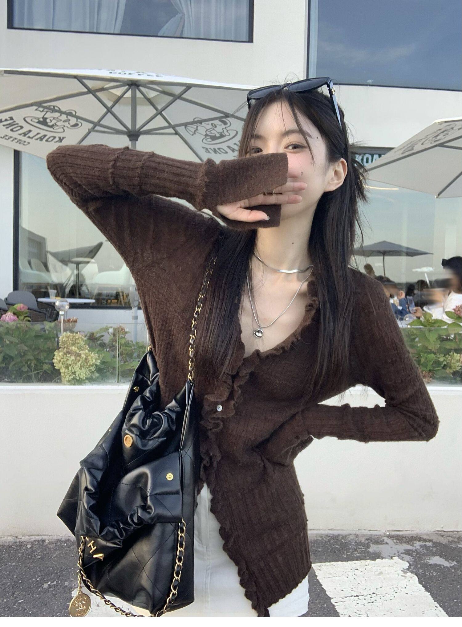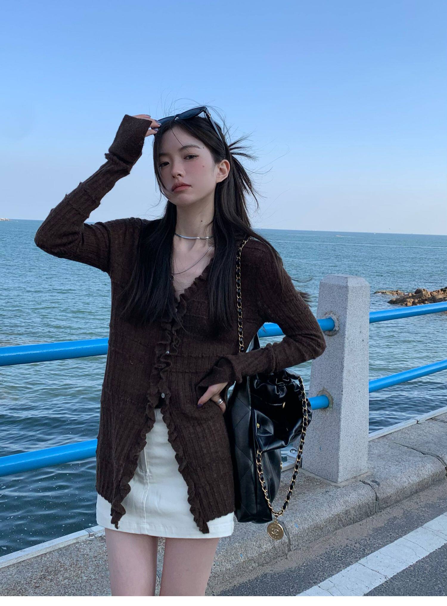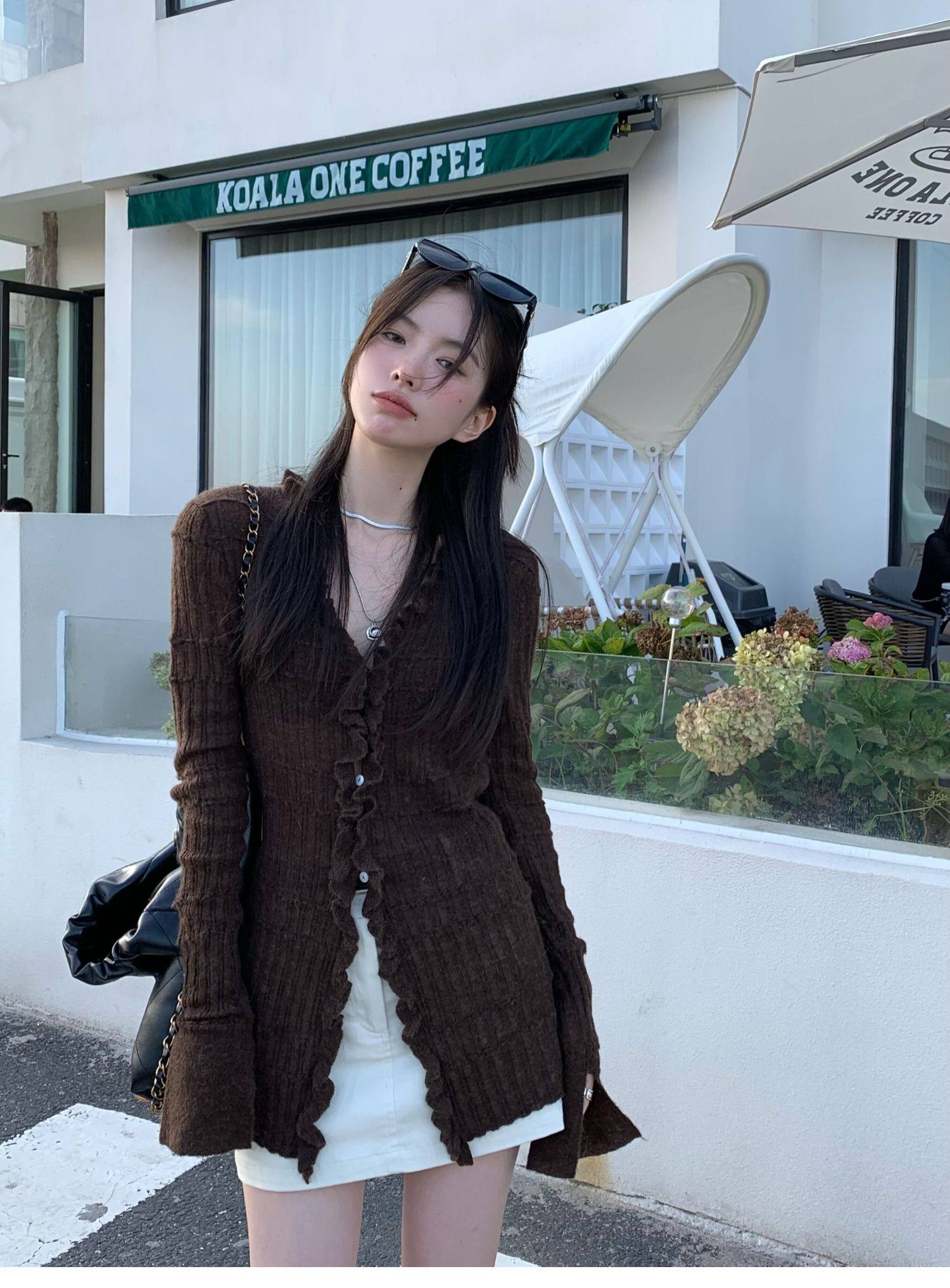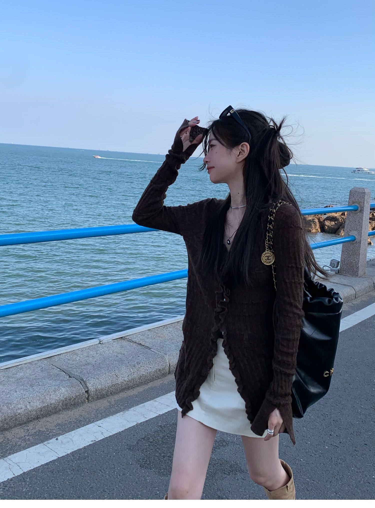 復古木耳邊V領長袖針織開衫女秋季2025新款時尚百搭修身咖色上衣
