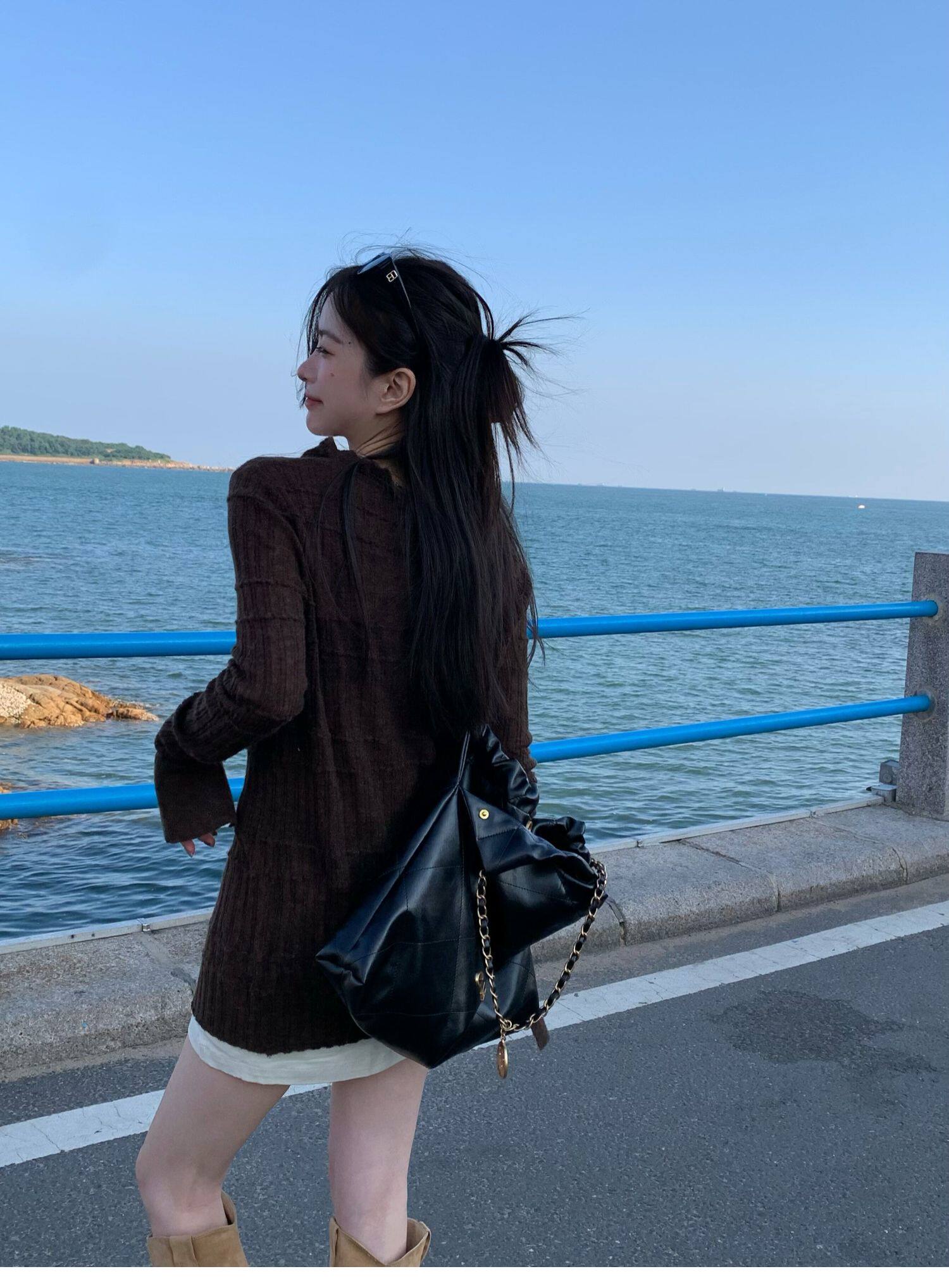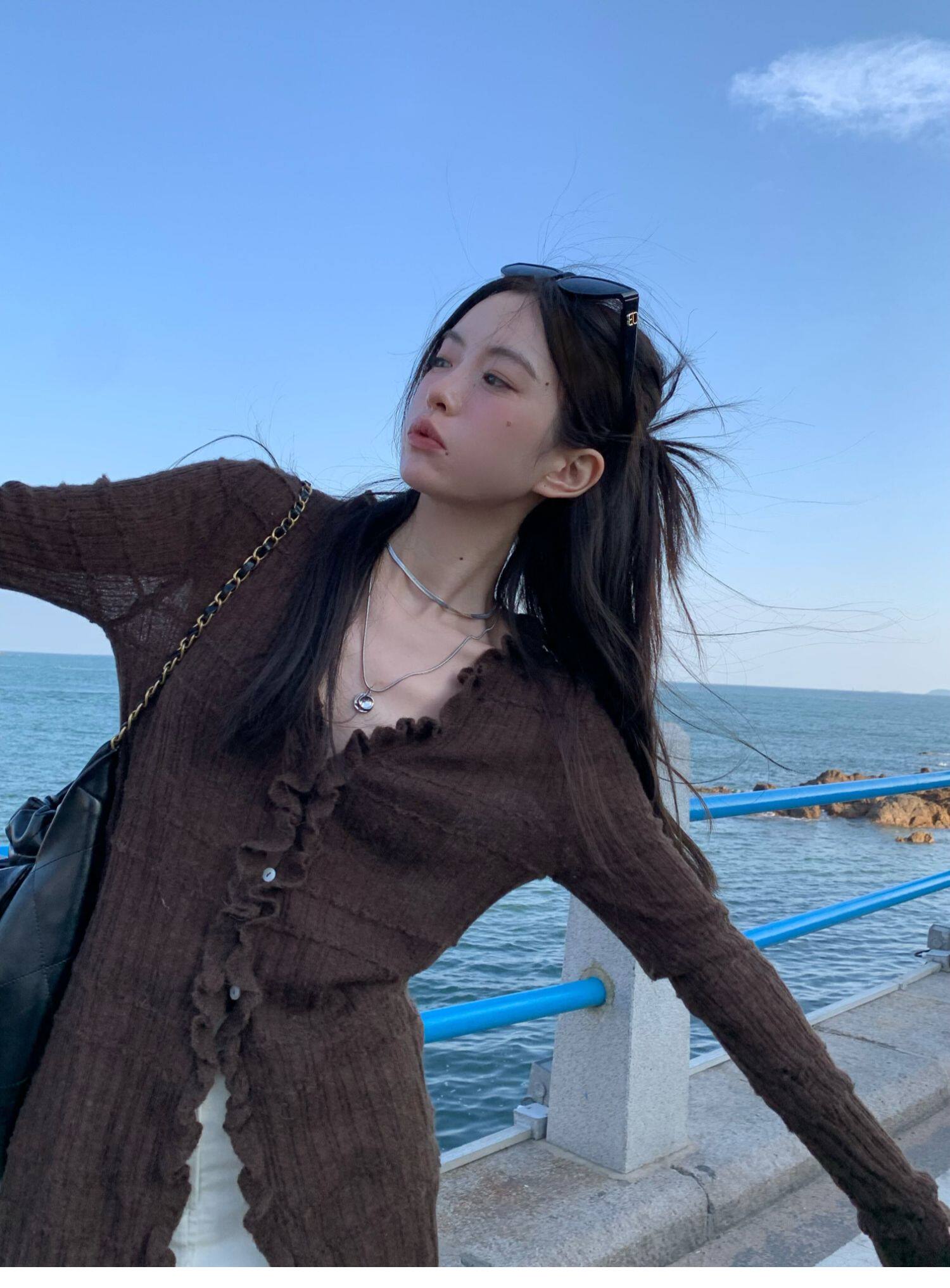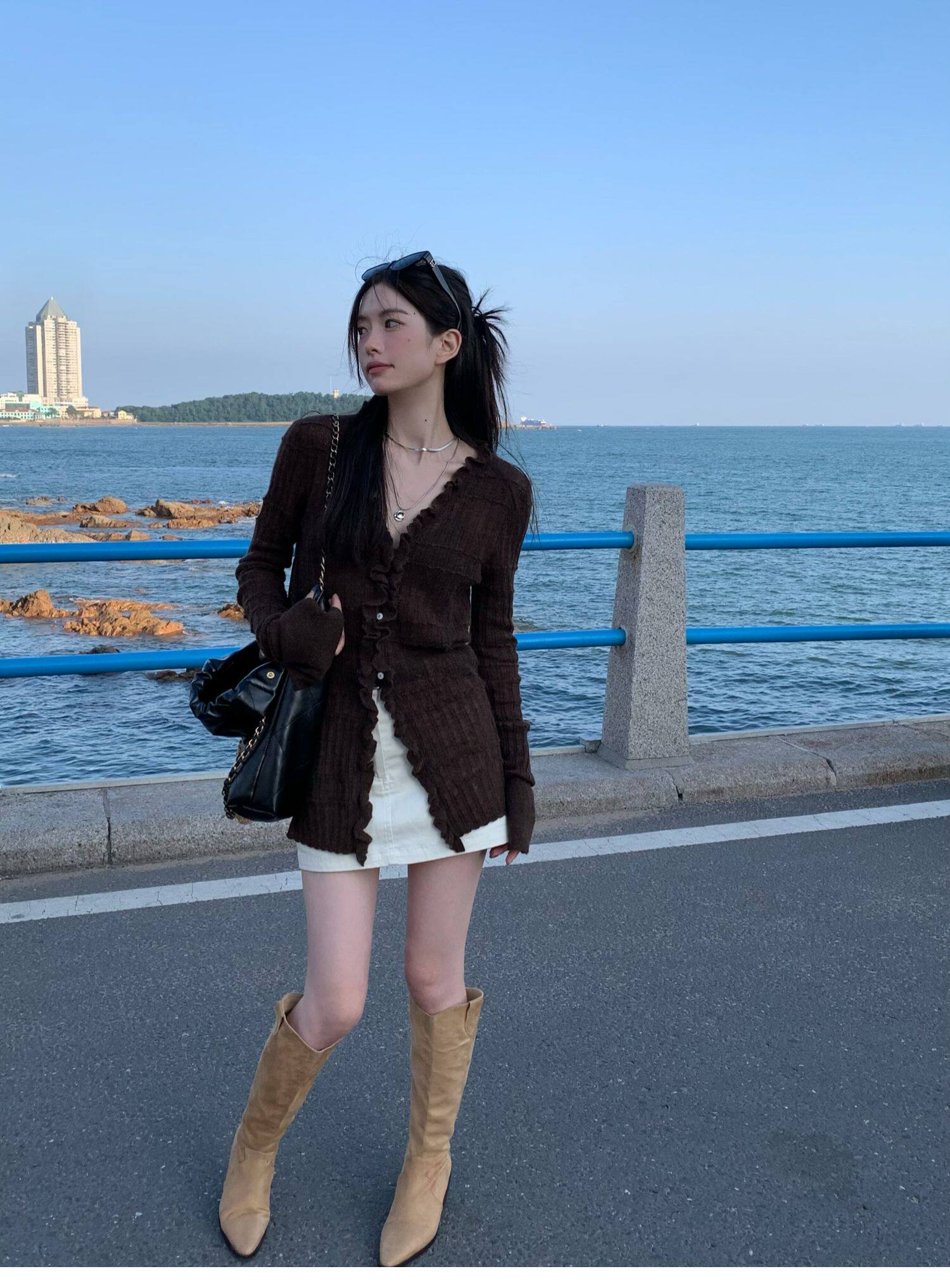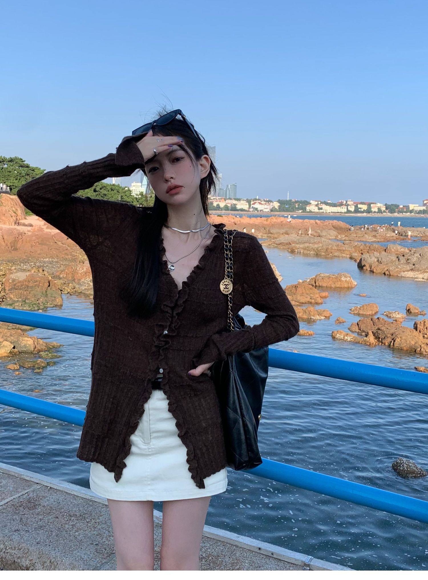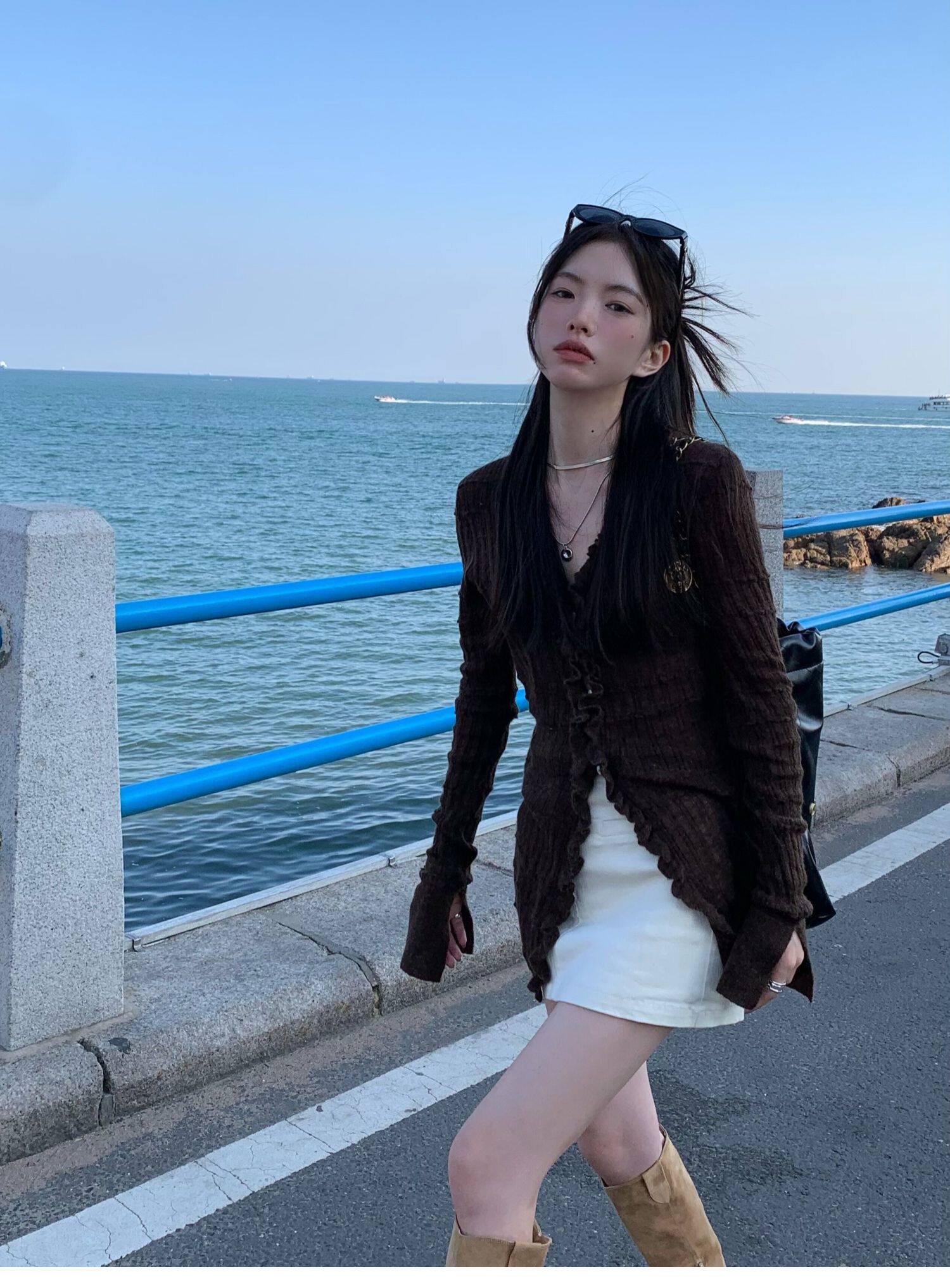 復古木耳邊V領長袖針織開衫女秋季2025新款時尚百搭修身咖色上衣