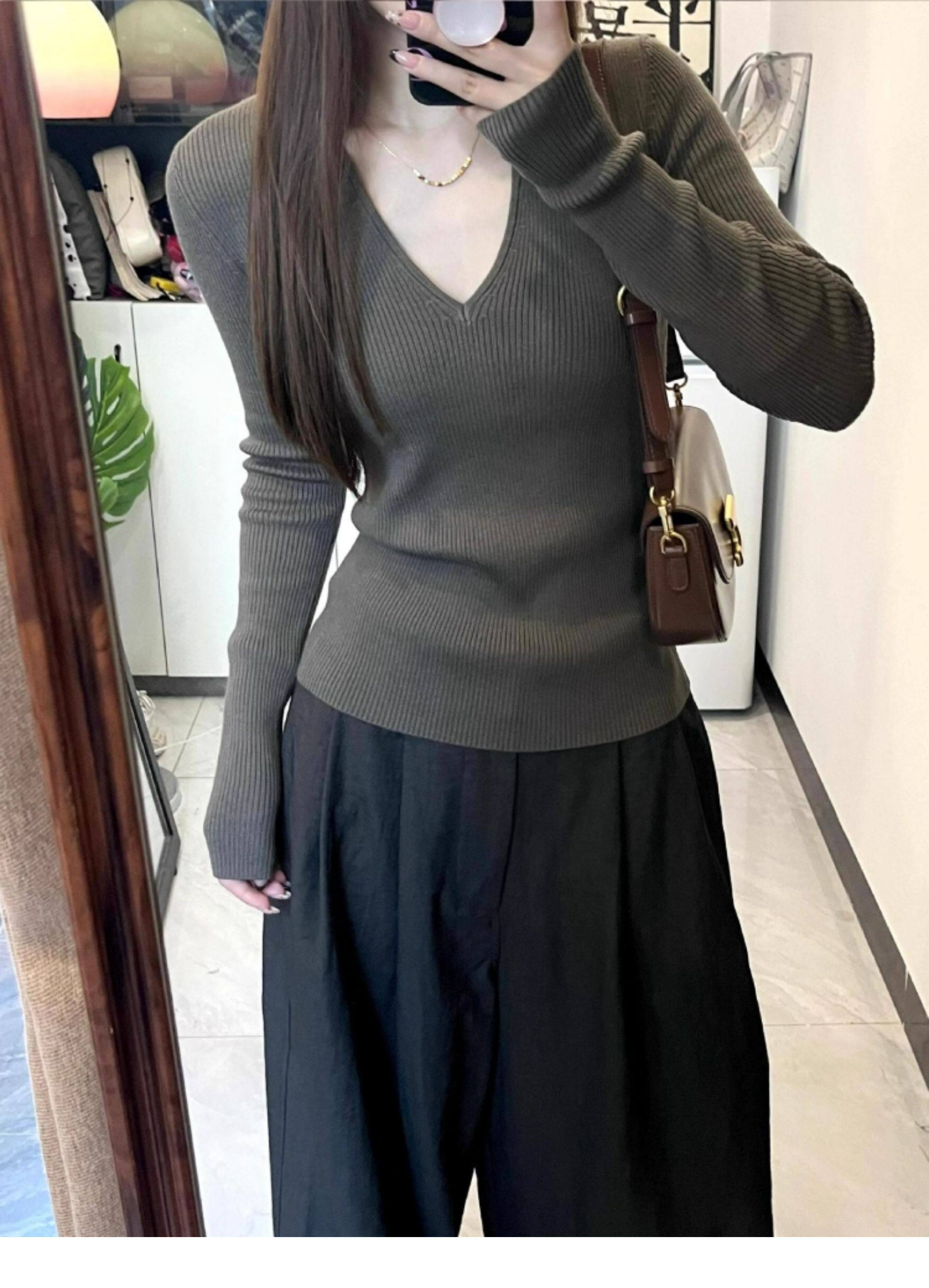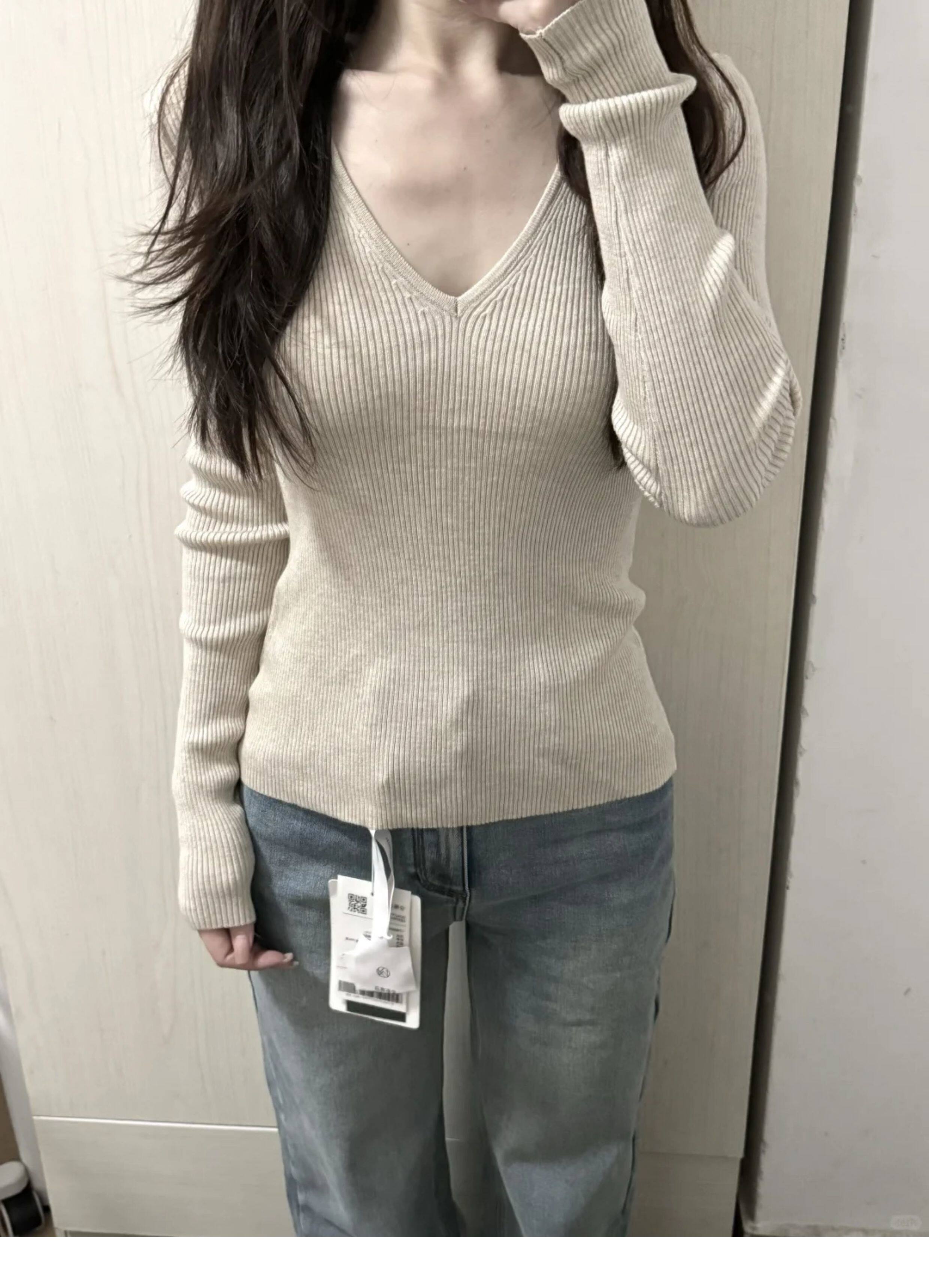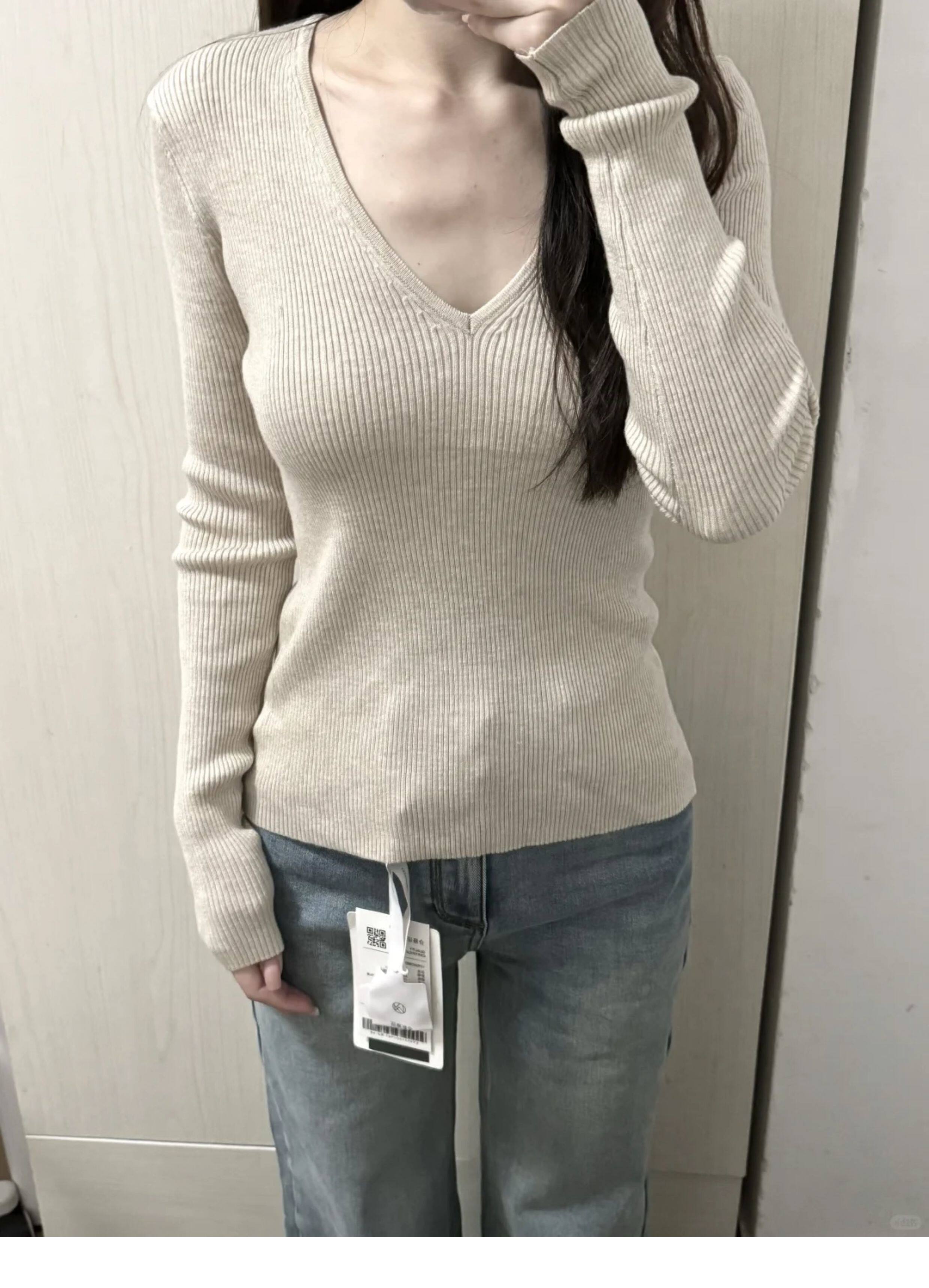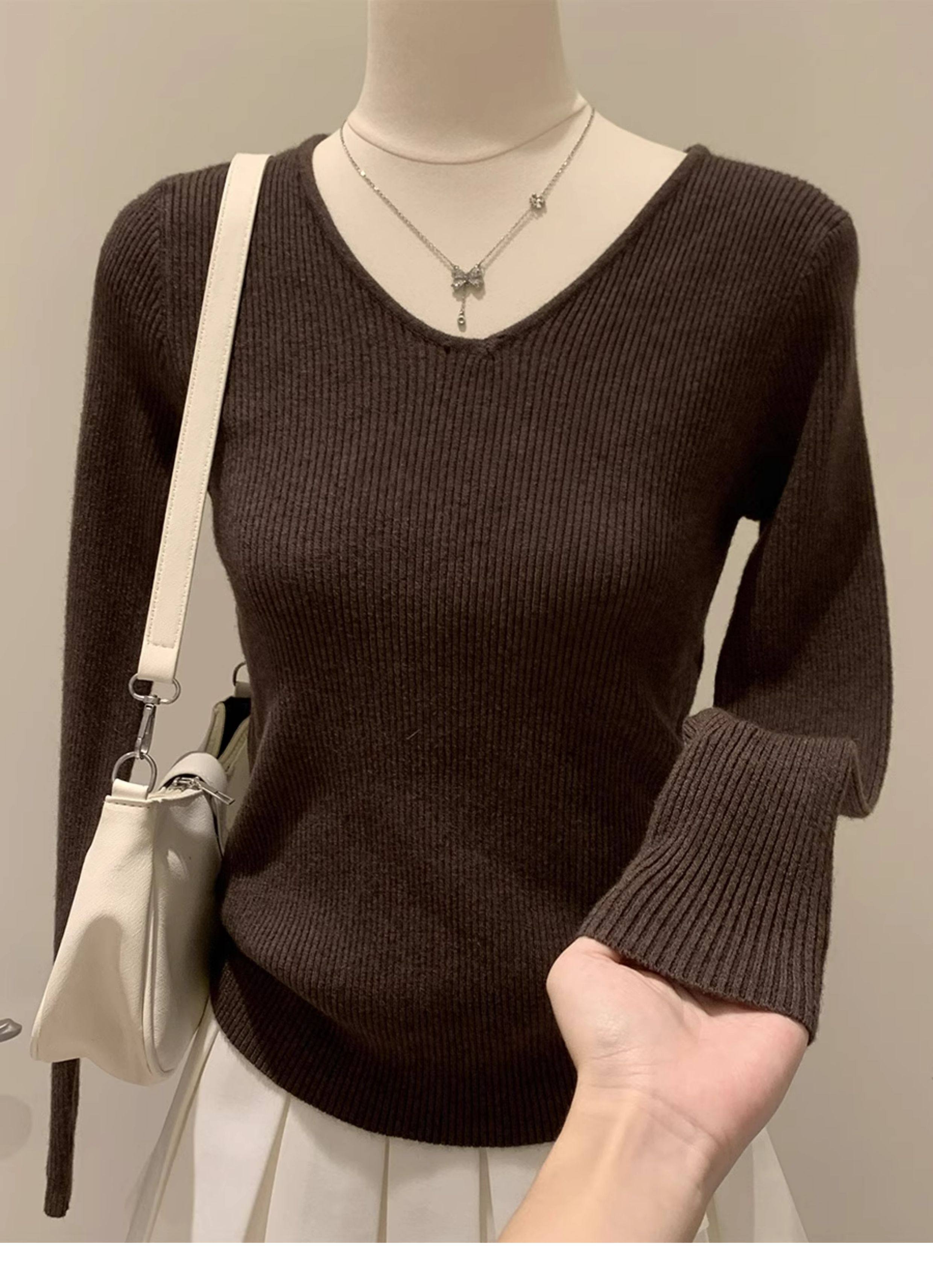 韓系chicV領露鎖骨長袖針織衫女秋裝新款修身顯瘦內搭打底衫上衣