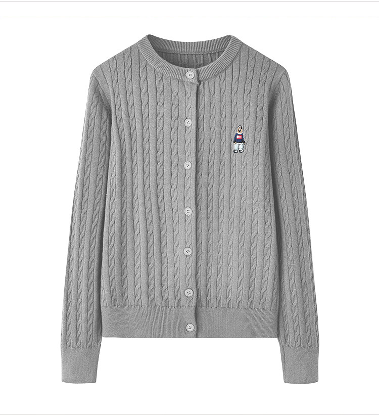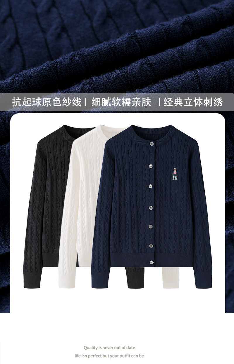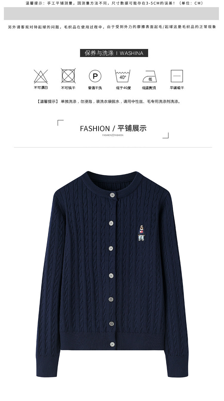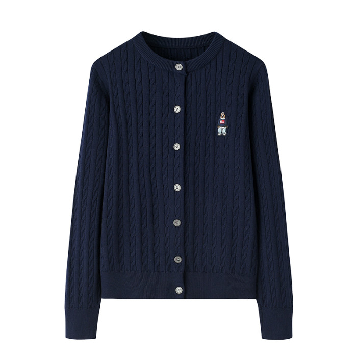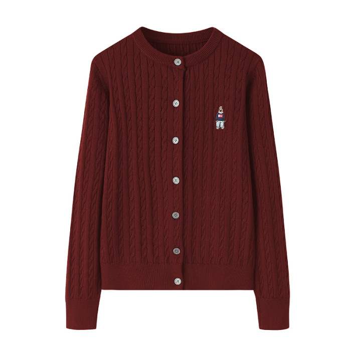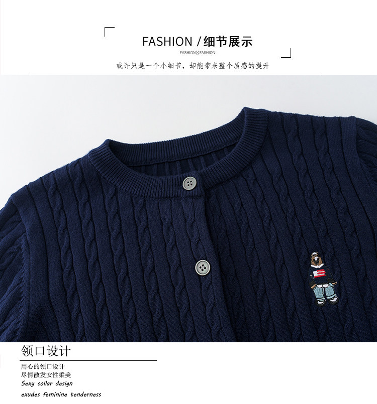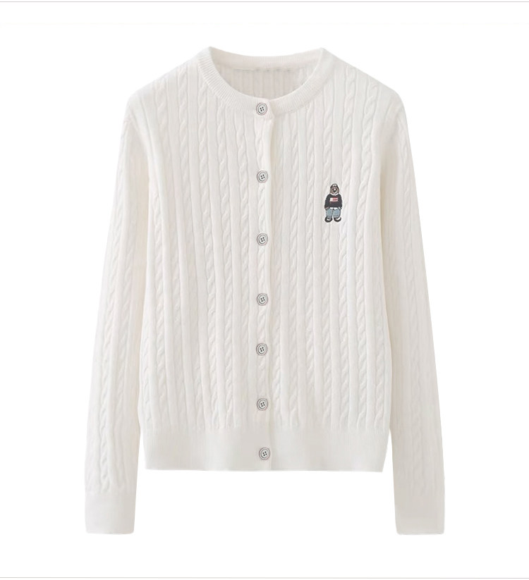 學院風針織外套春秋款小熊刺綉毛衣韓版修身外搭長袖坑條圓領上衣