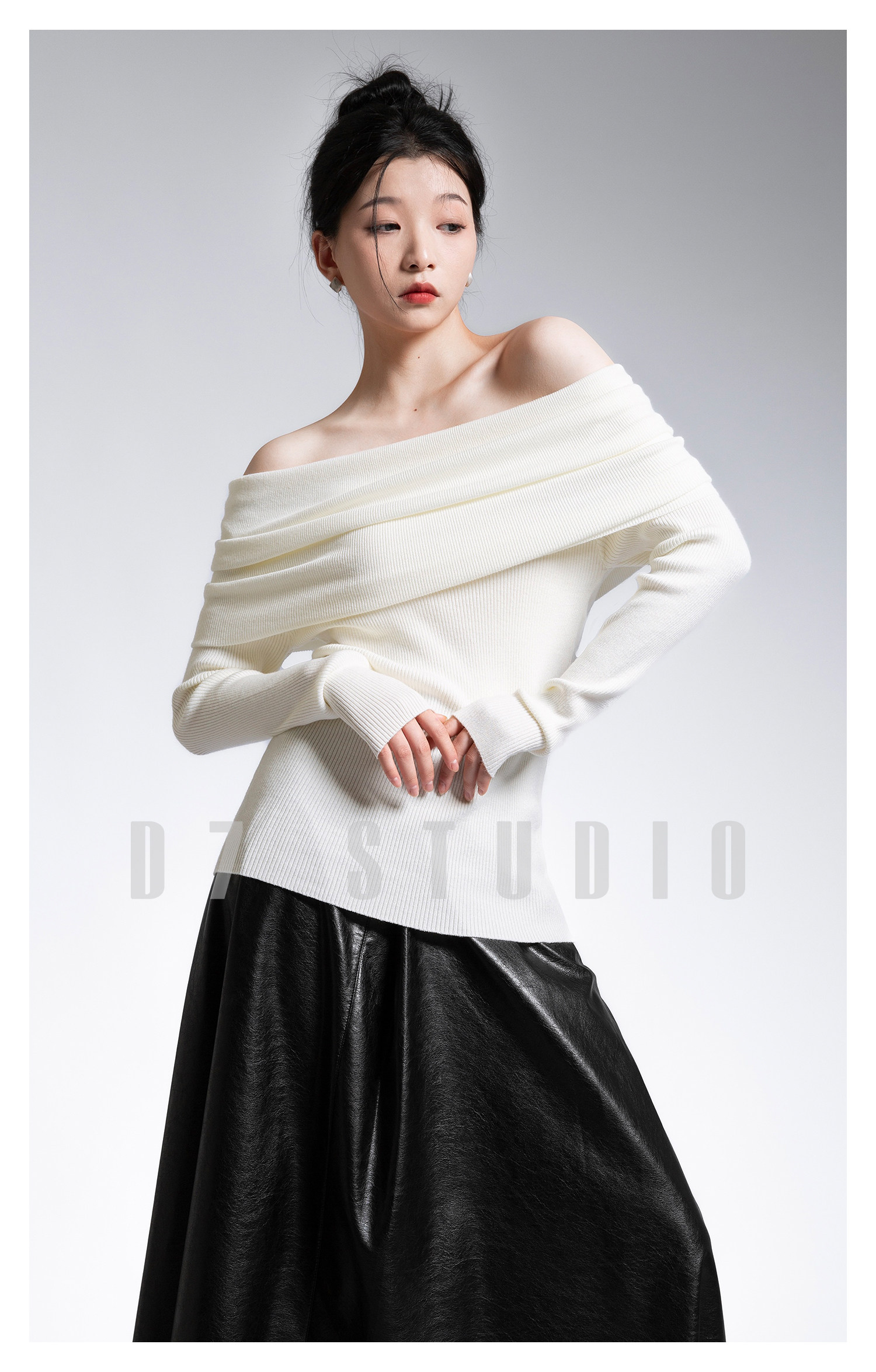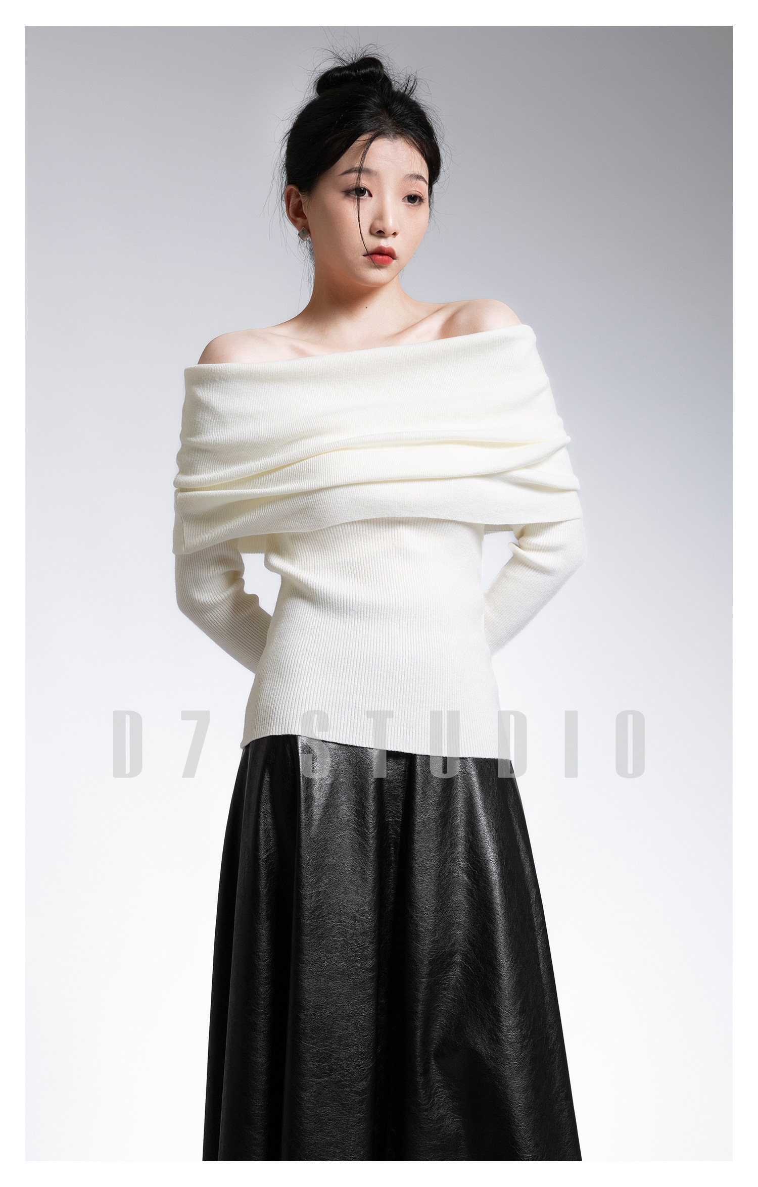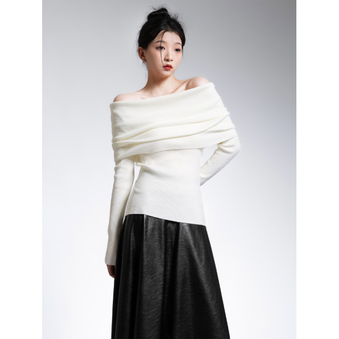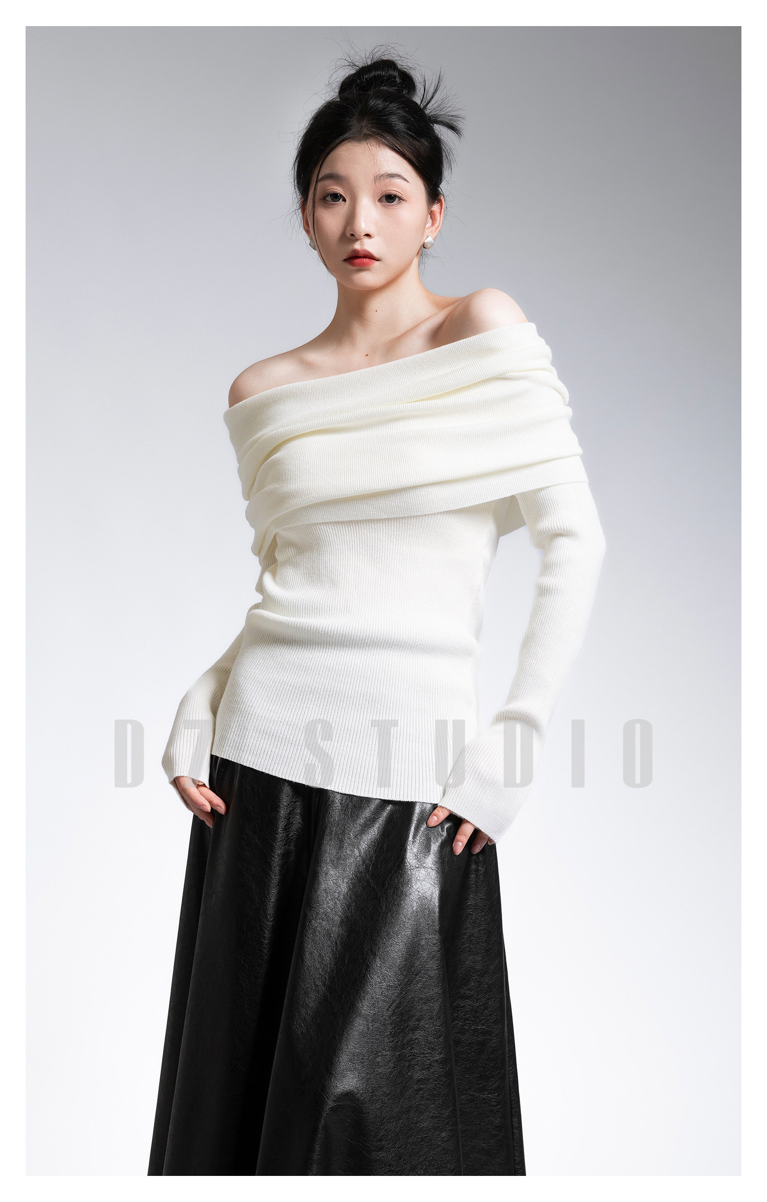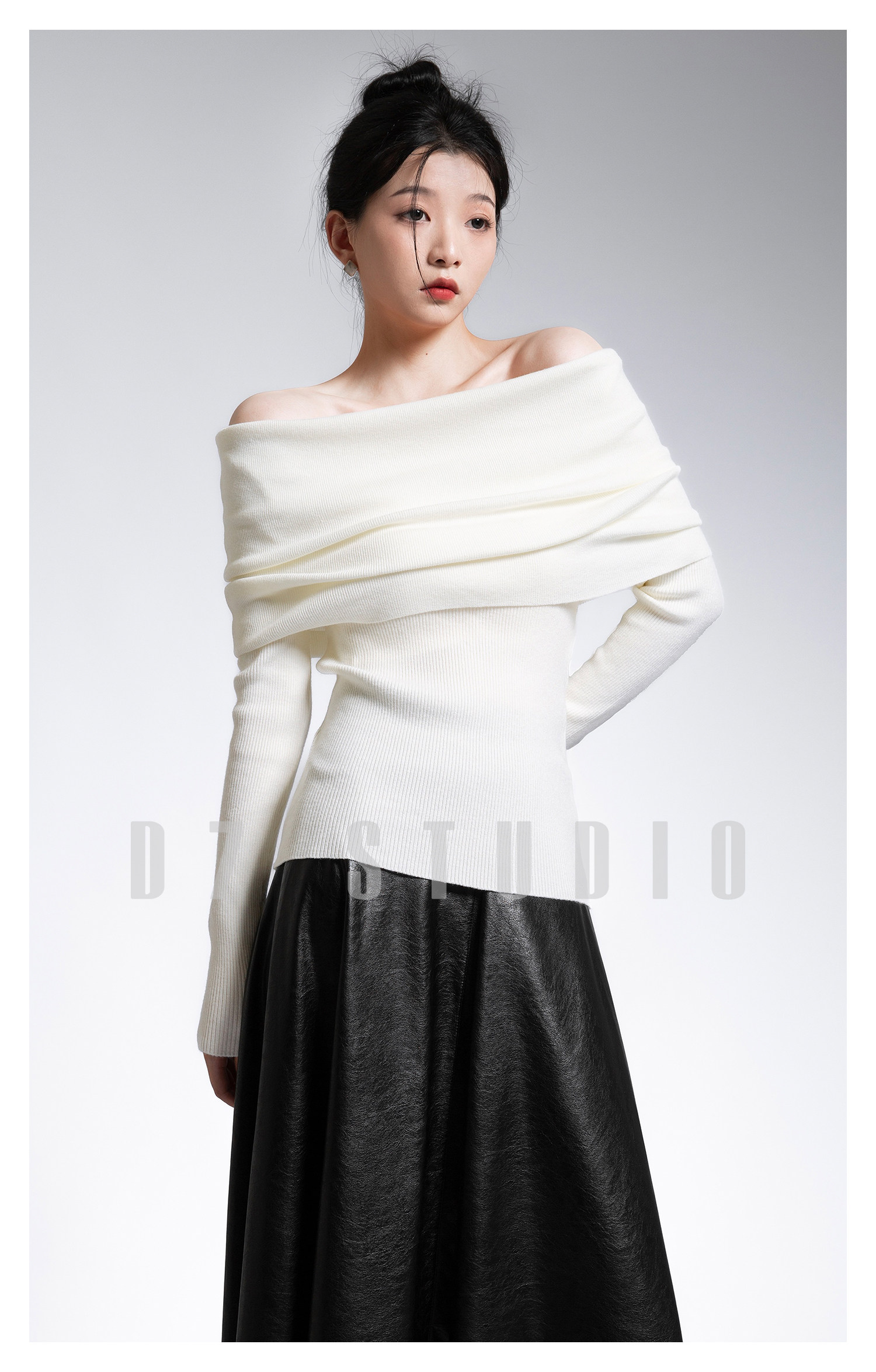 法式一字肩堆堆領針織衫女露肩修身外穿上衣打底衫春秋高級感毛衣