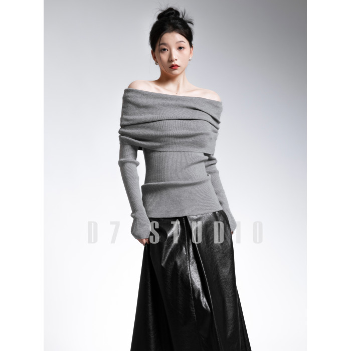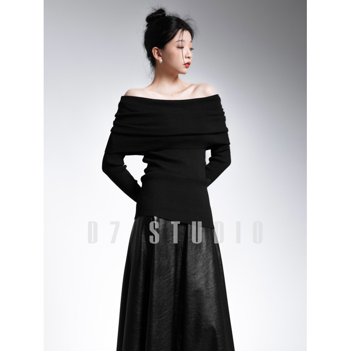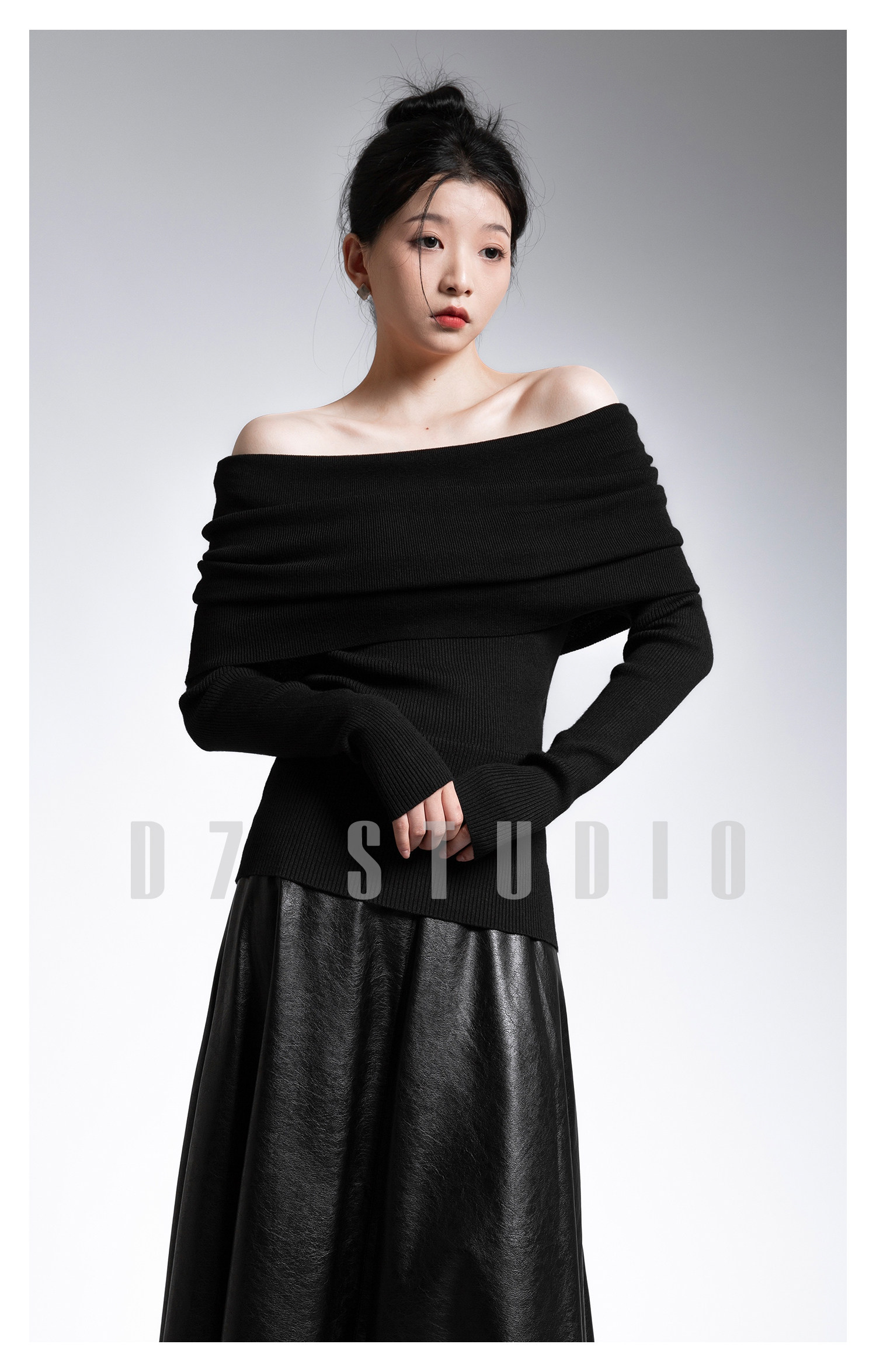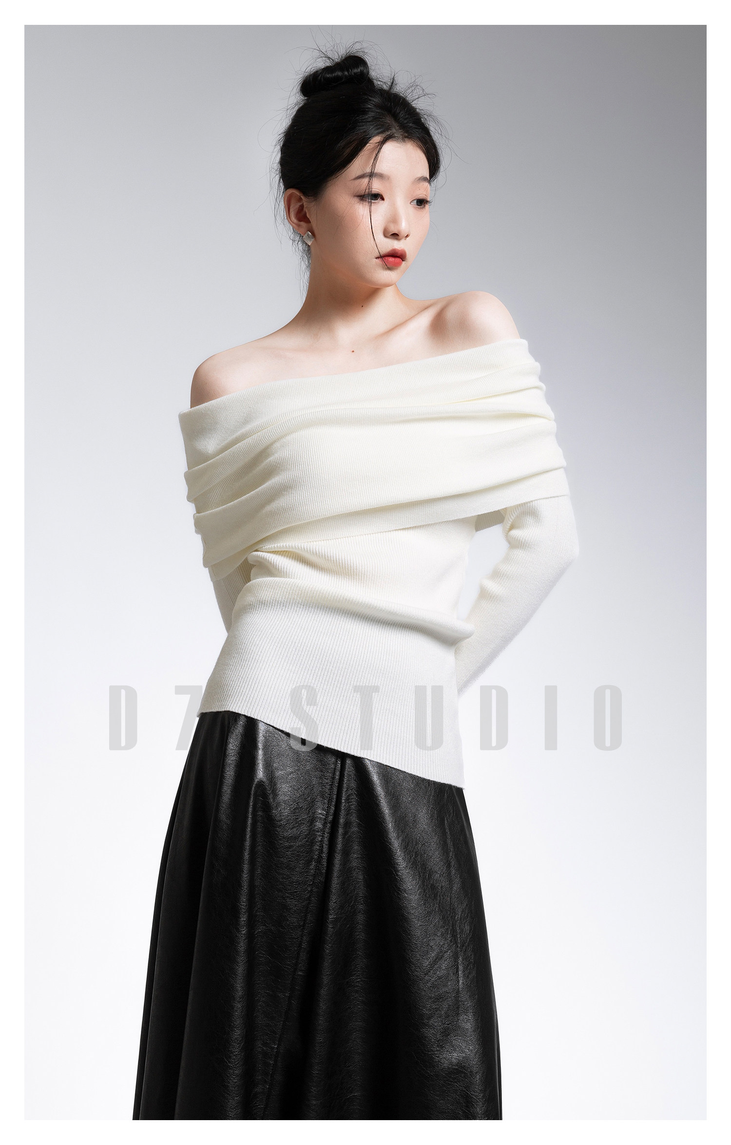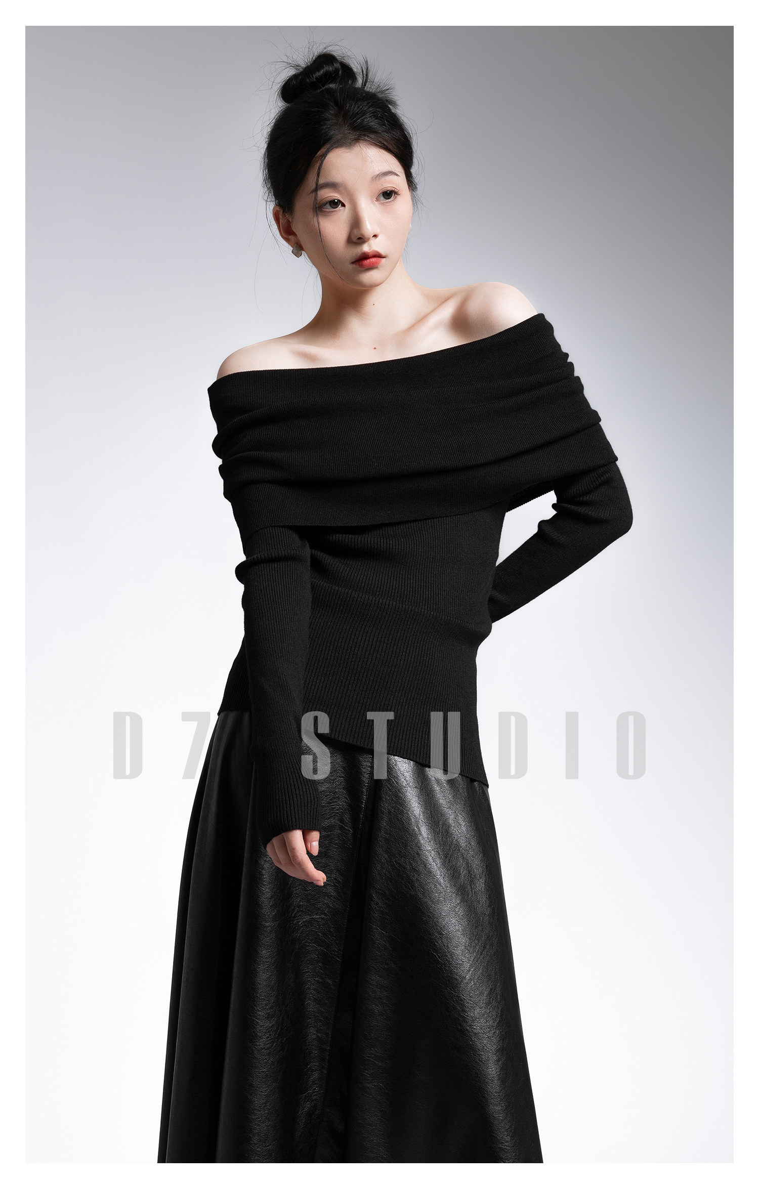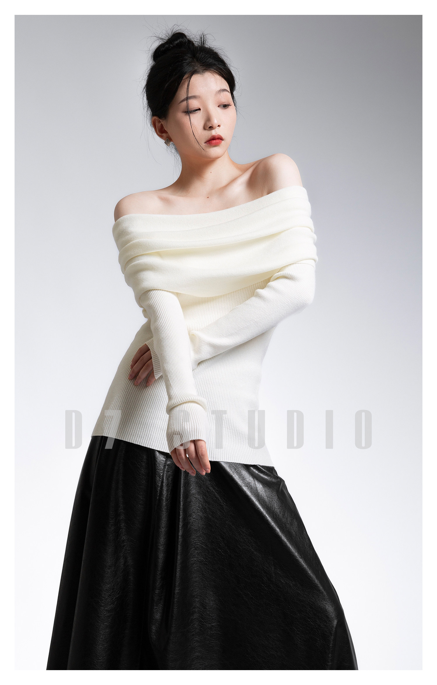 法式一字肩堆堆領針織衫女露肩修身外穿上衣打底衫春秋高級感毛衣