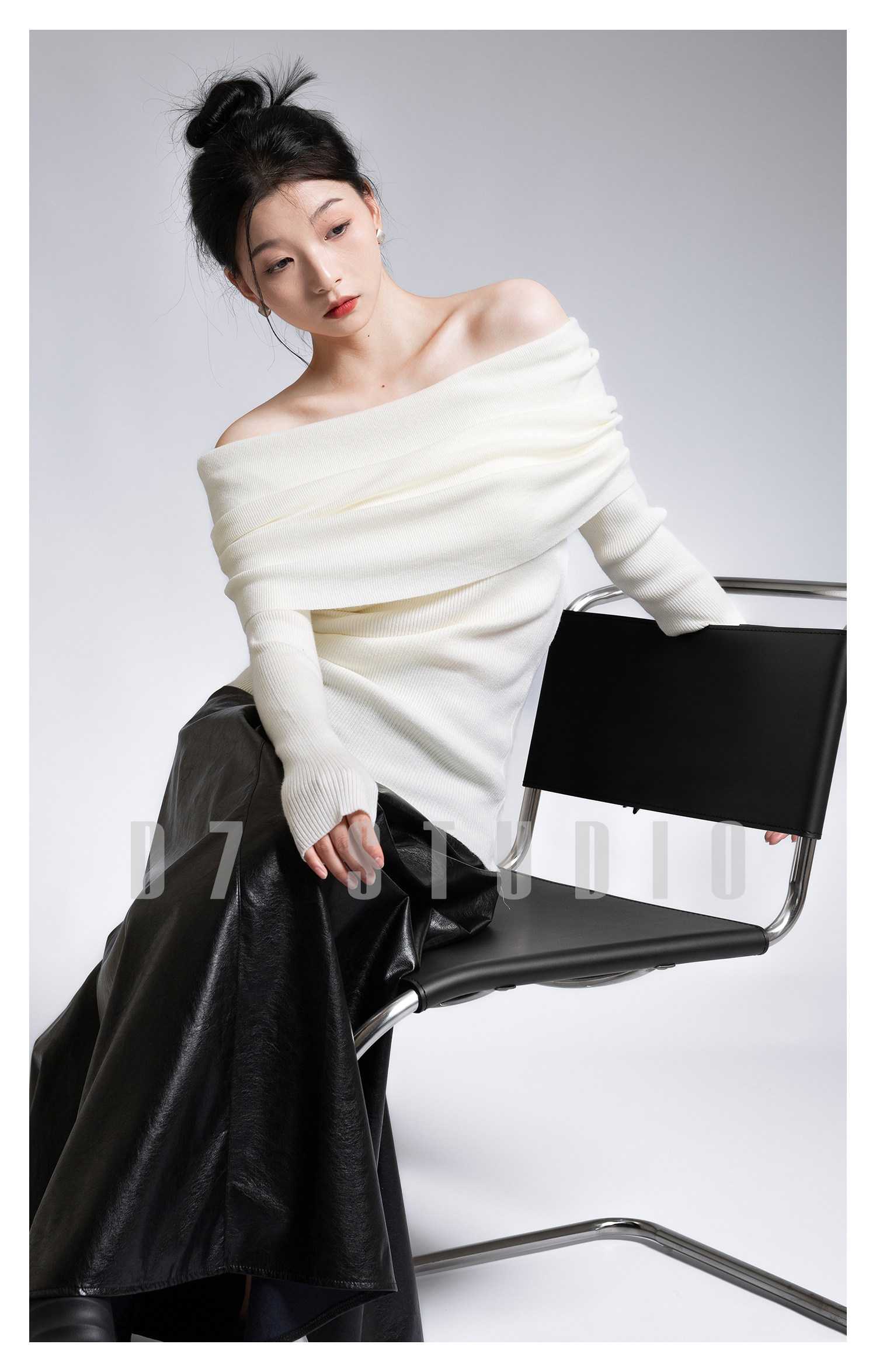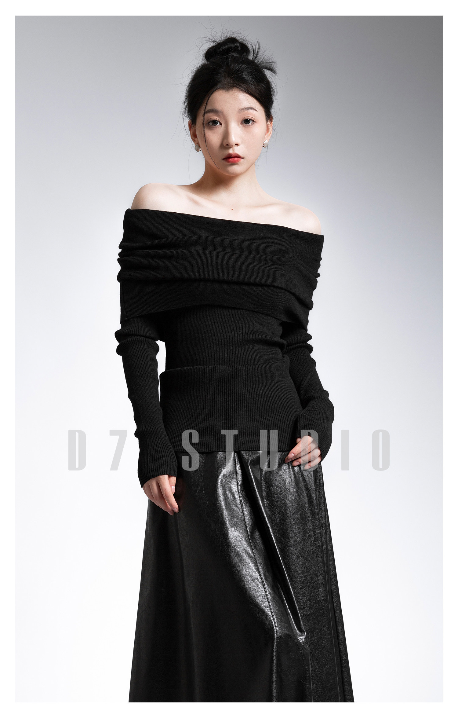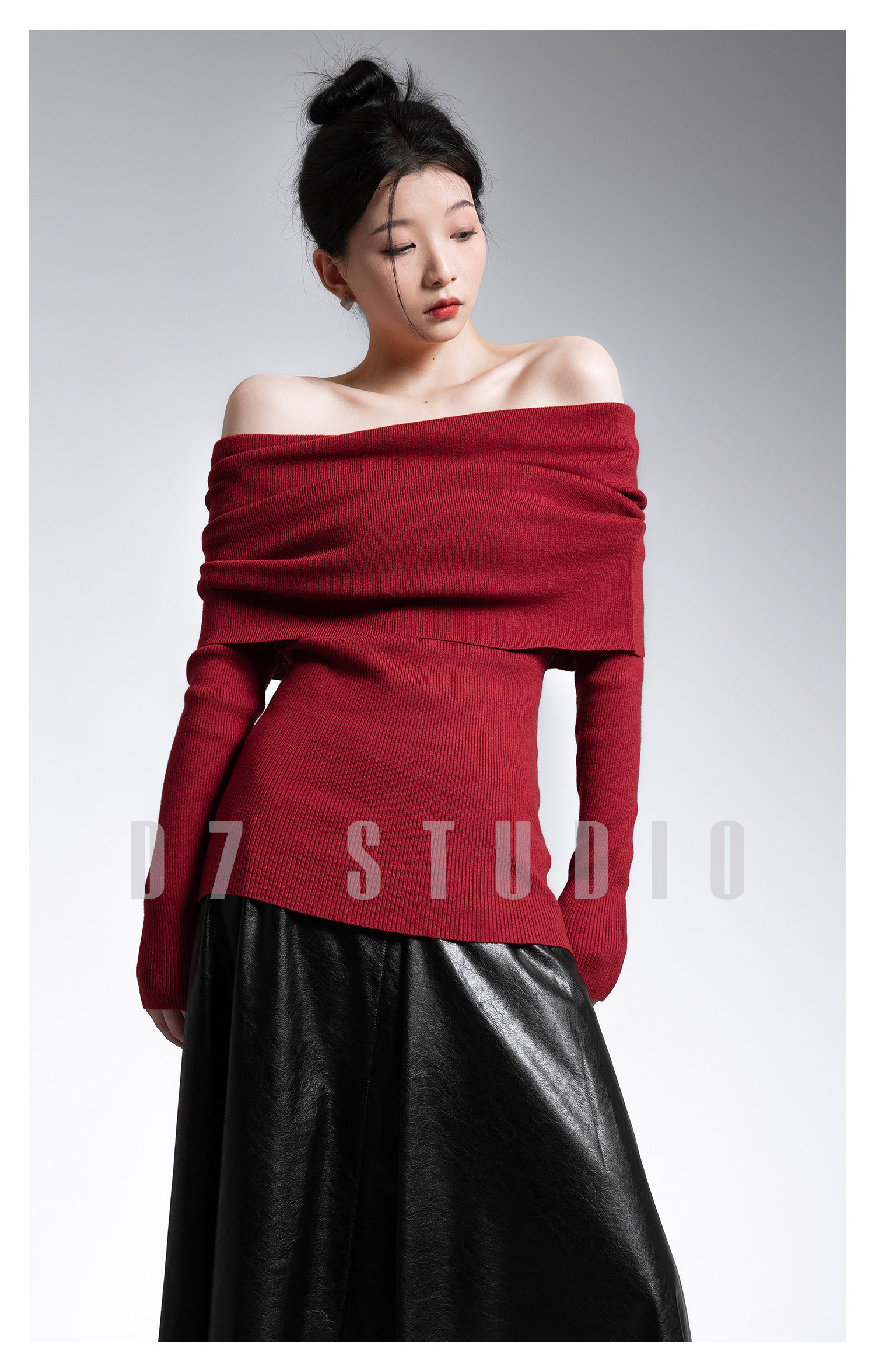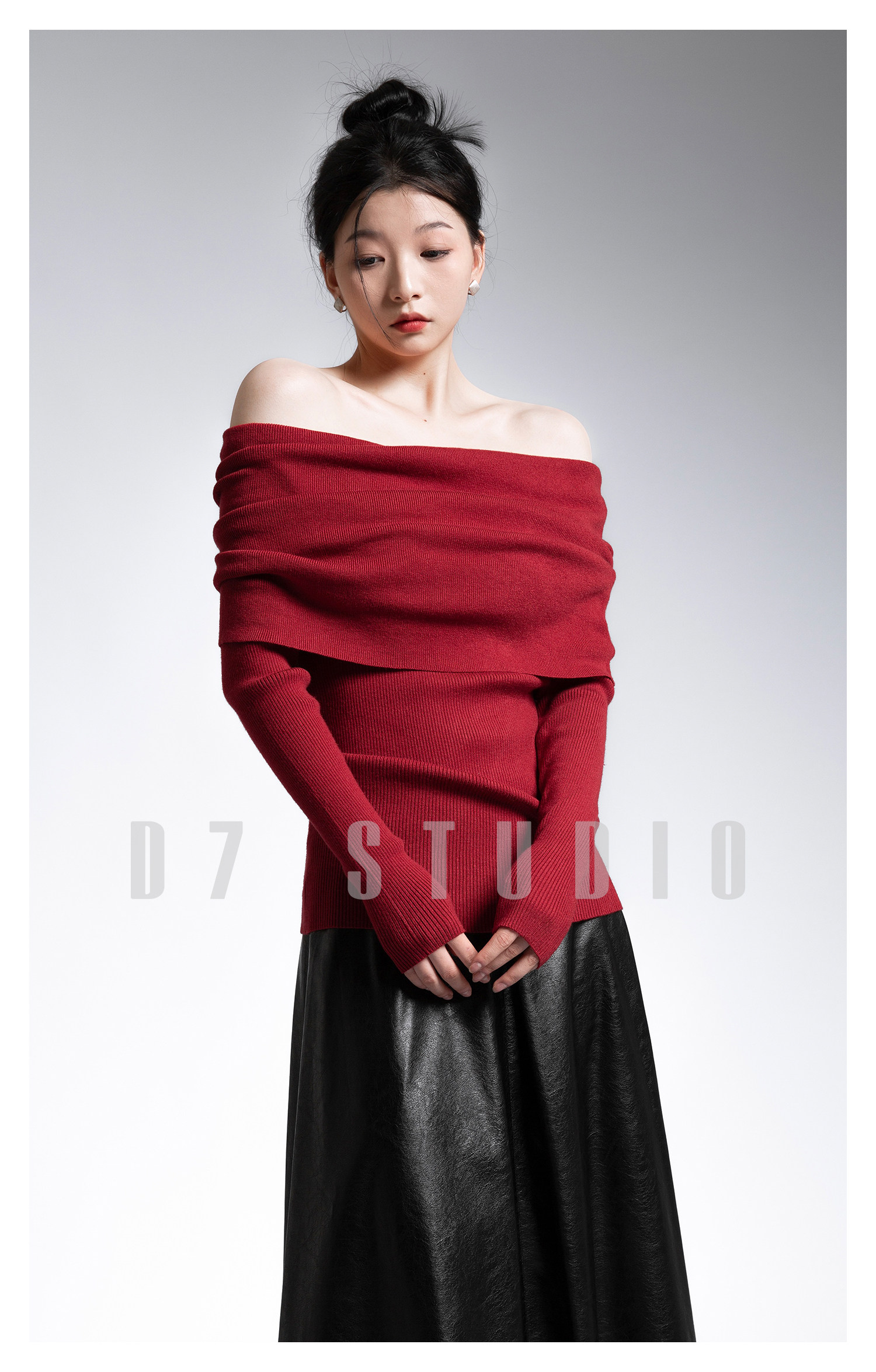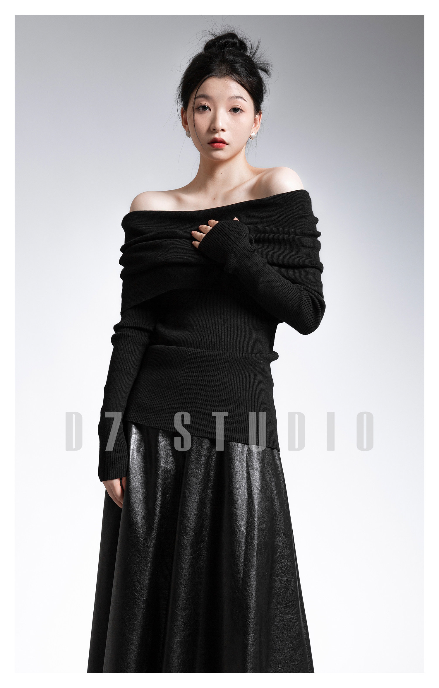 法式一字肩堆堆領針織衫女露肩修身外穿上衣打底衫春秋高級感毛衣