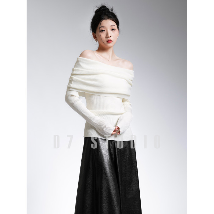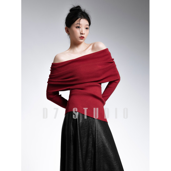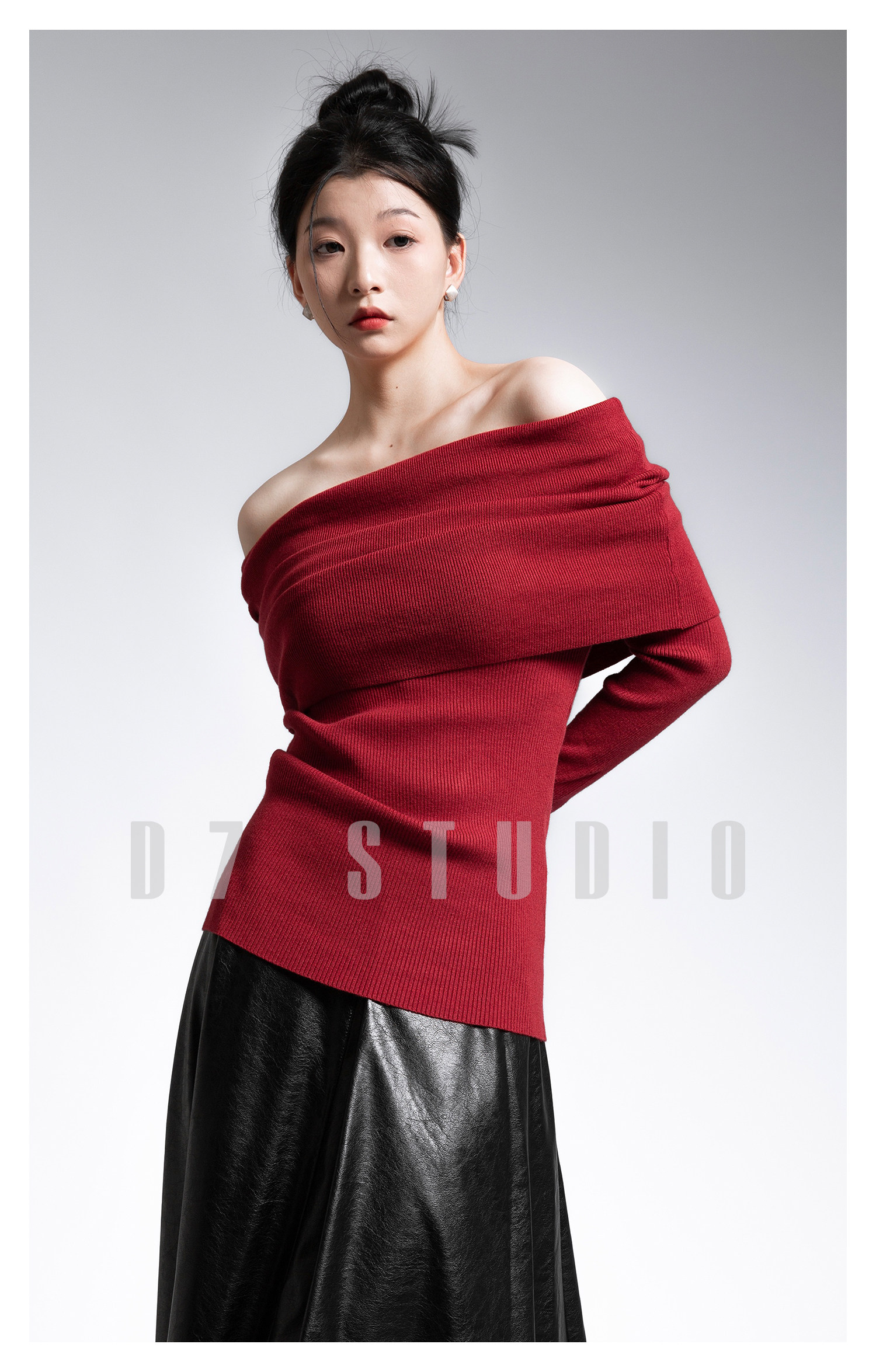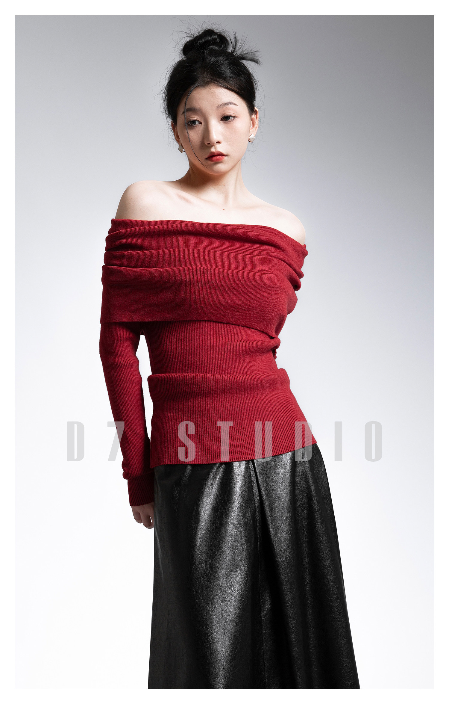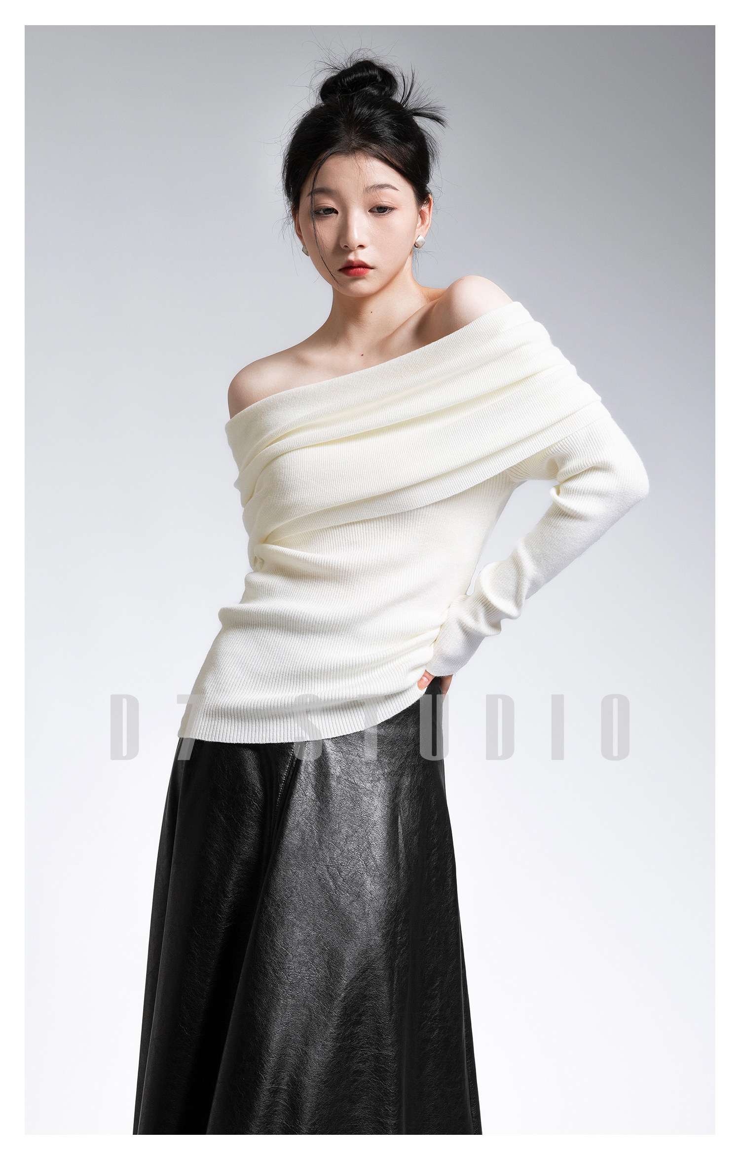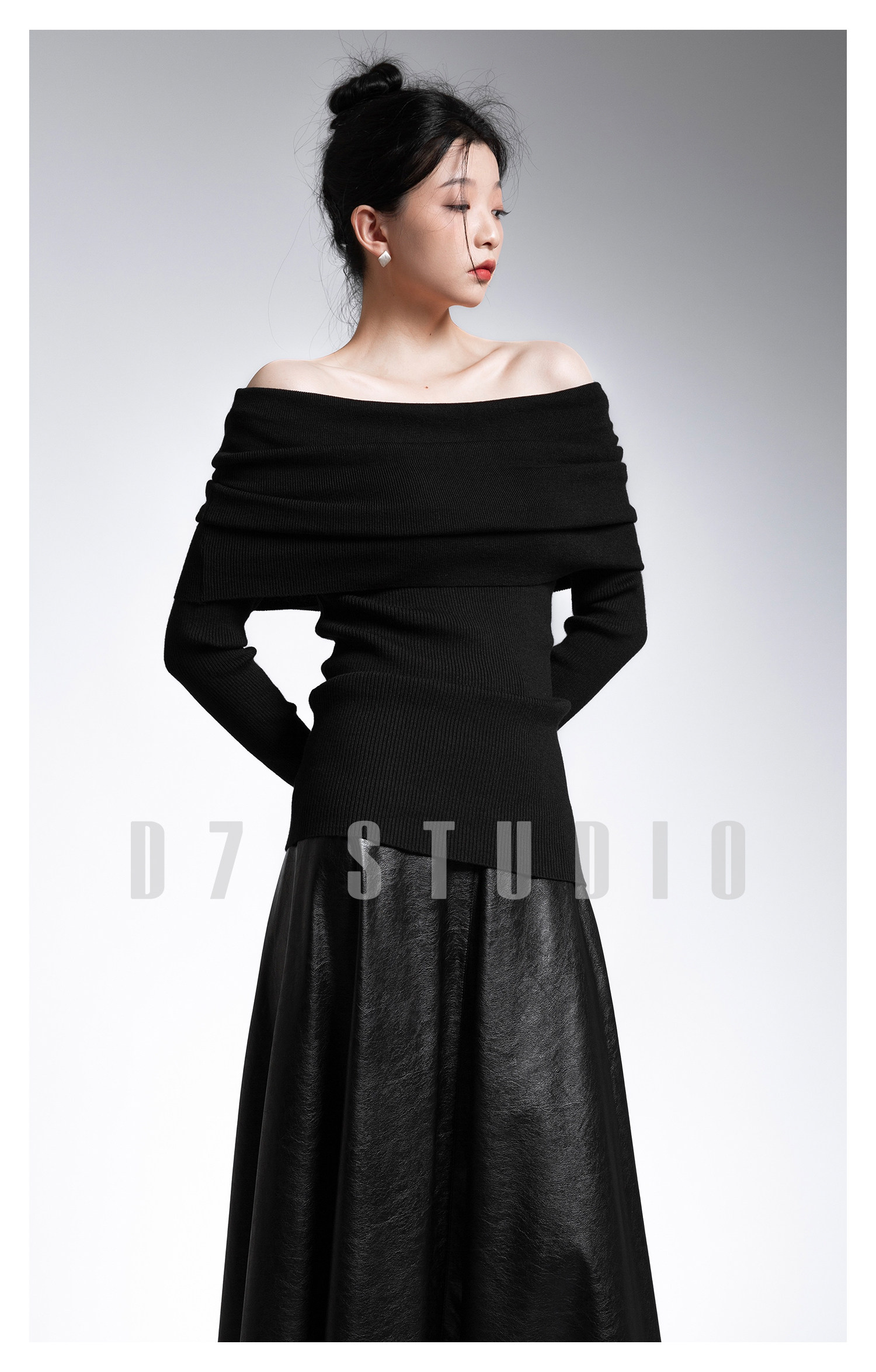 法式一字肩堆堆領針織衫女露肩修身外穿上衣打底衫春秋高級感毛衣