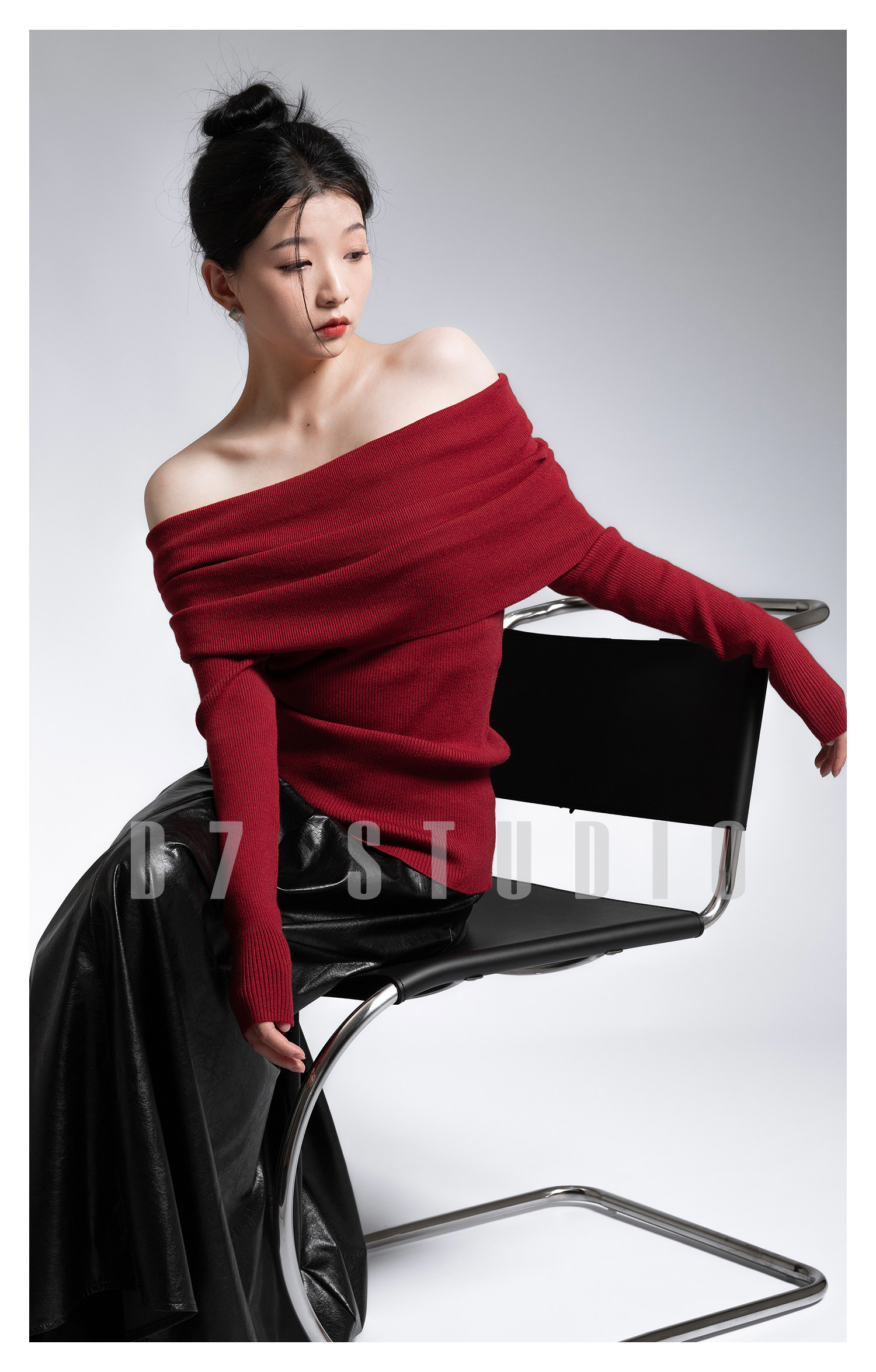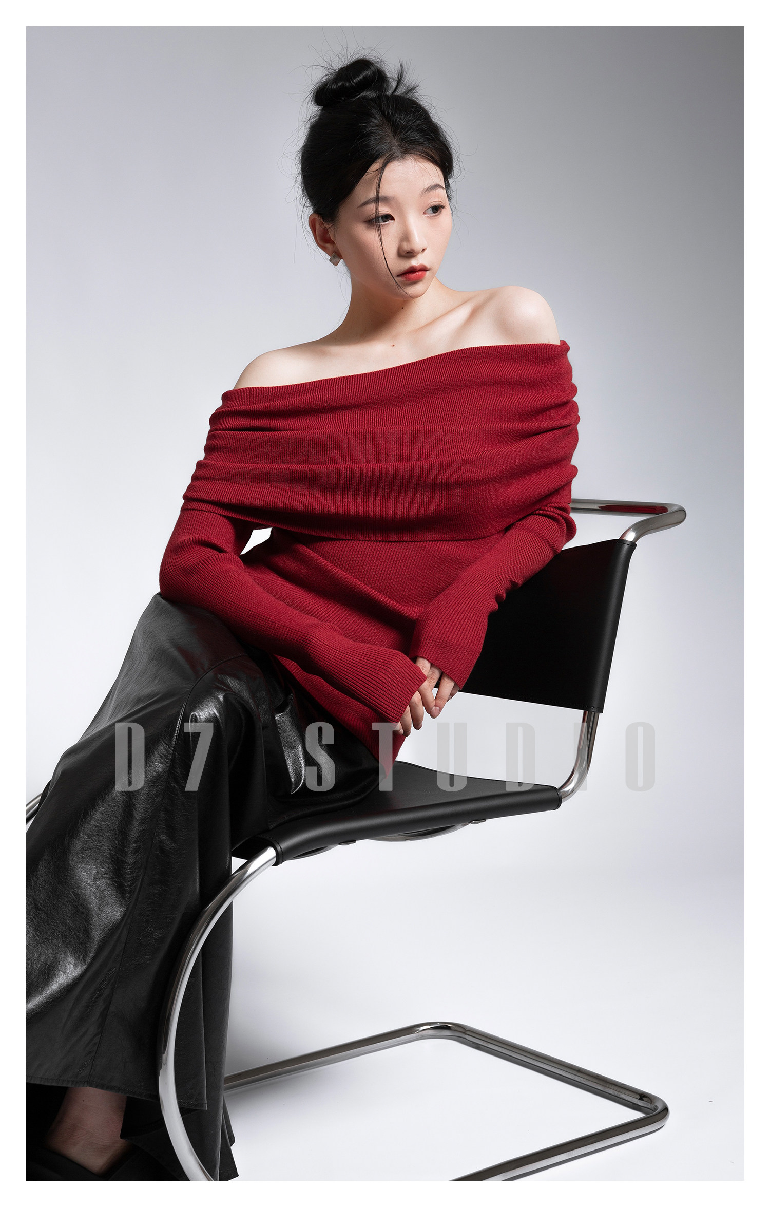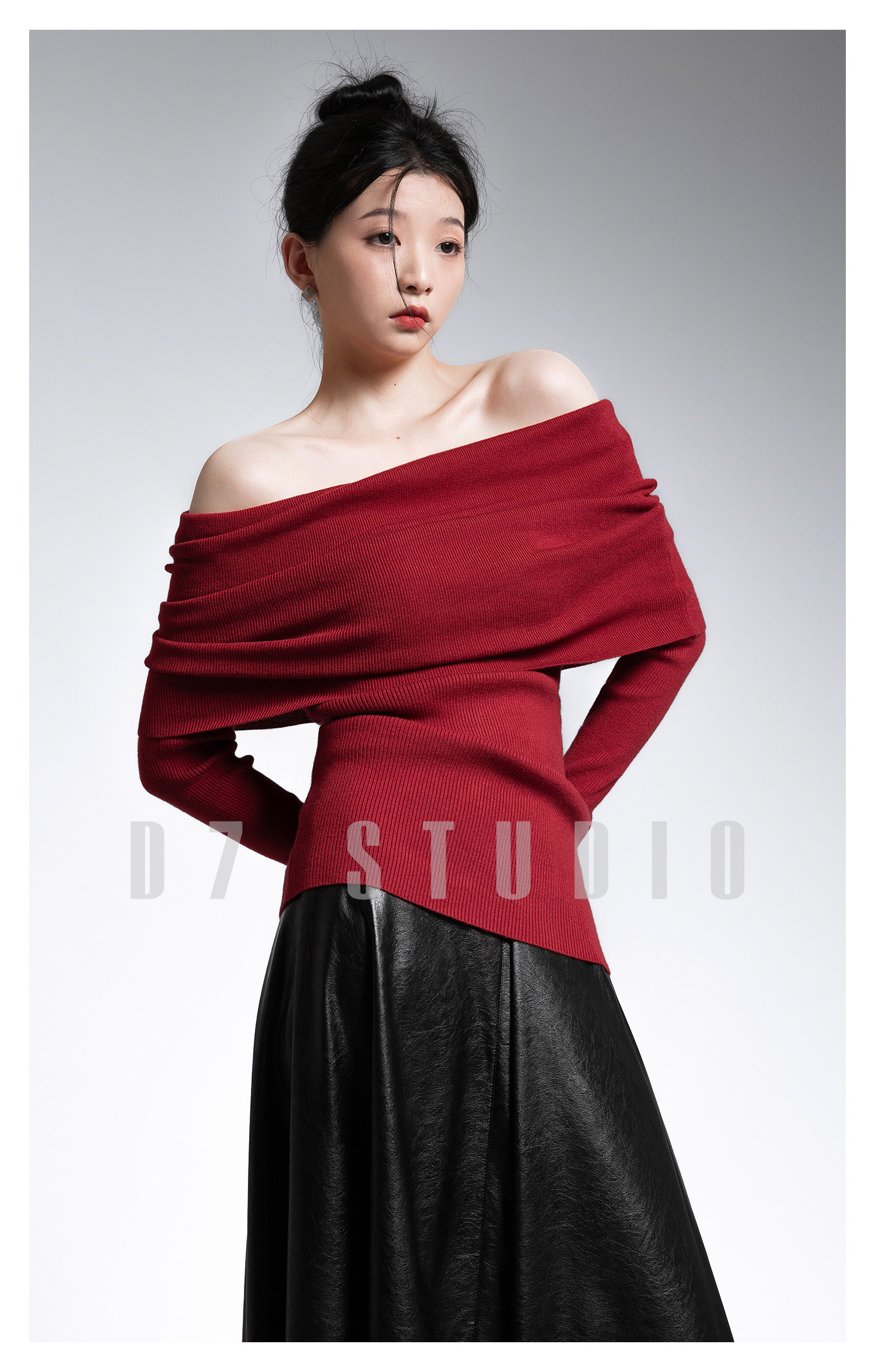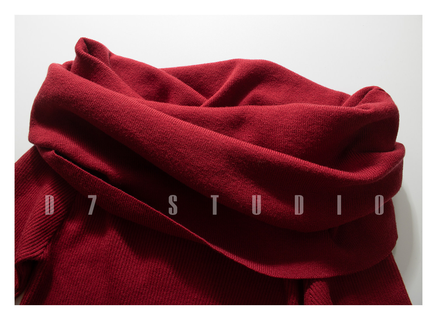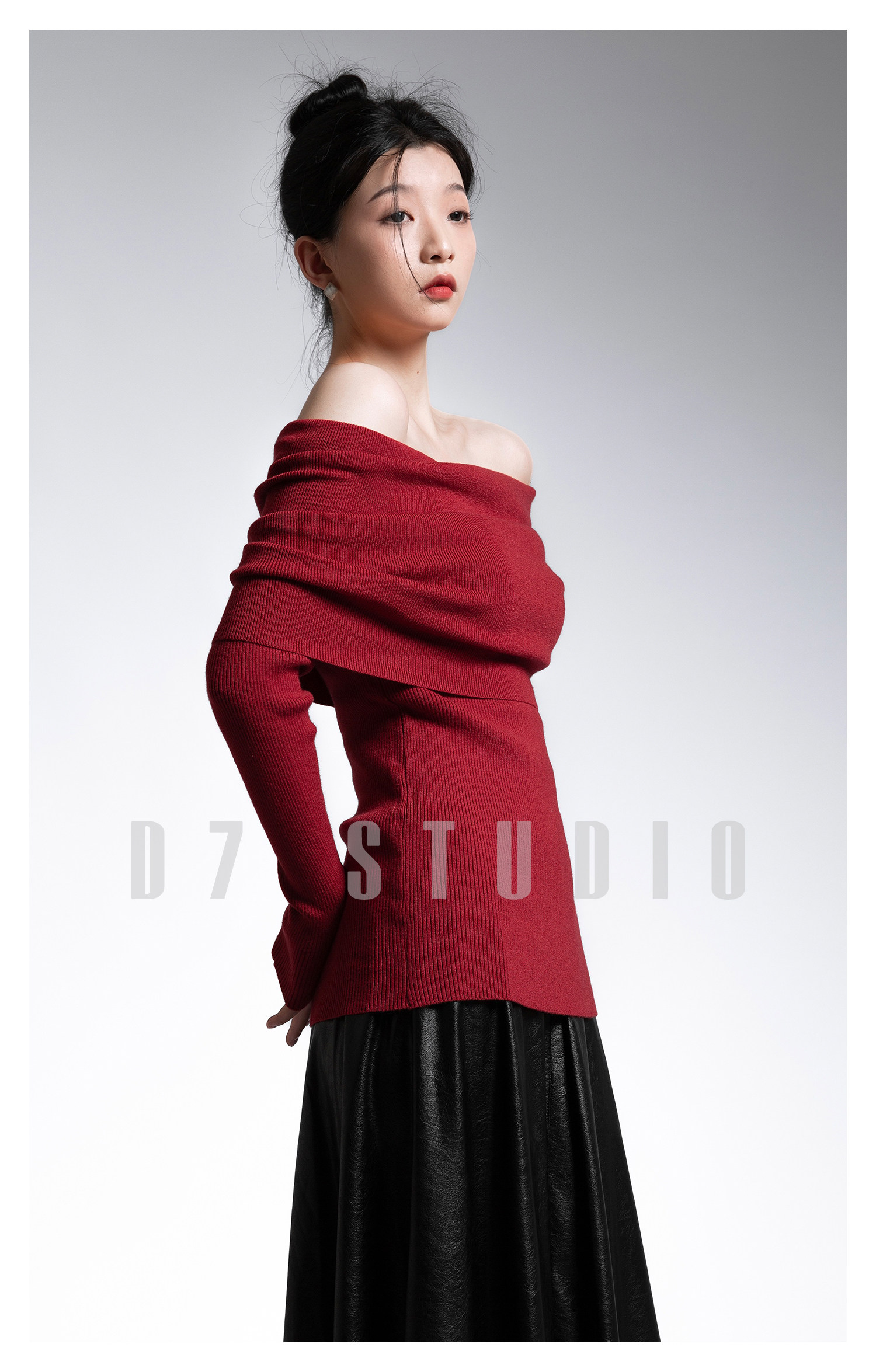 法式一字肩堆堆領針織衫女露肩修身外穿上衣打底衫春秋高級感毛衣