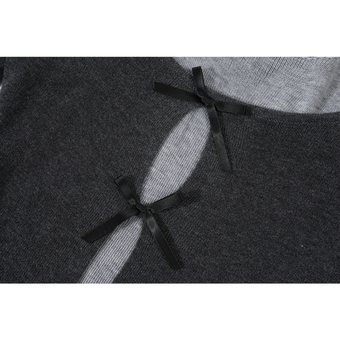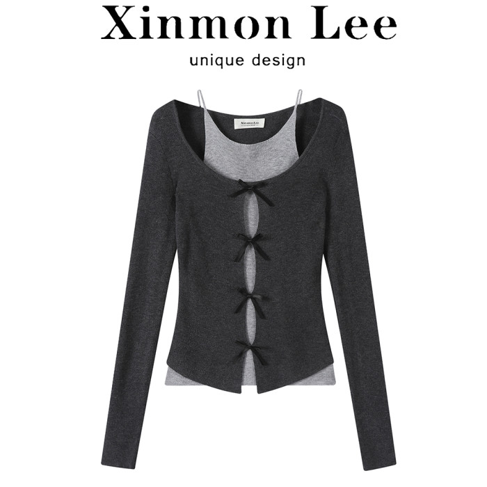 XinmonLee高級感灰色蝴蝶結假兩件長袖針織衫早秋修身辣妹T恤女