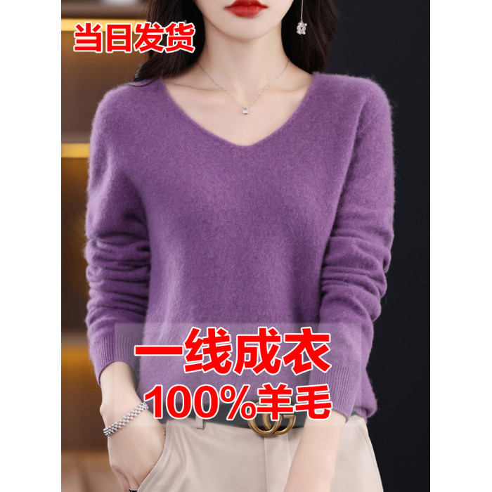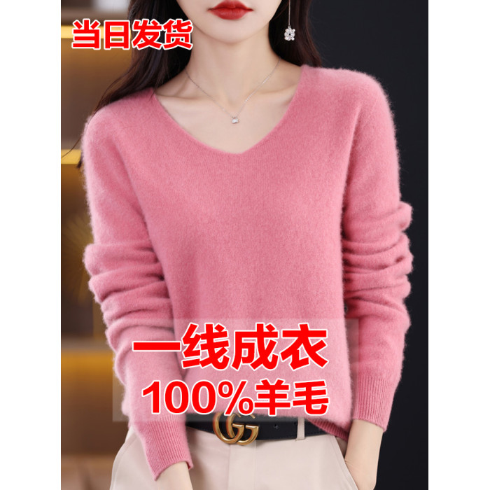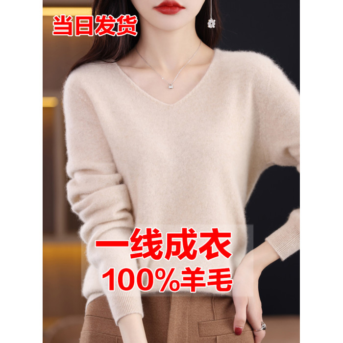 秋冬羊毛衫女V領寬鬆套頭毛衣內搭羊絨衫針織短款打底衫保暖上衣