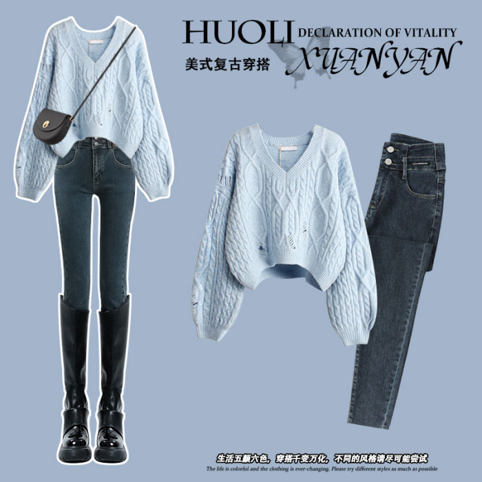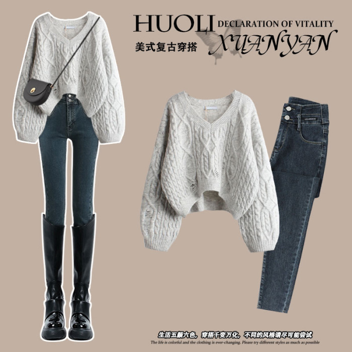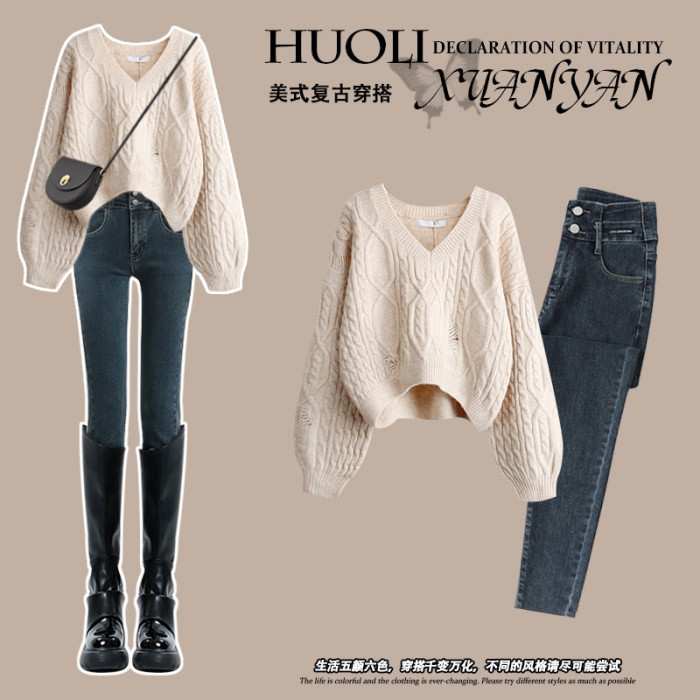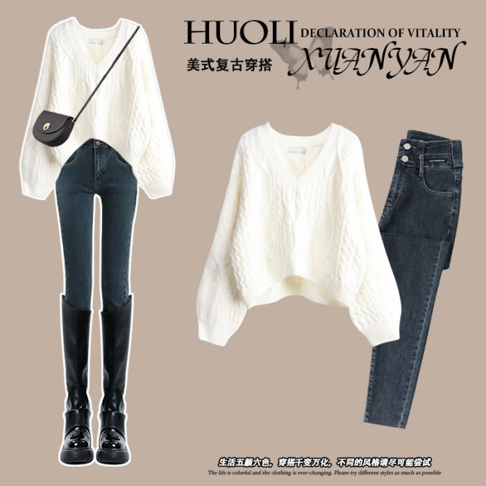 韓系秋冬穿搭慵懶白色v領毛衣女巨好看的冬裝一整套外穿針織上衣