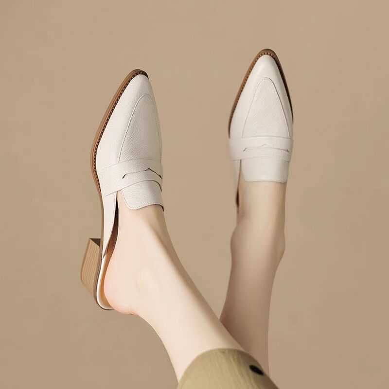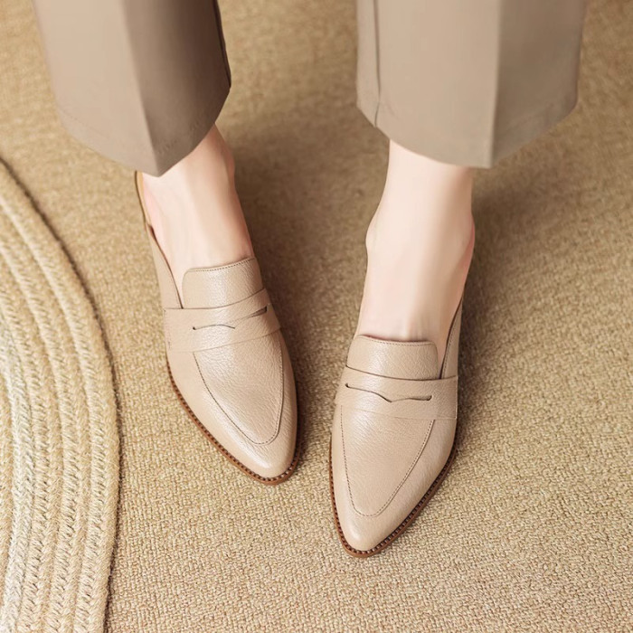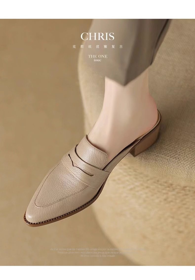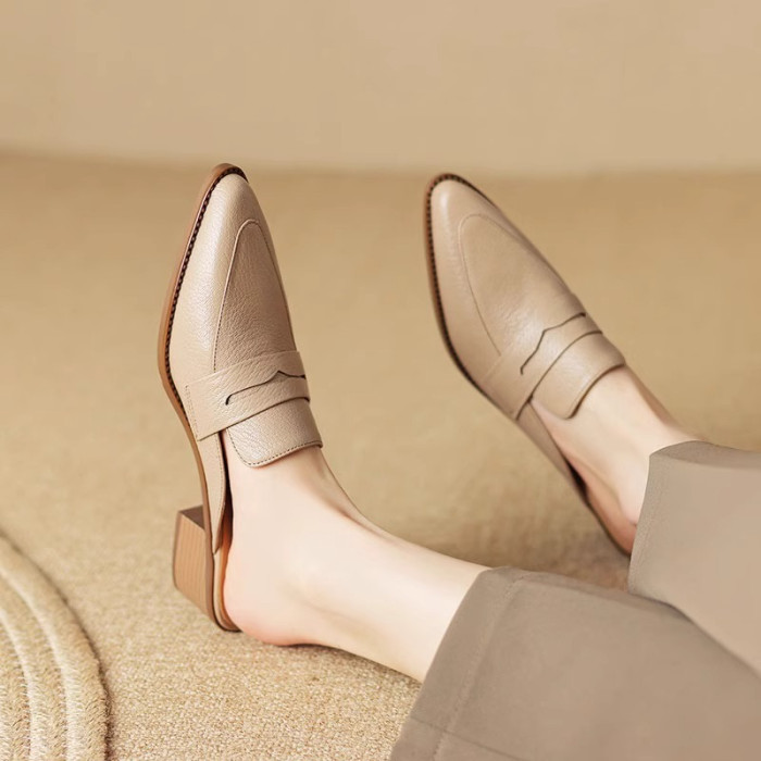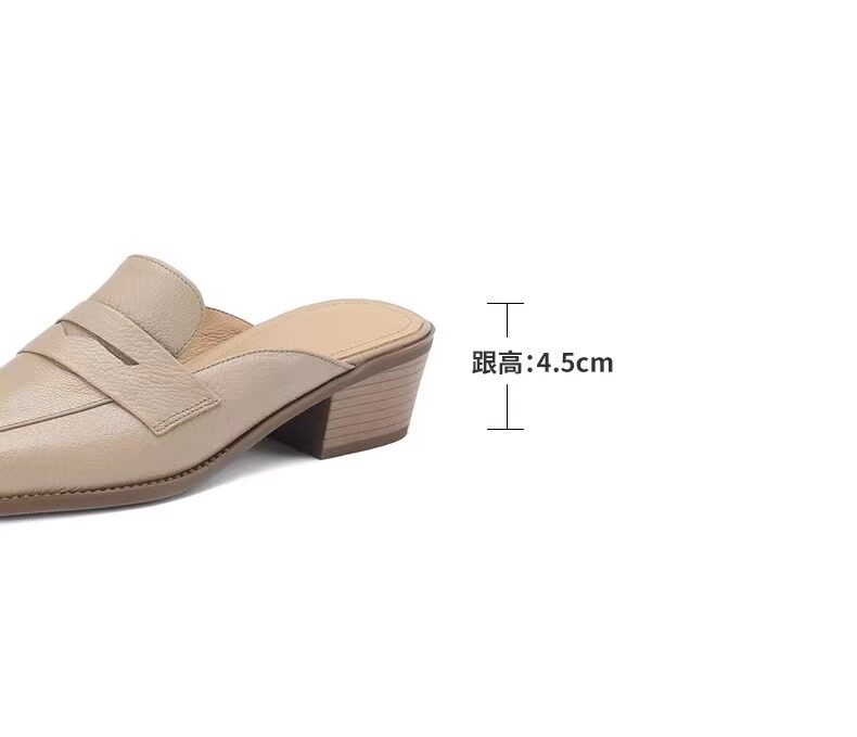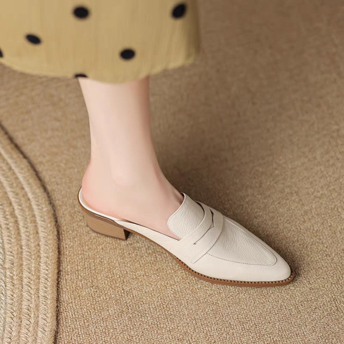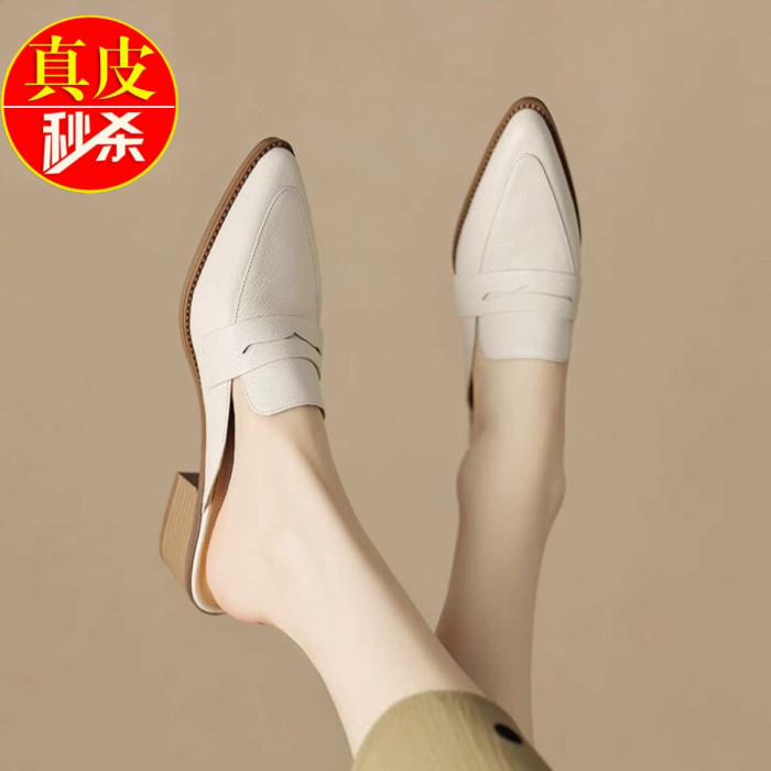 青蘊真皮包頭半拖鞋女夏季外穿2025年新款時尚粗跟尖頭穆勒涼拖鞋