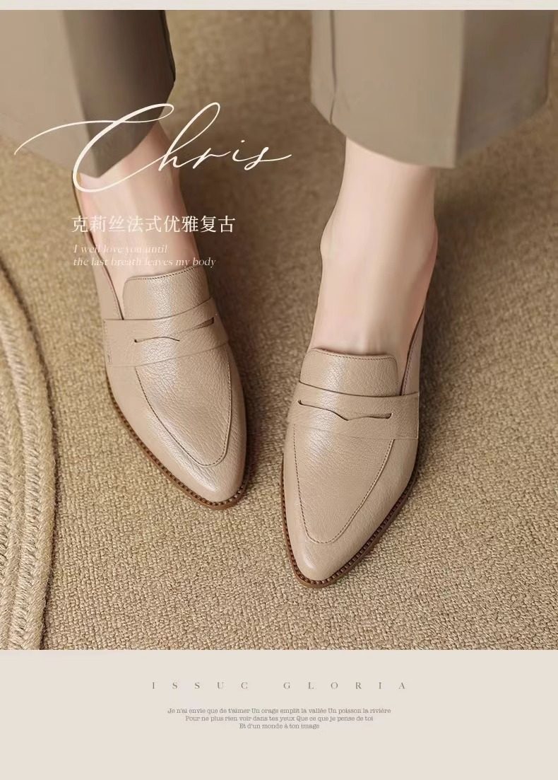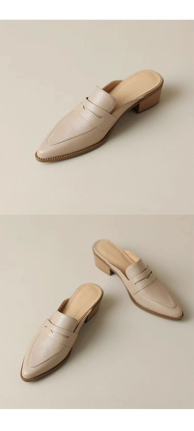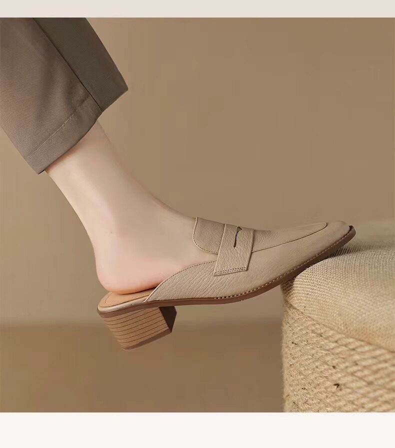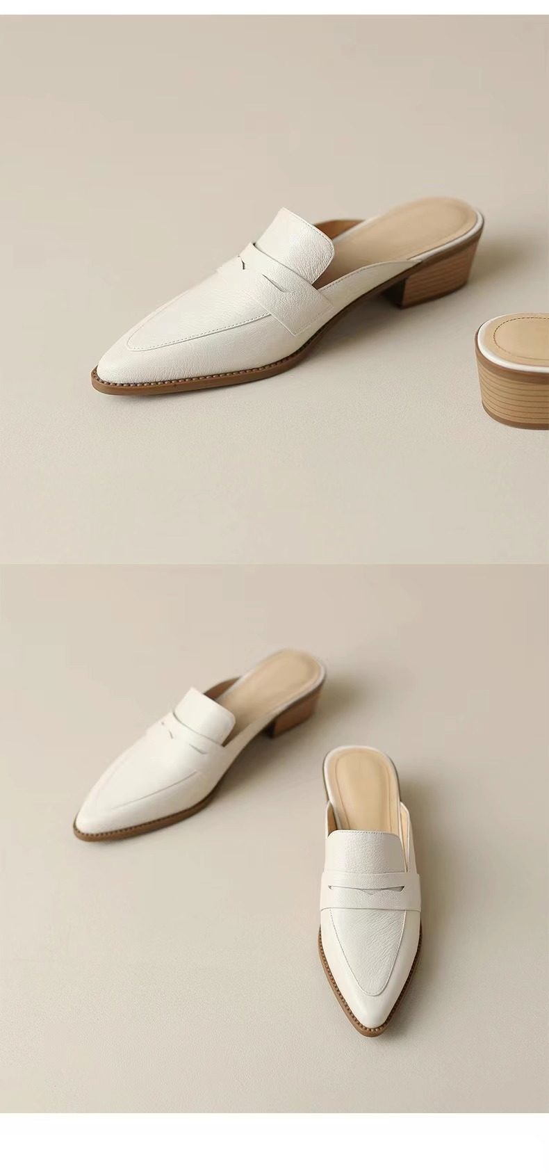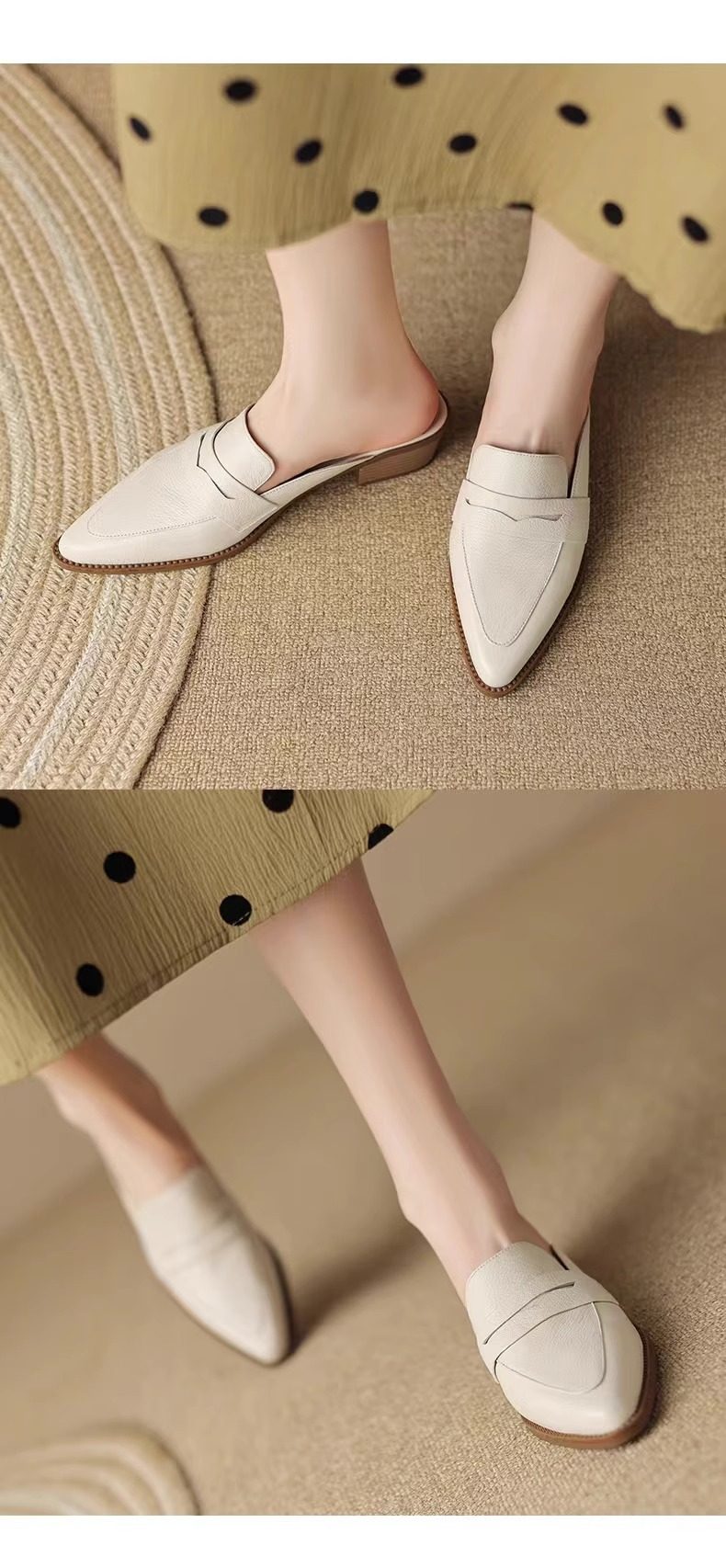青蘊真皮包頭半拖鞋女夏季外穿2025年新款時尚粗跟尖頭穆勒涼拖鞋