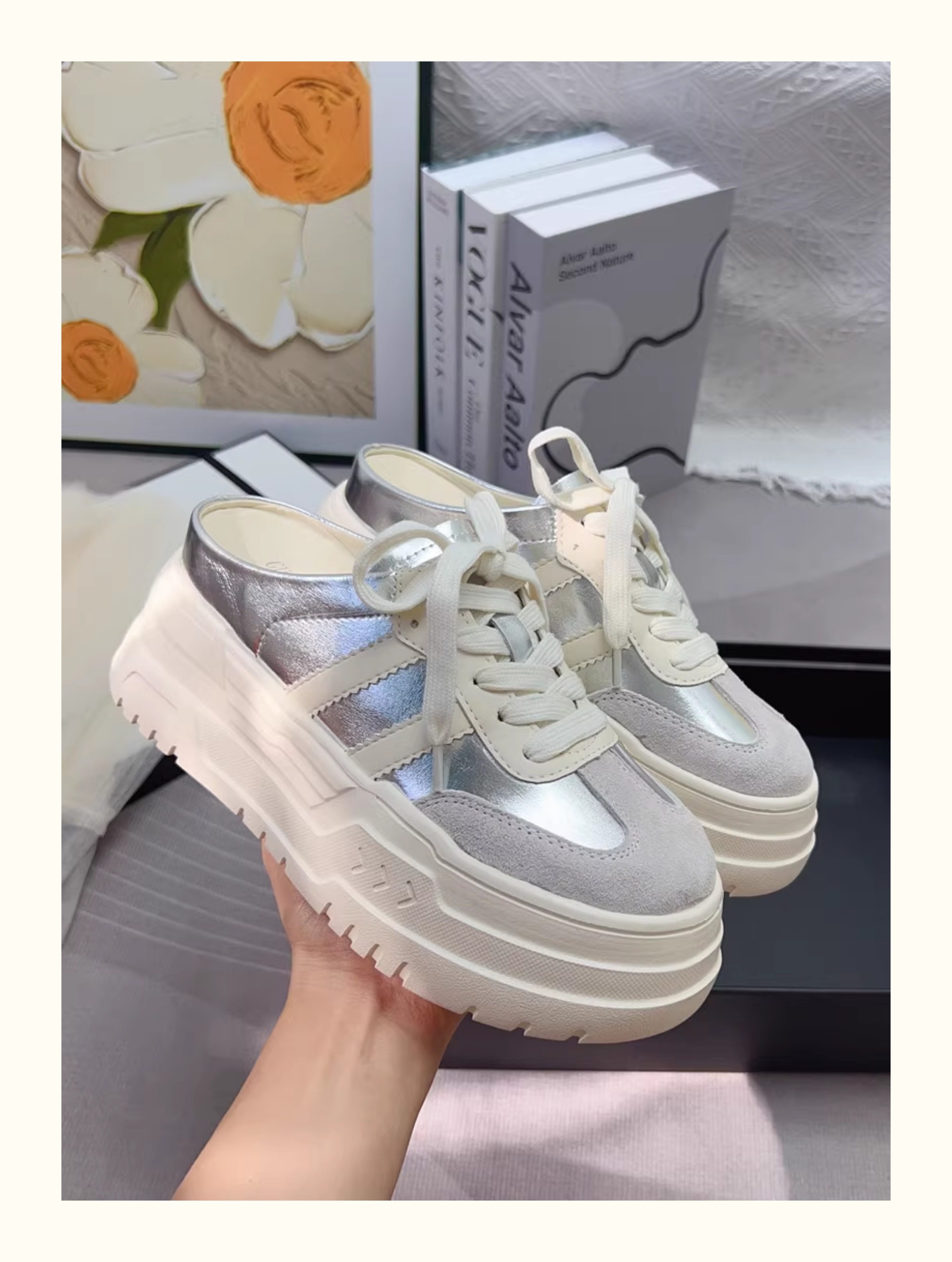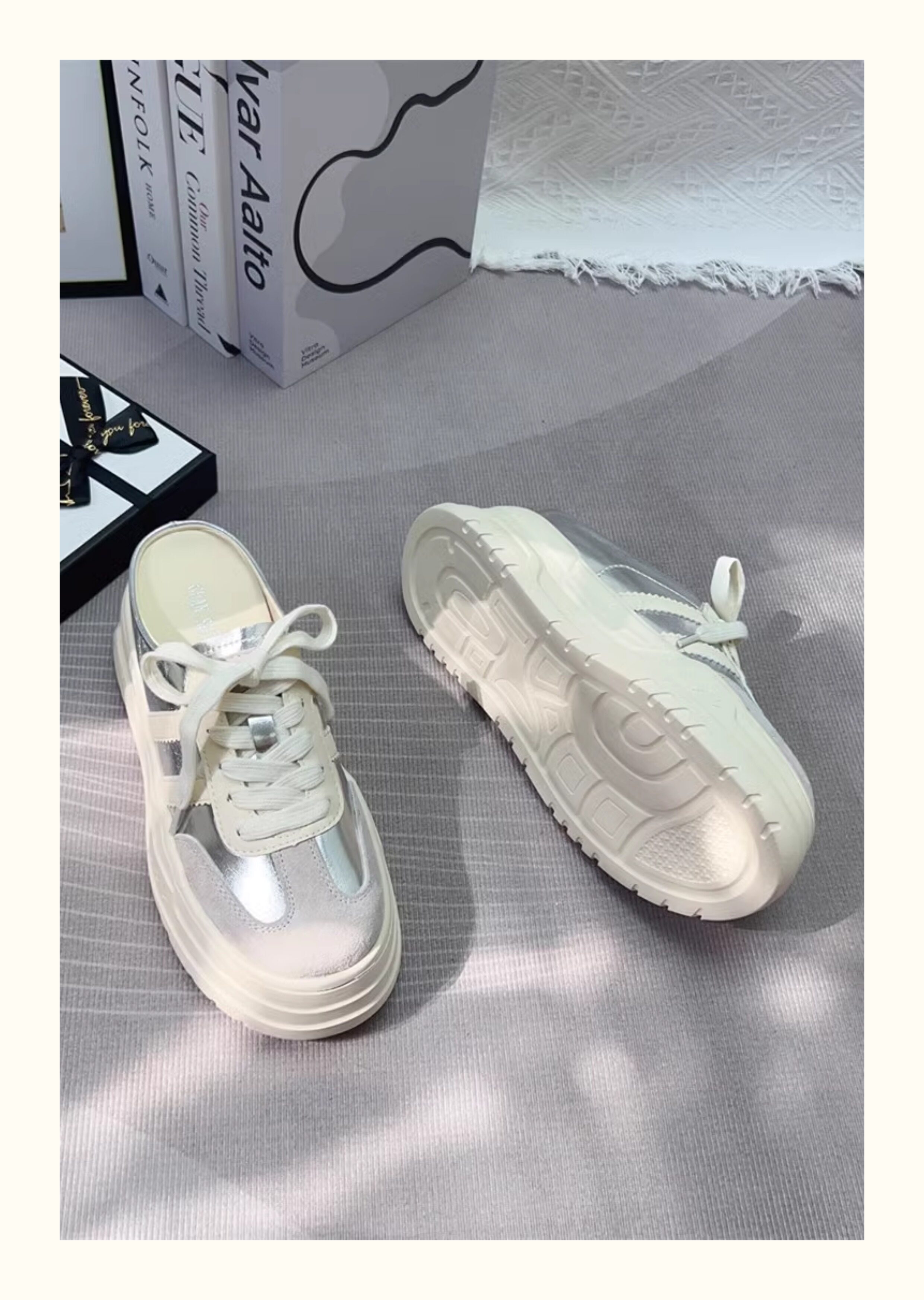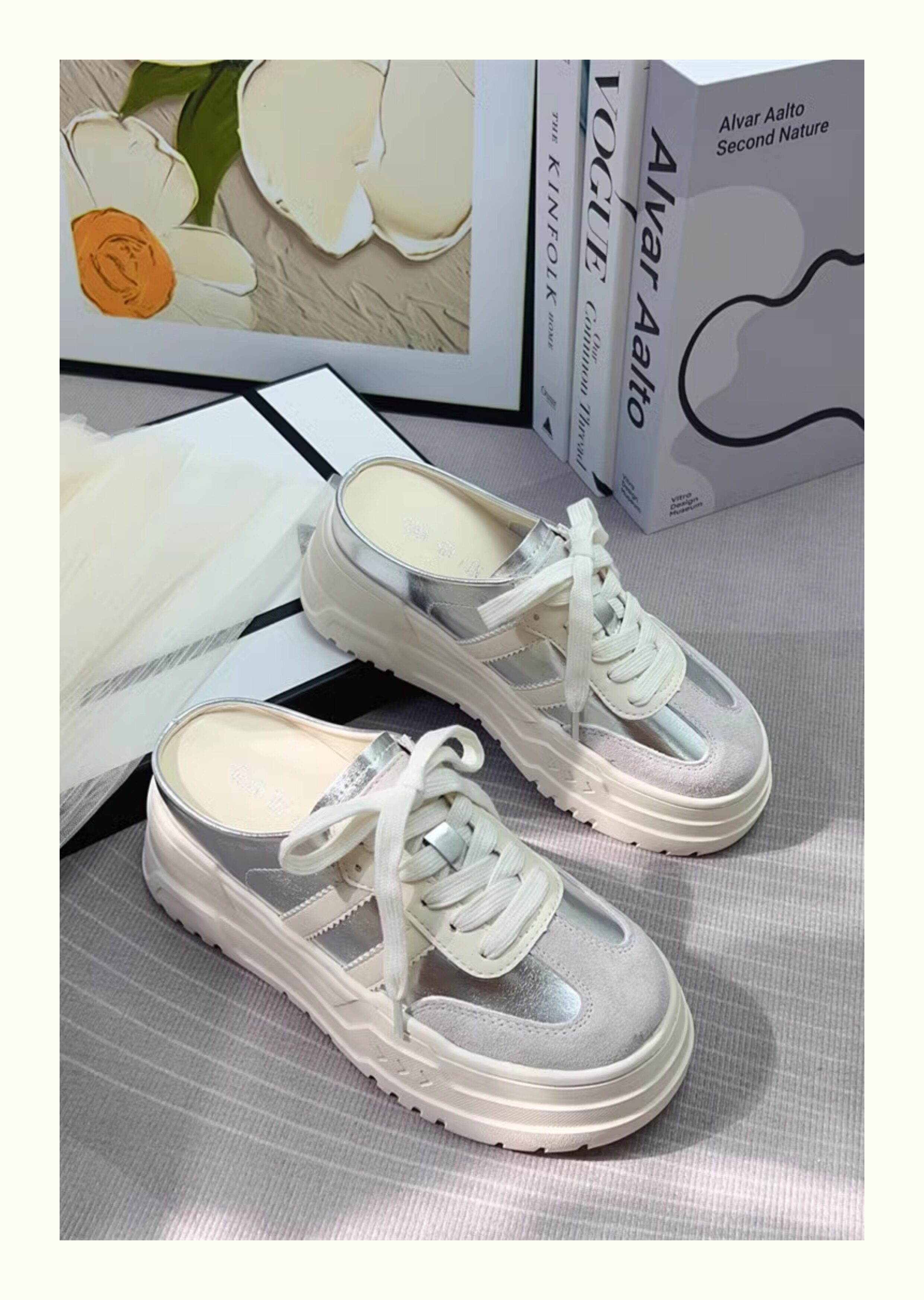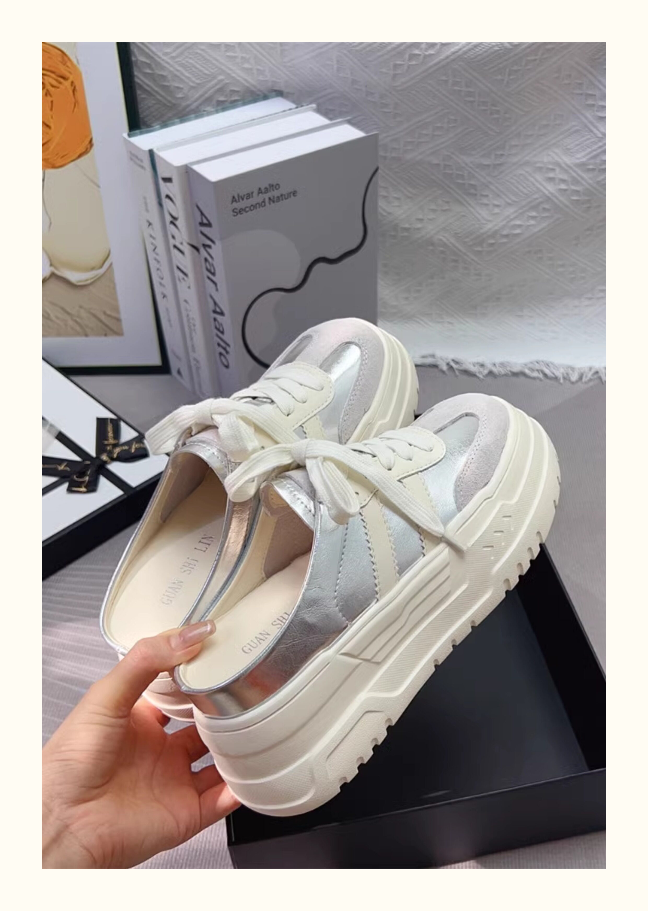 小個子內增高包頭半拖鞋女厚底休閒德訓鞋無後跟銀色穆勒鞋ins潮
