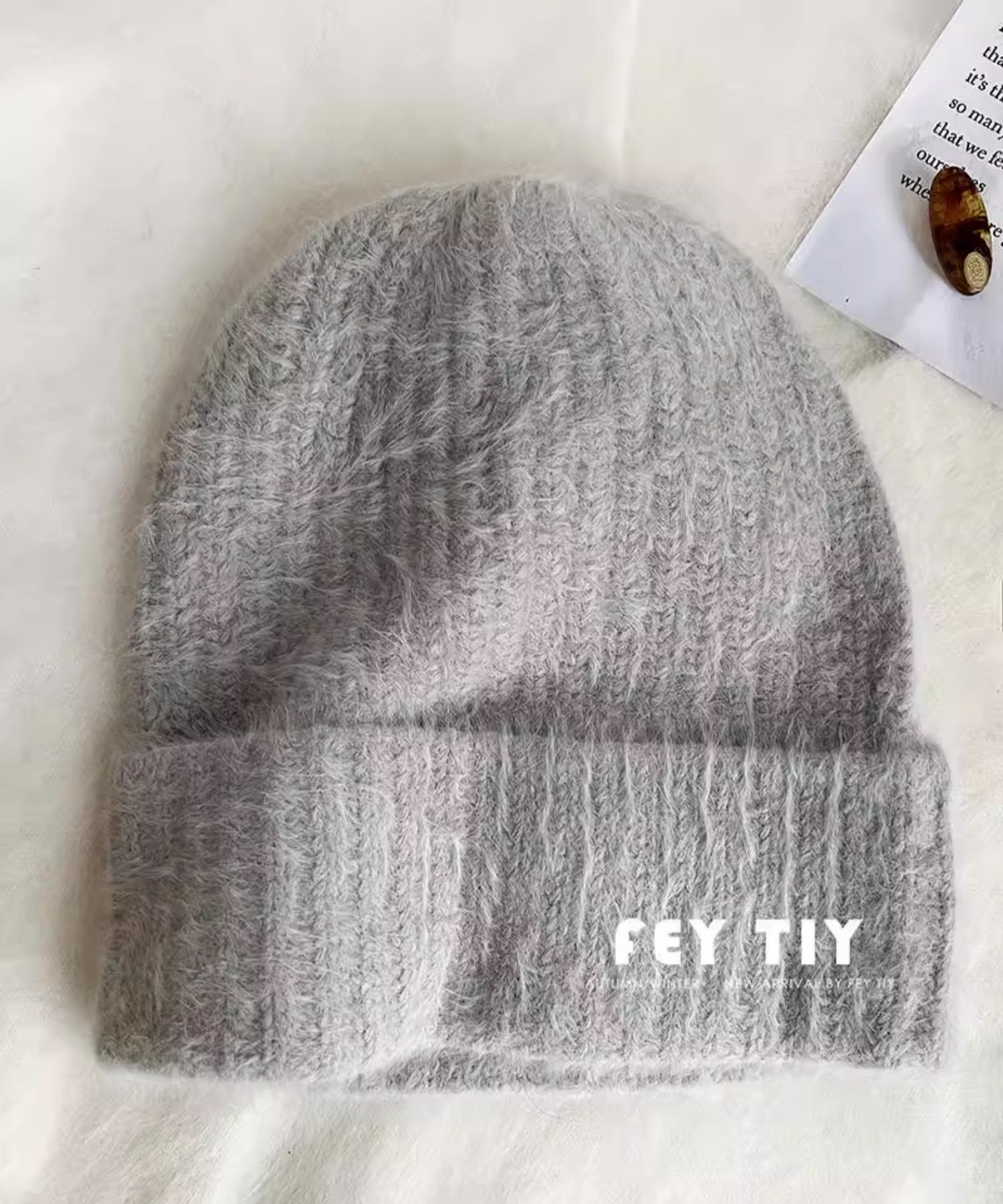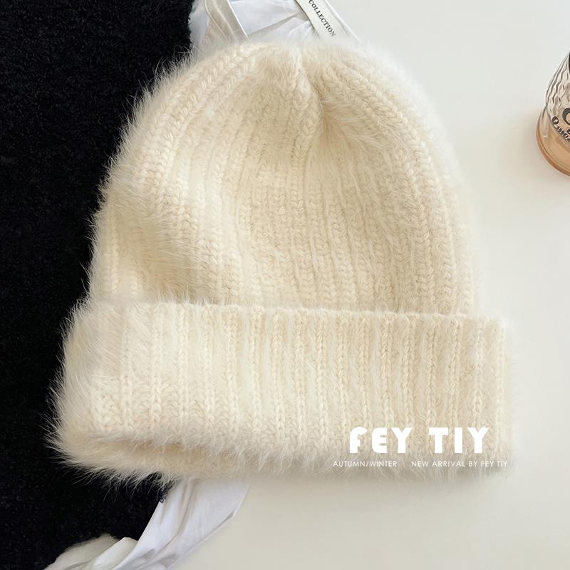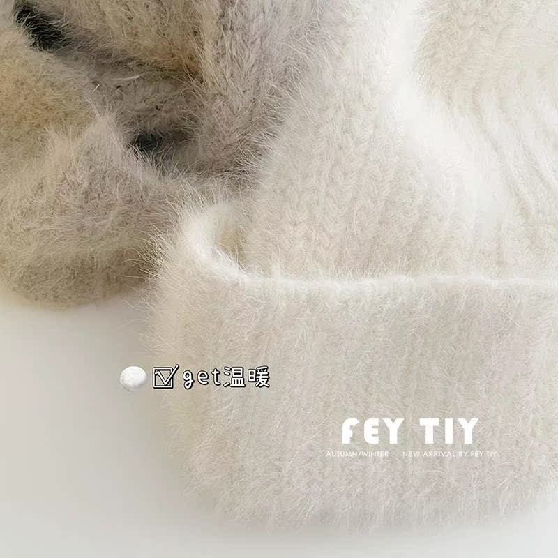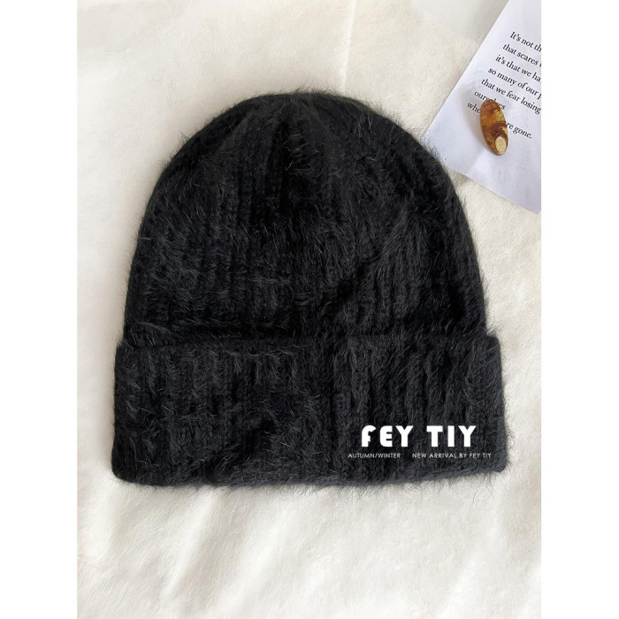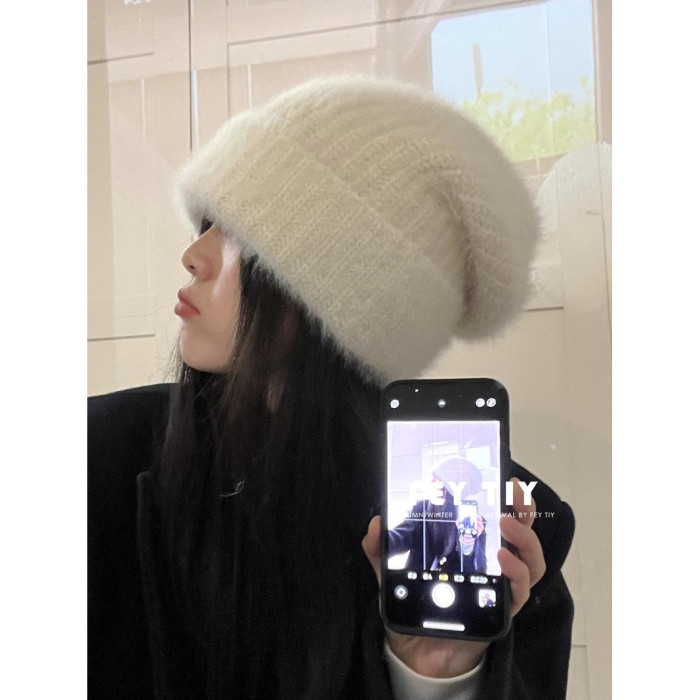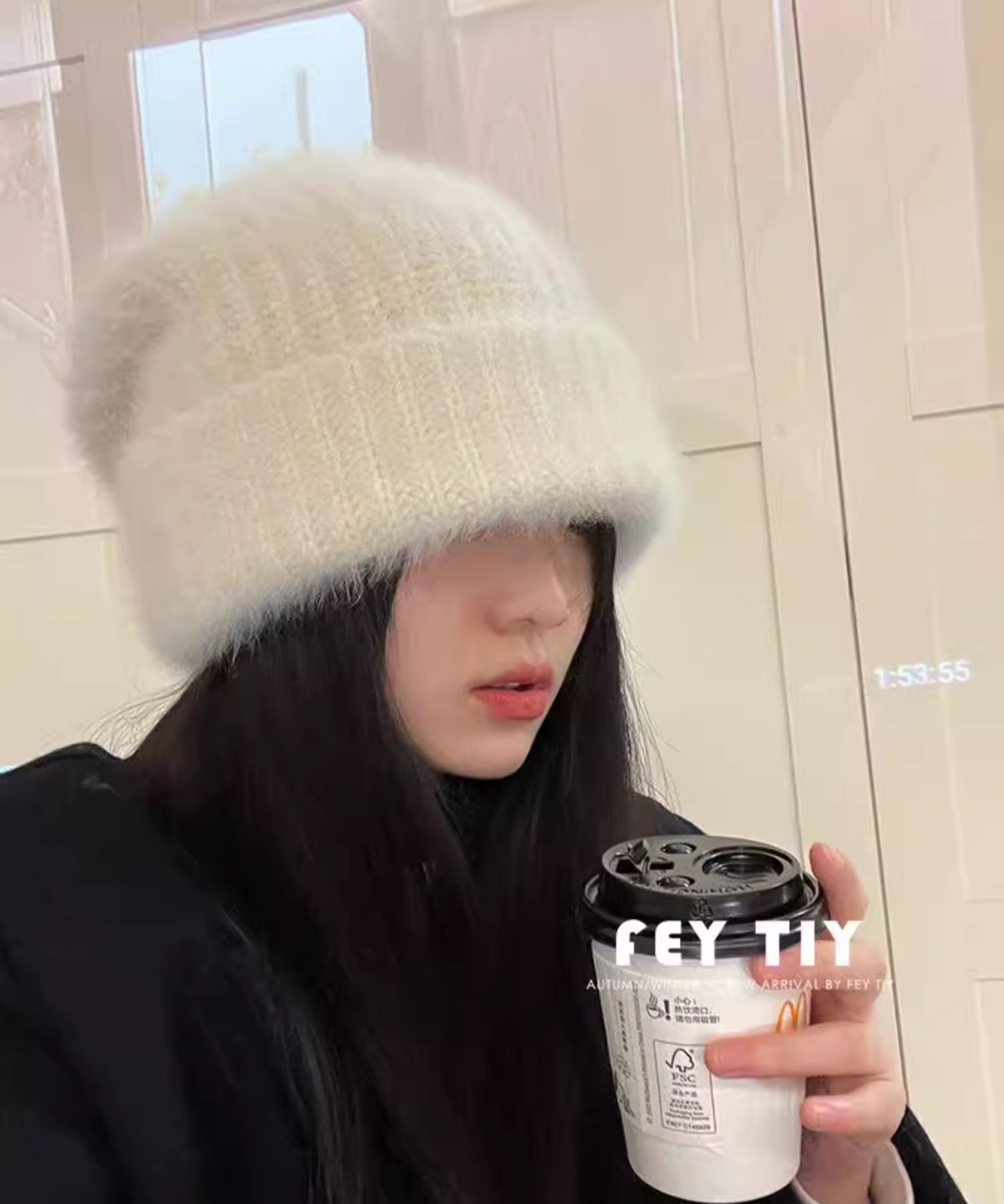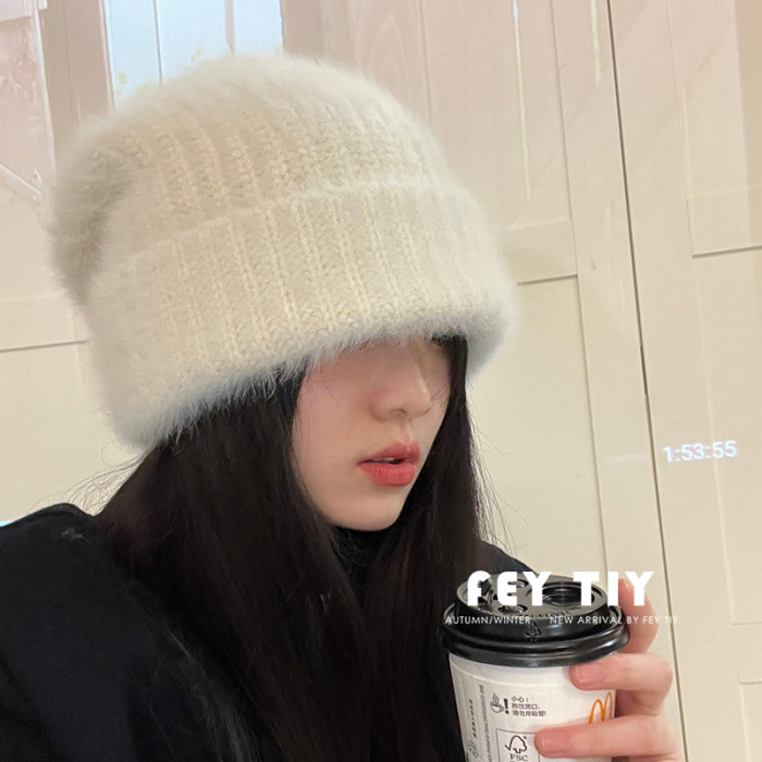 毛茸茸的兔毛帽子大頭圍毛線帽女秋冬保暖粗線針織帽白色冷帽帽子