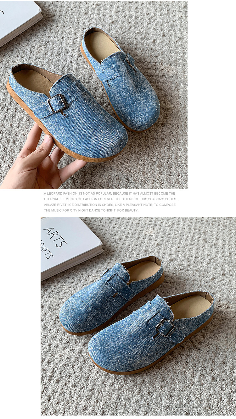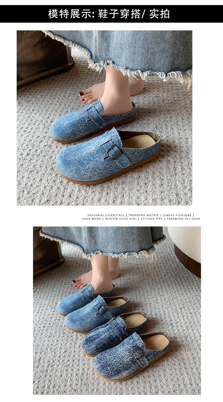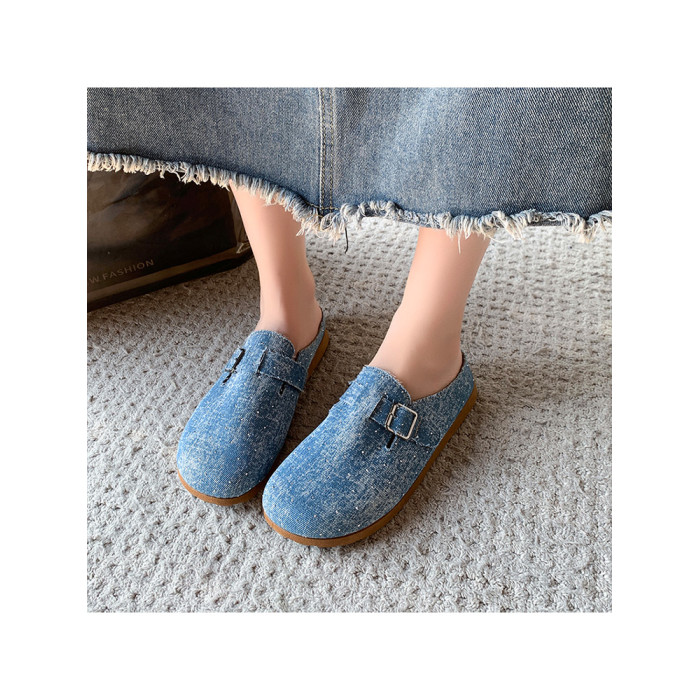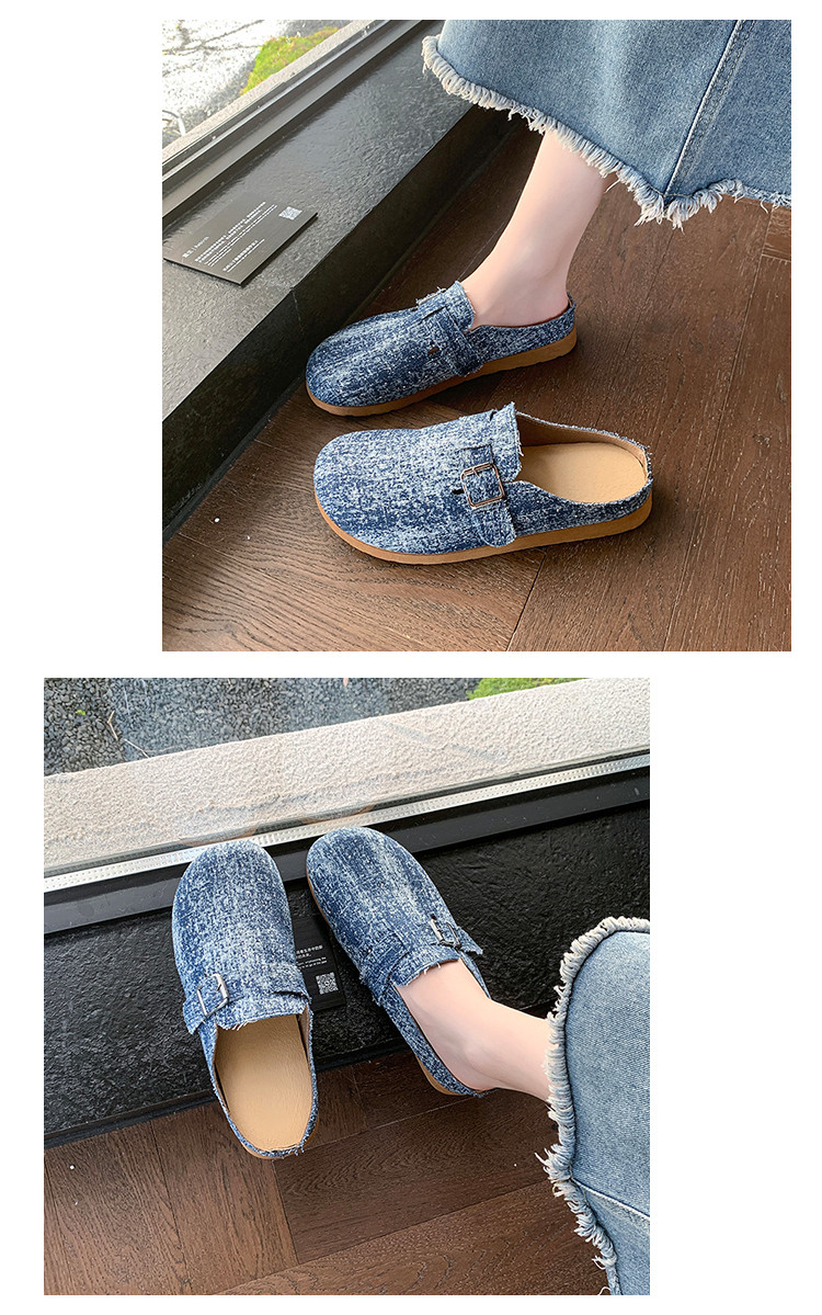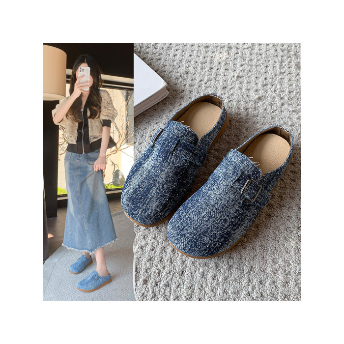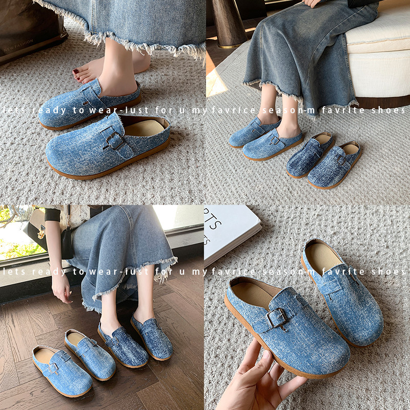 復古森系軟木底勃肯鞋懶人一腳蹬牛仔布包頭半拖鞋女外穿後空涼拖
