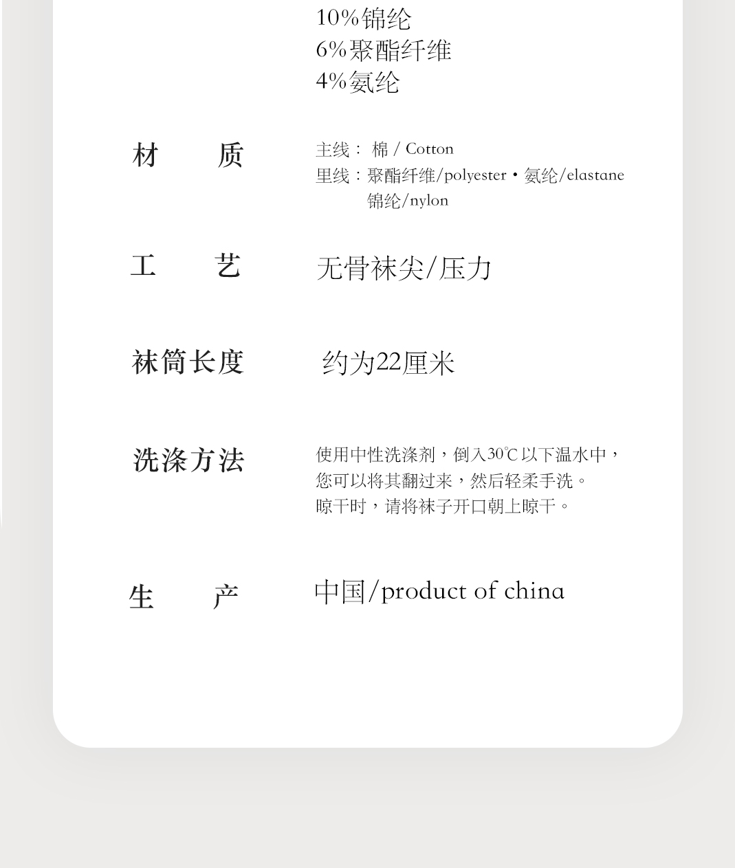 | 面料材質成分 | 棉80% 聚醯胺纖維(錦綸)10% 聚酯纖維6% 聚氨酯彈性纖維(氨綸)4% |