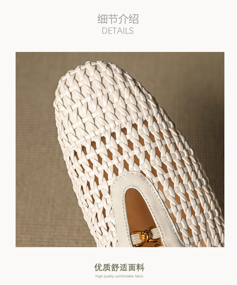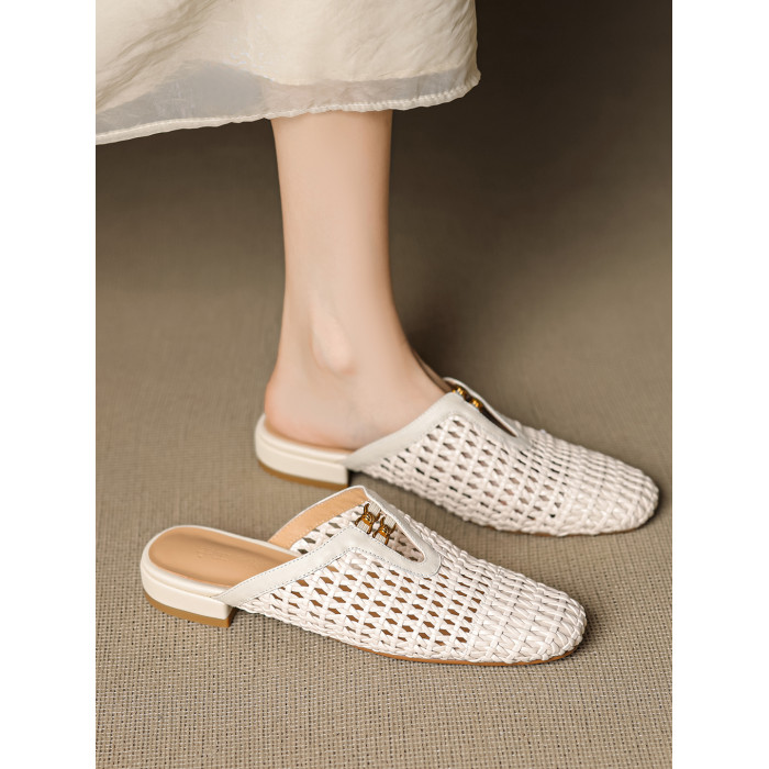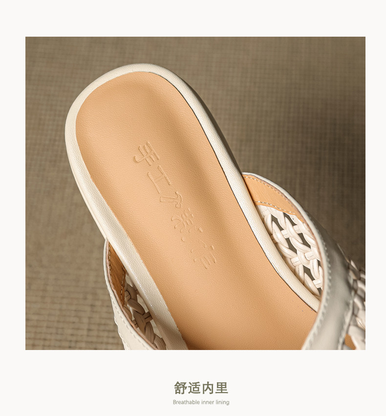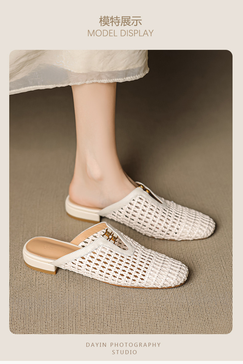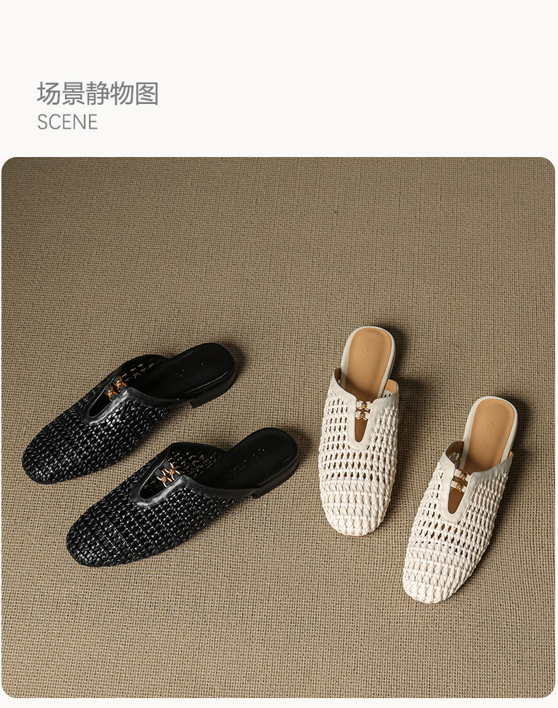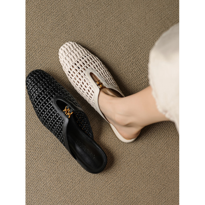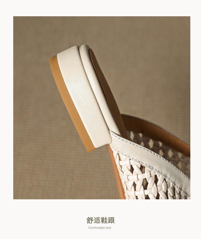 法式真皮編織鏤空洞洞鞋圓頭穆勒半拖女夏季外穿粗跟包頭涼拖鞋