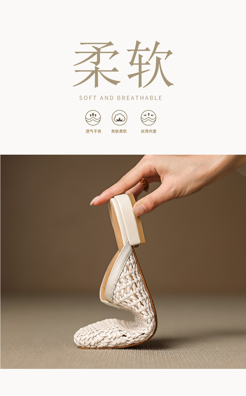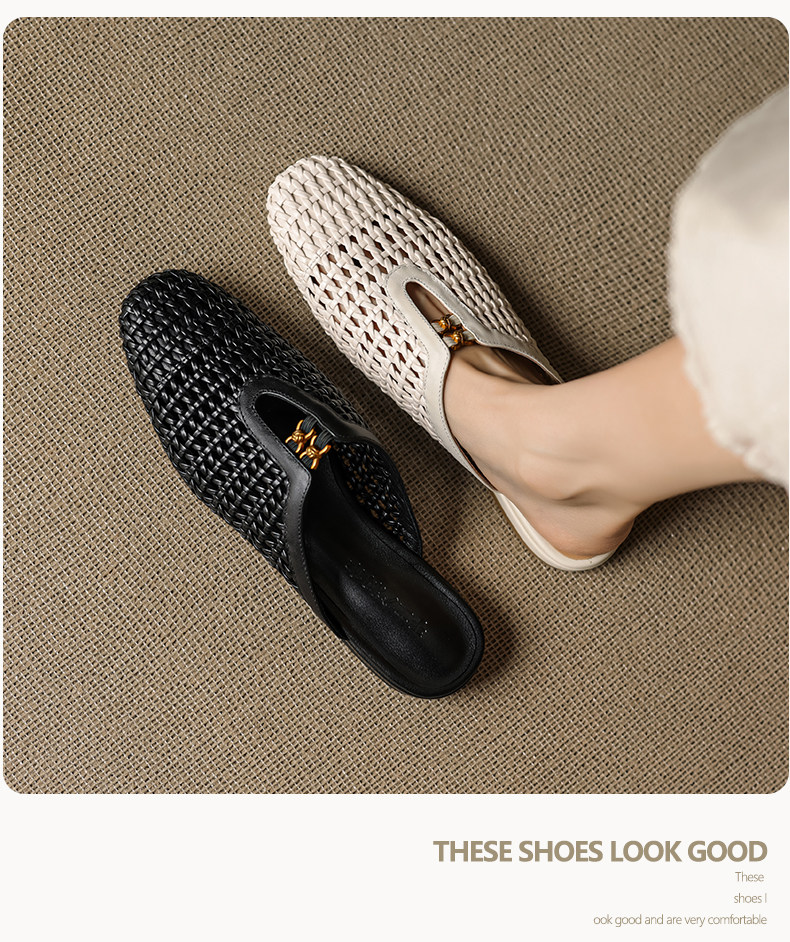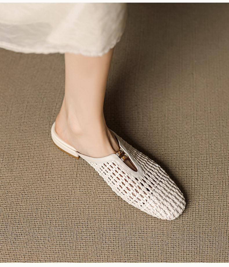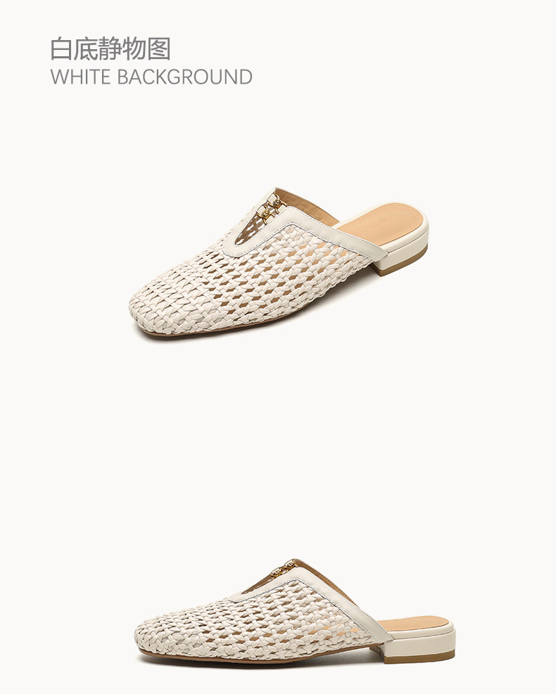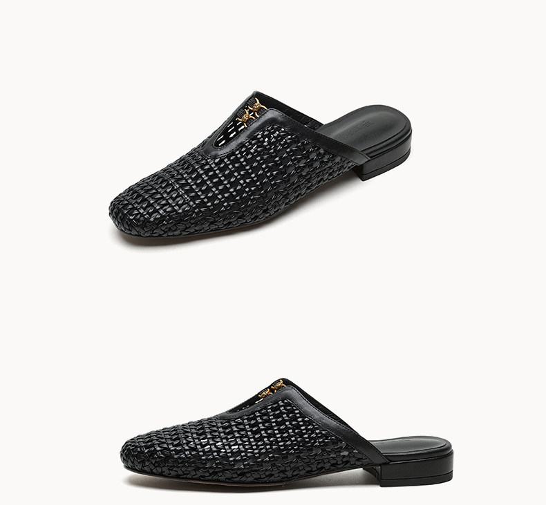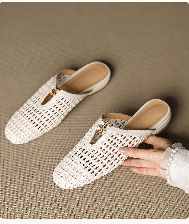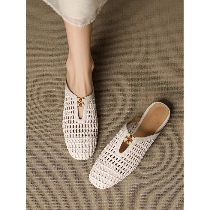 法式真皮編織鏤空洞洞鞋圓頭穆勒半拖女夏季外穿粗跟包頭涼拖鞋
