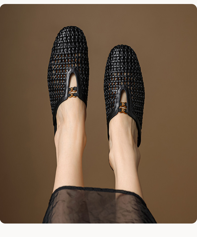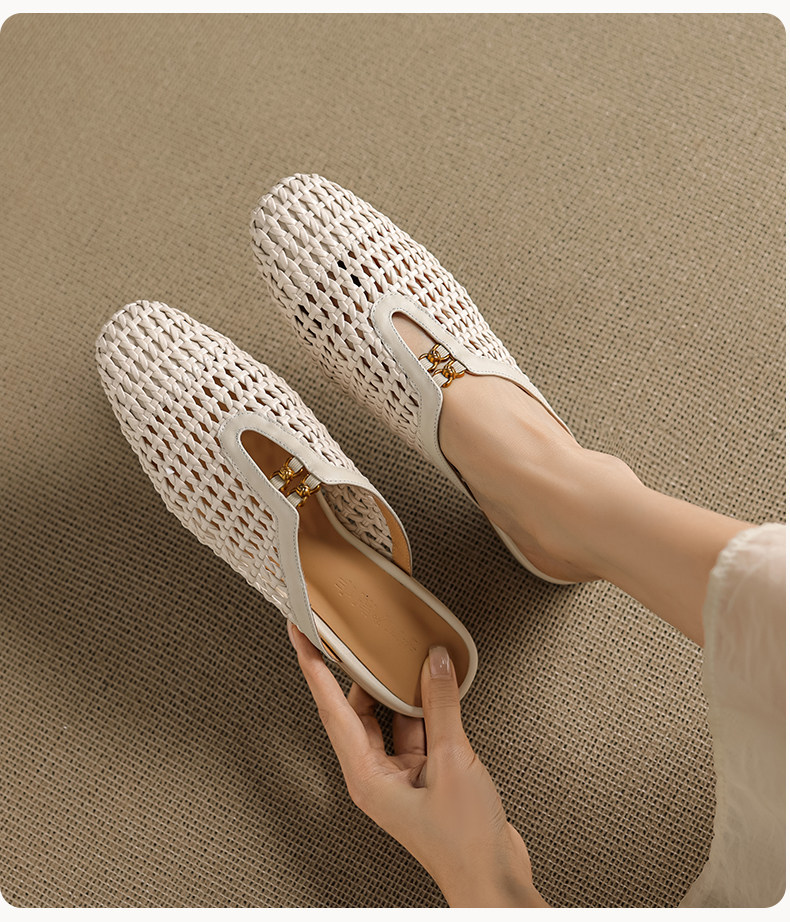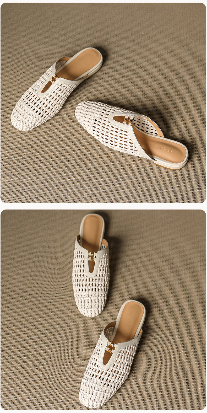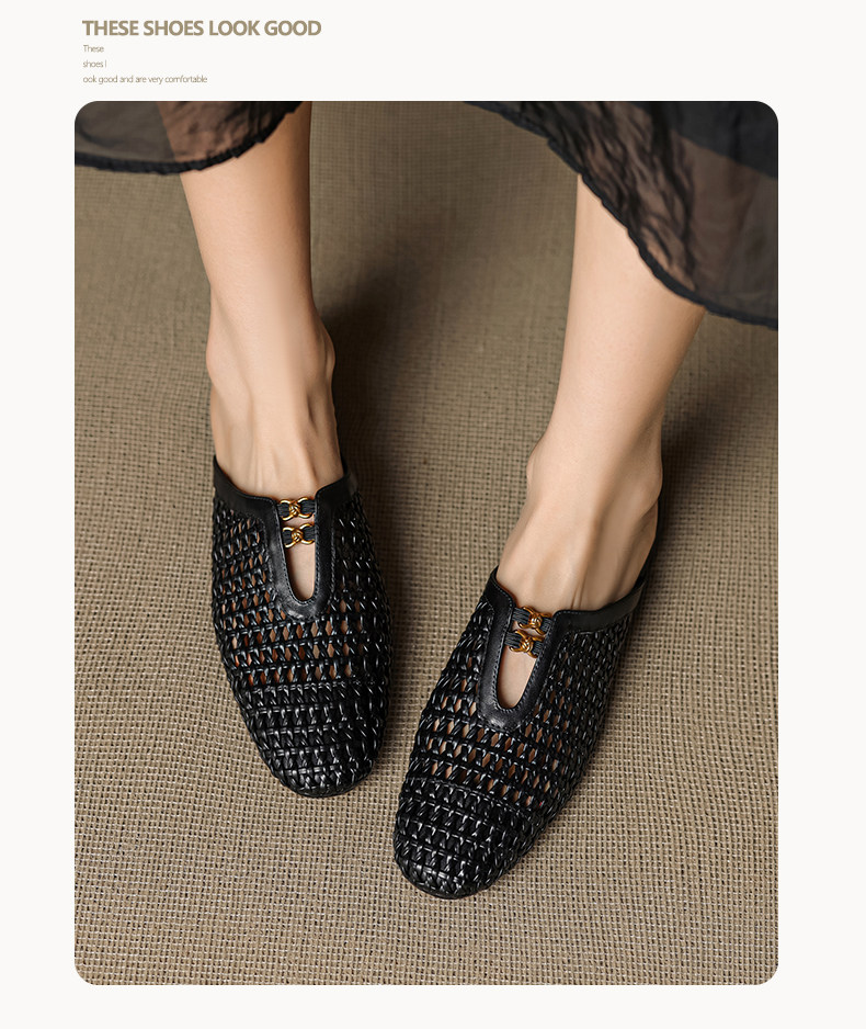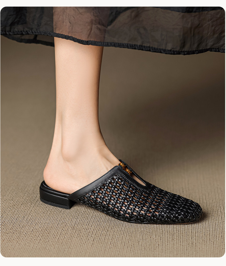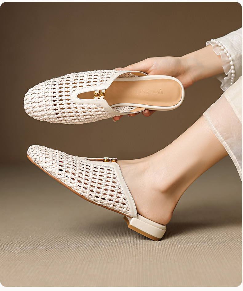 法式真皮編織鏤空洞洞鞋圓頭穆勒半拖女夏季外穿粗跟包頭涼拖鞋