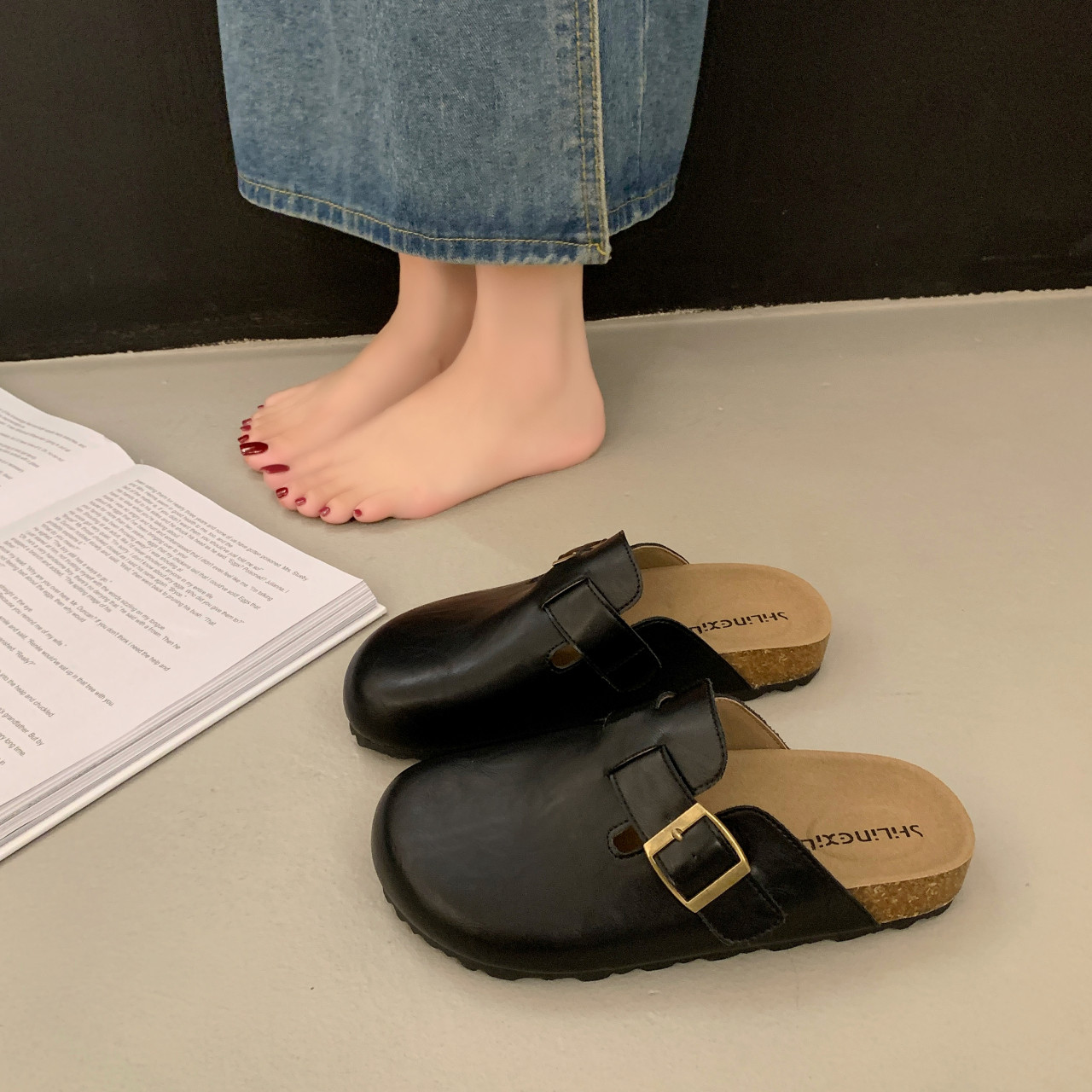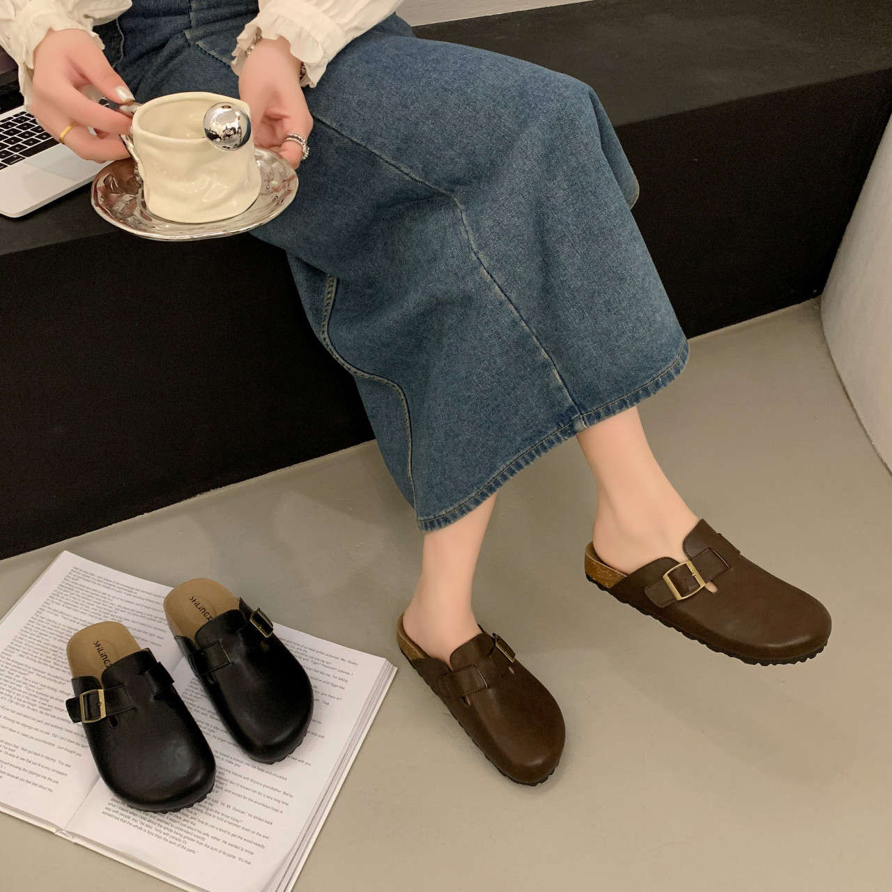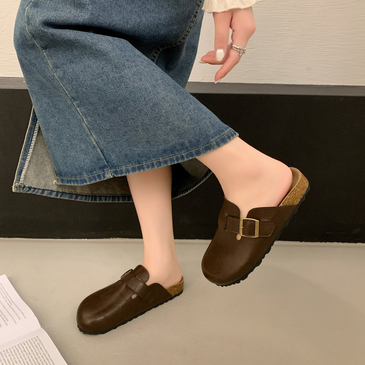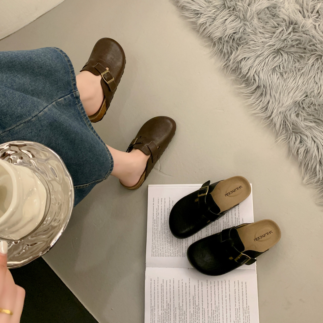 真皮厚底勃肯鞋包頭半拖鞋女外穿2025新款秋季一腳蹬醜萌博肯半托