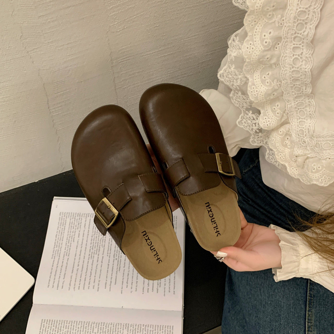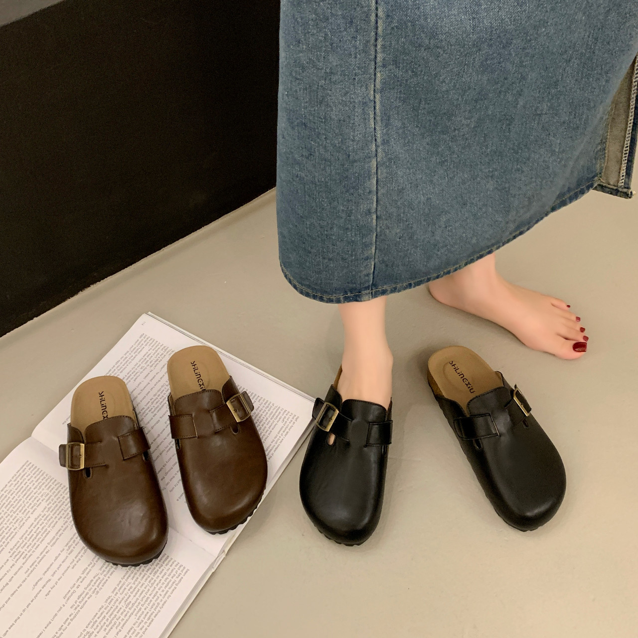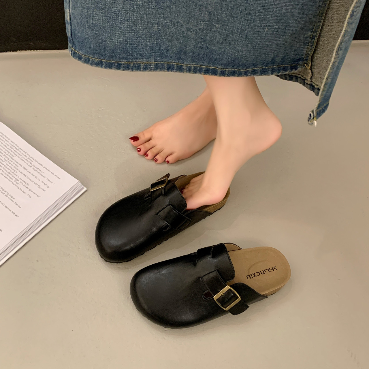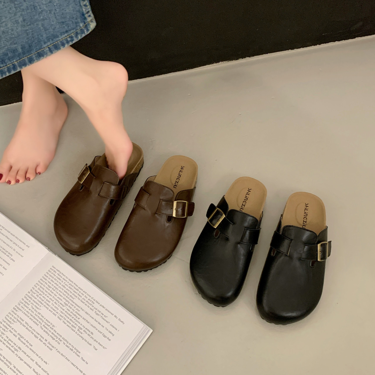 真皮厚底勃肯鞋包頭半拖鞋女外穿2025新款秋季一腳蹬醜萌博肯半托