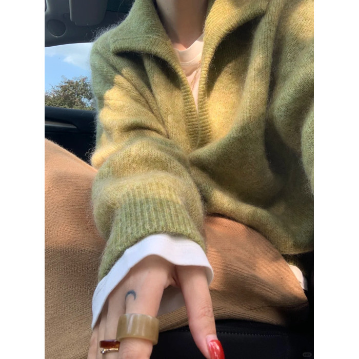 歐貨老錢風綠色v領馬海毛毛衣女秋冬慵懶高級感加厚翻領針織上衣