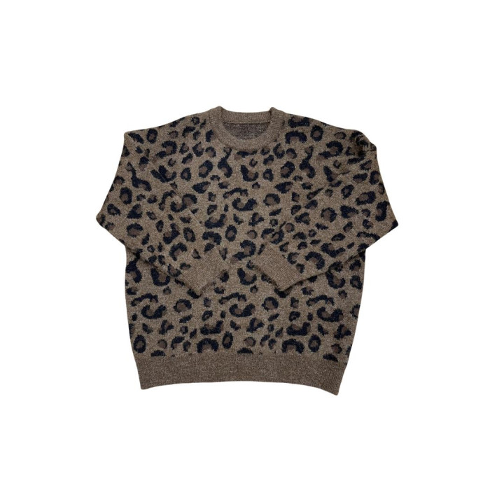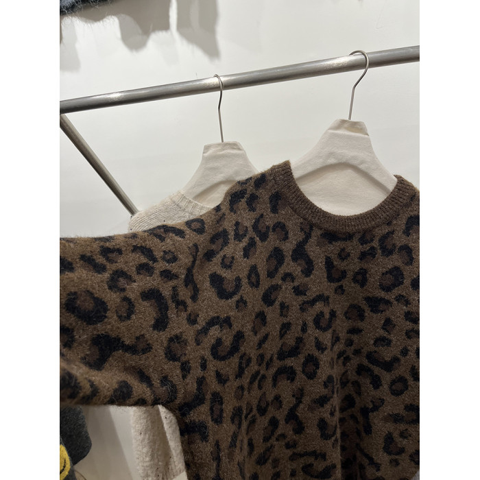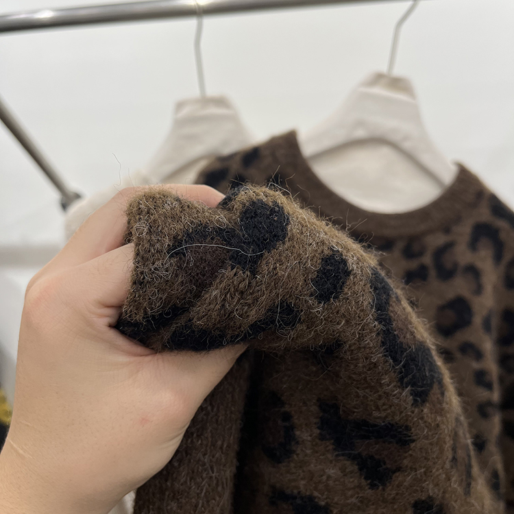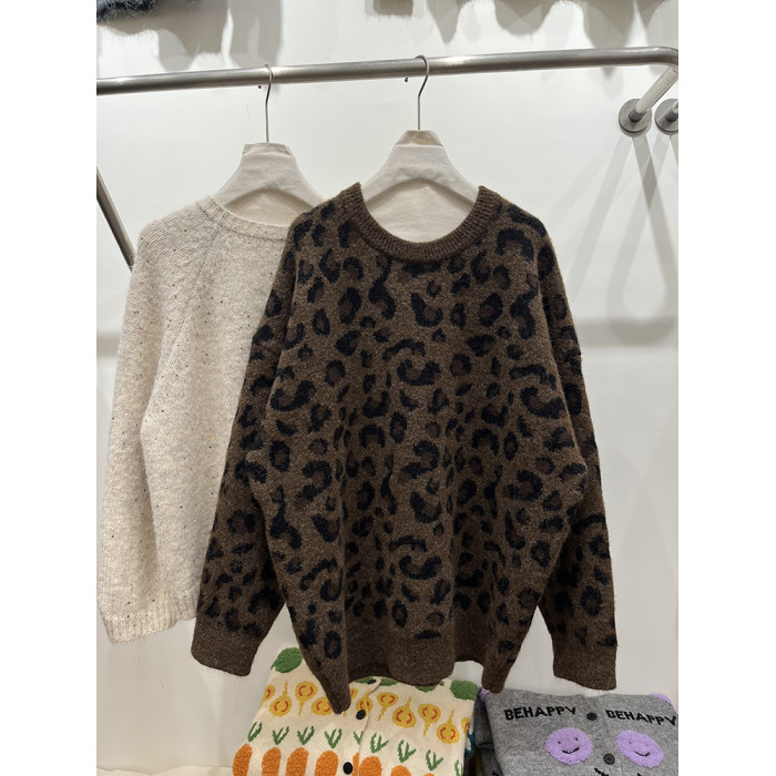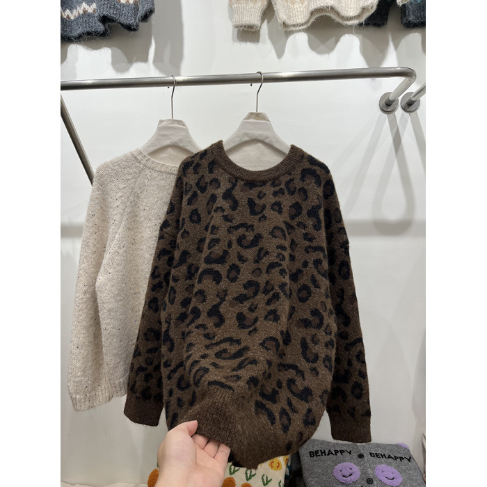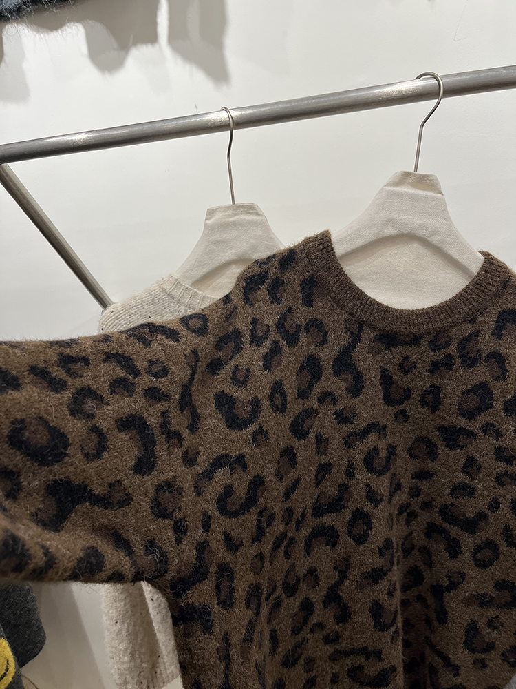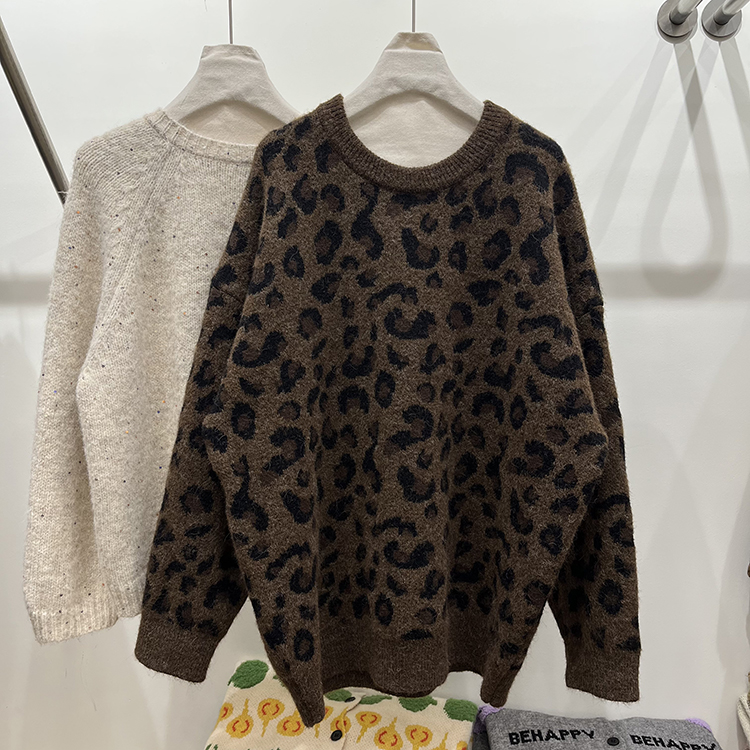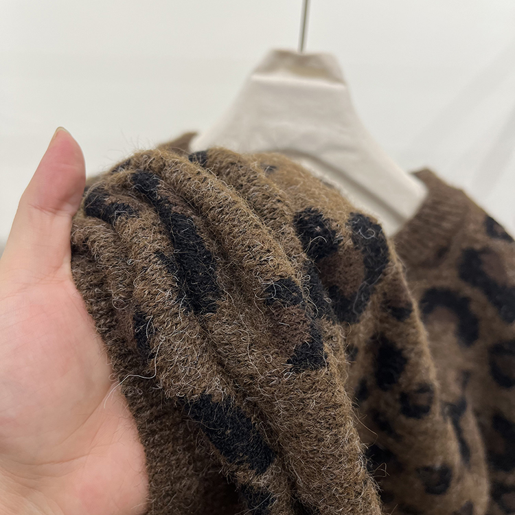 高級感圓領套頭豹紋毛衣女秋冬加厚寬松慵懶風氣質軟糯針織衫上衣
