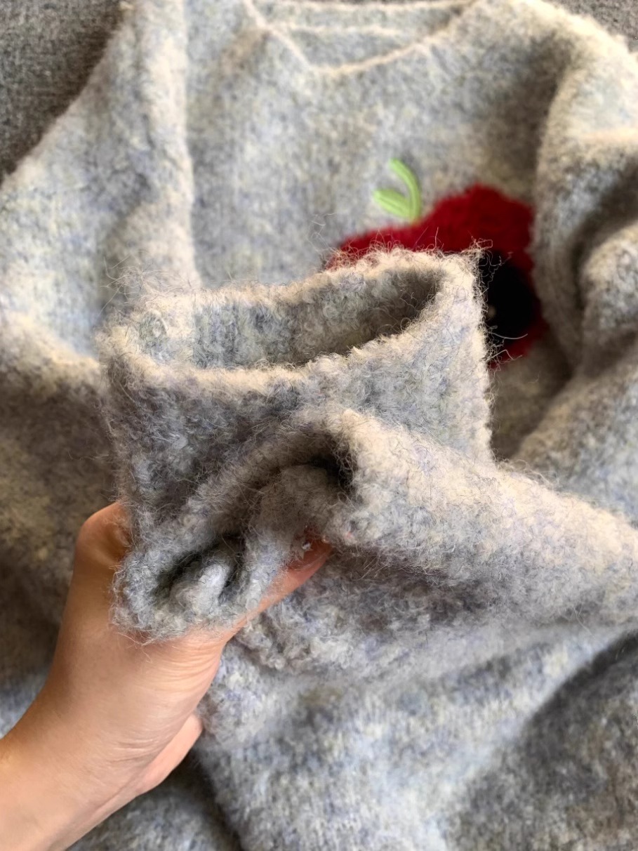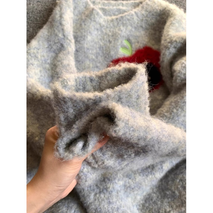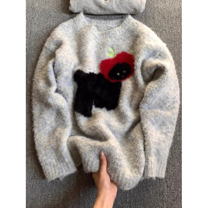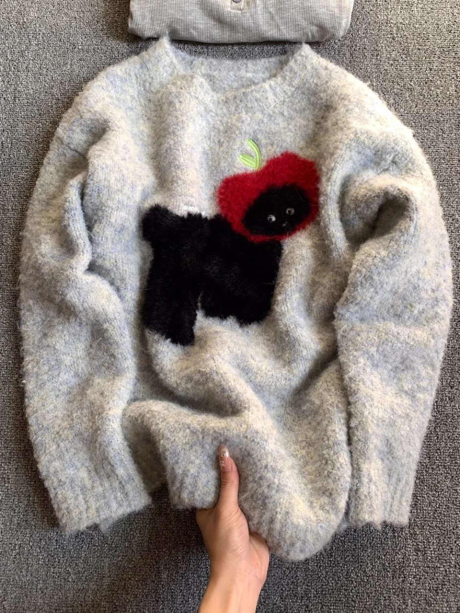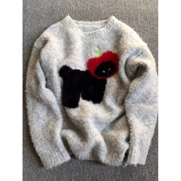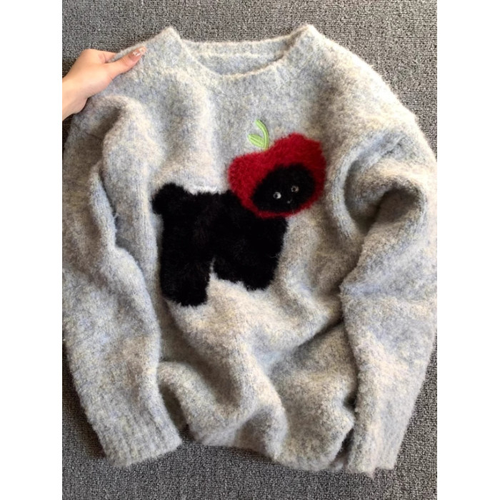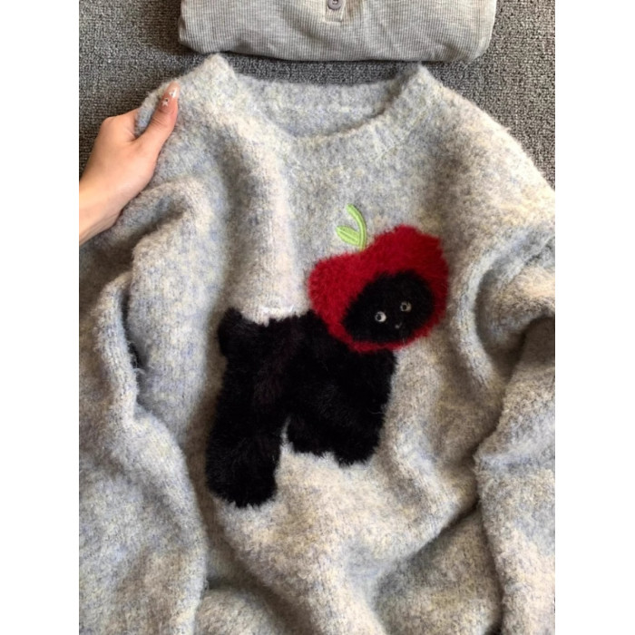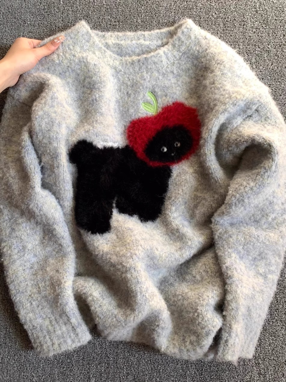 灰色小狗圓領套頭毛衣女冬季加厚秋冬慵懶風小個子正肩內搭針織衫