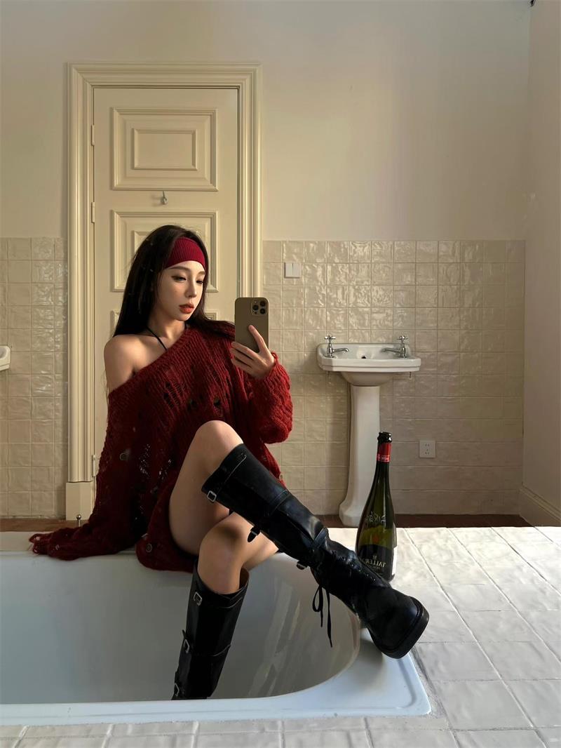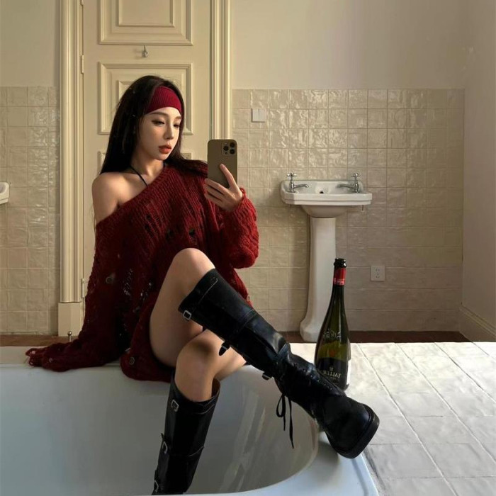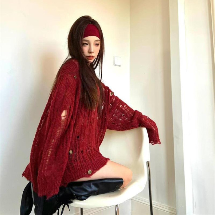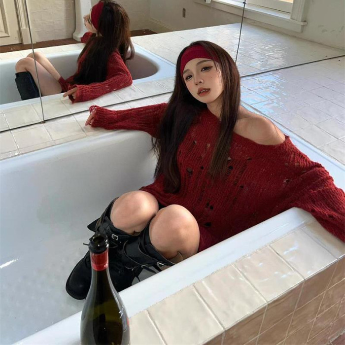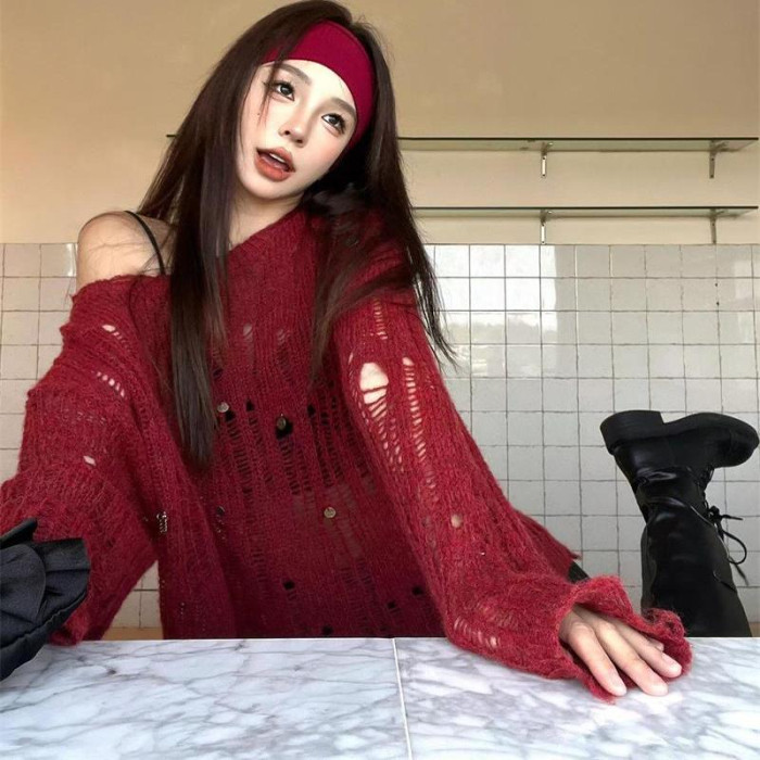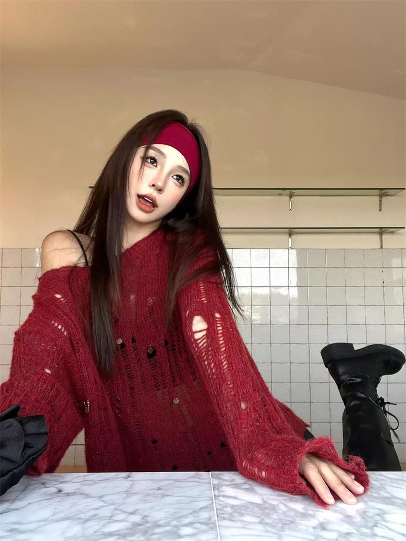 韓系慵懶風紅色套頭鏤空破洞斜肩針織毛衣女秋冬寬松顯瘦針織罩衫
