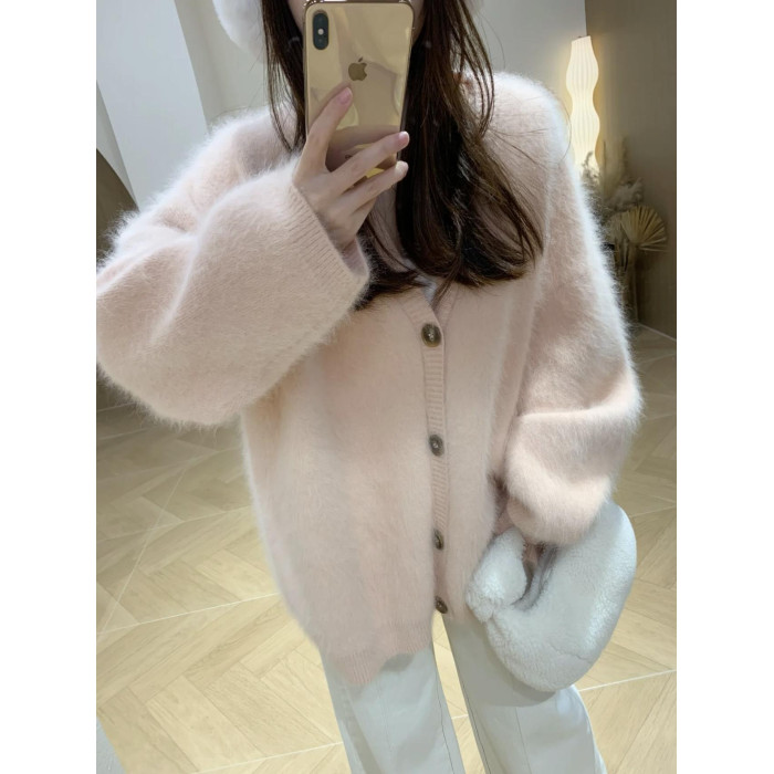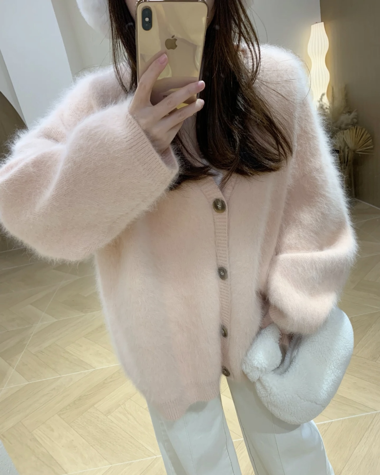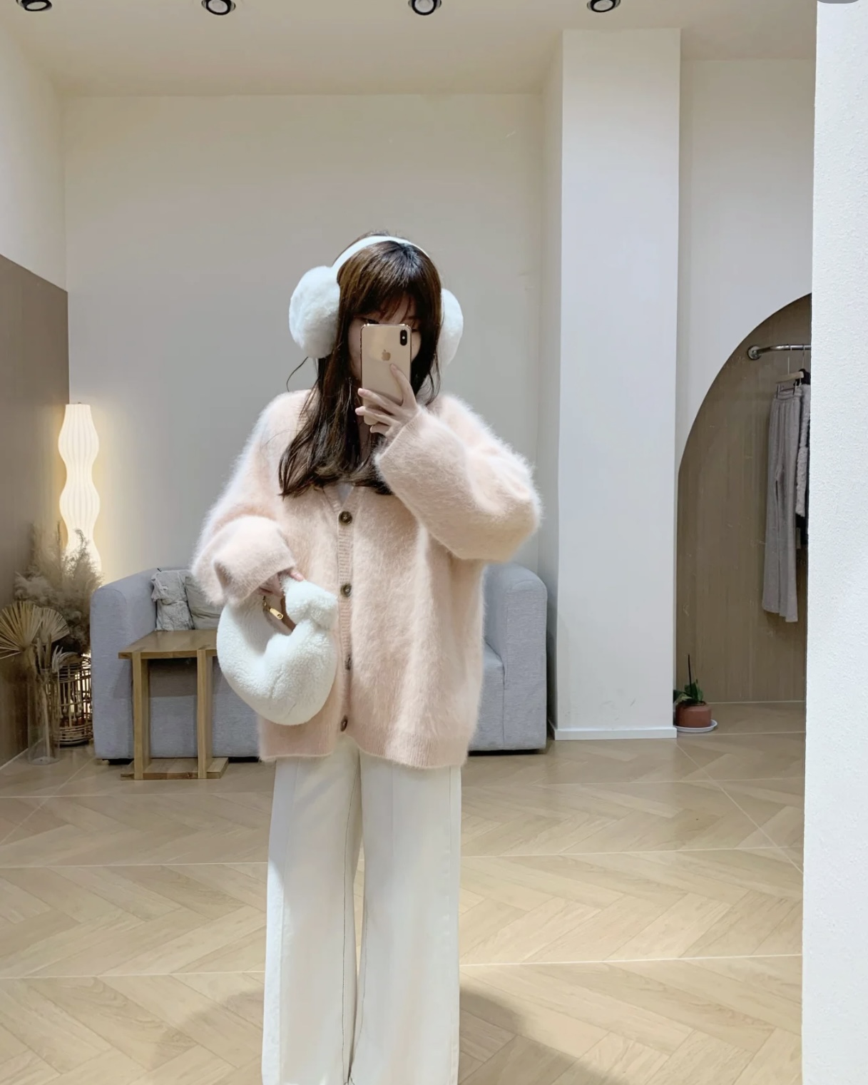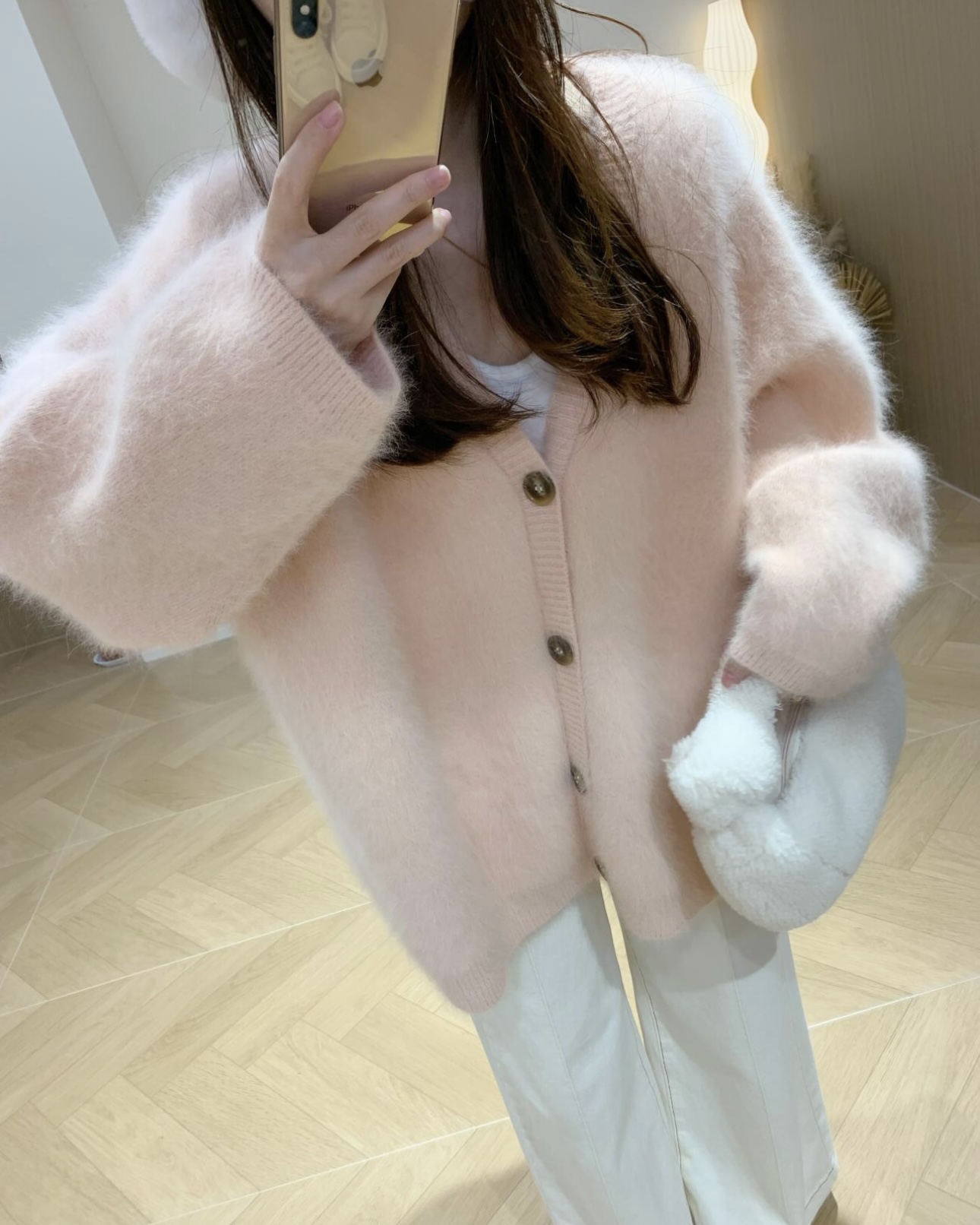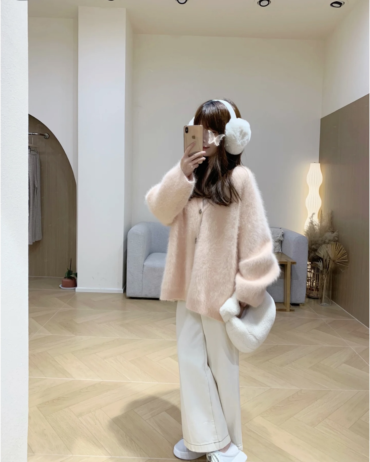 超顯白!冬季氛圍感奶huhu毛衣外套中長款韓版v領慵懶風寬松加厚