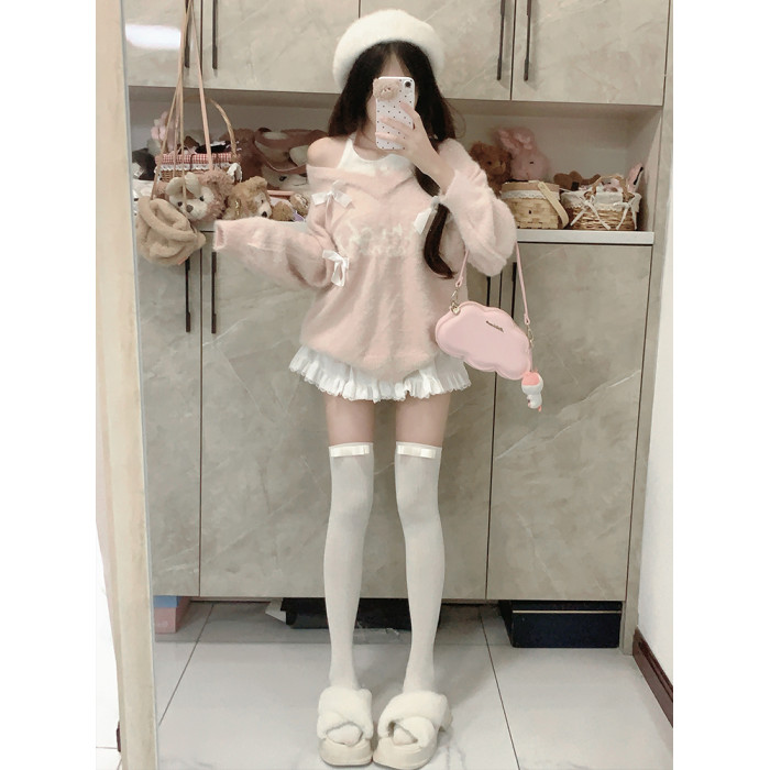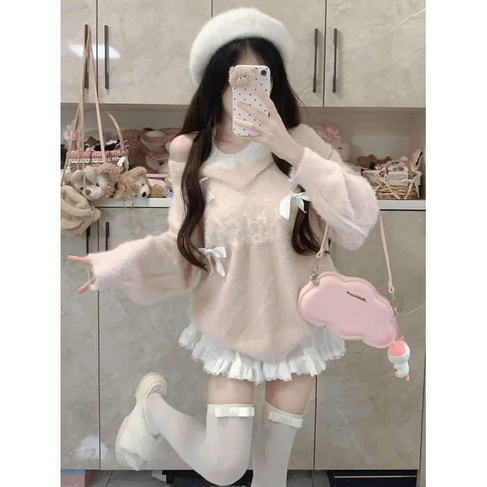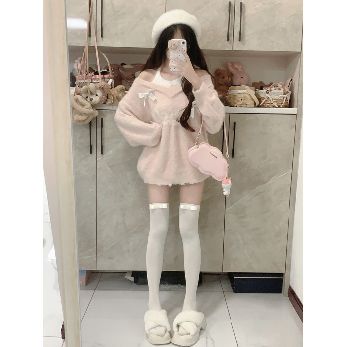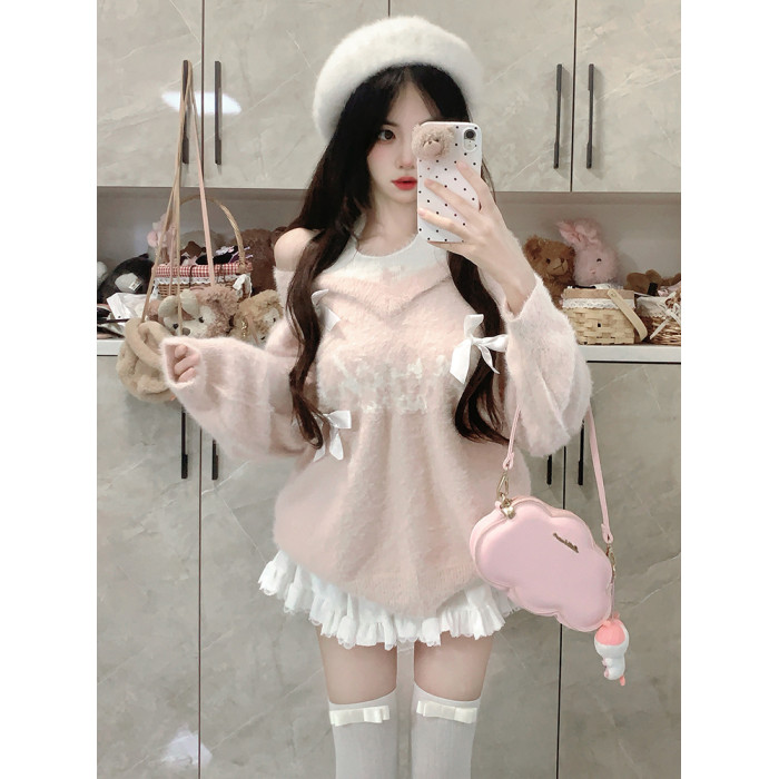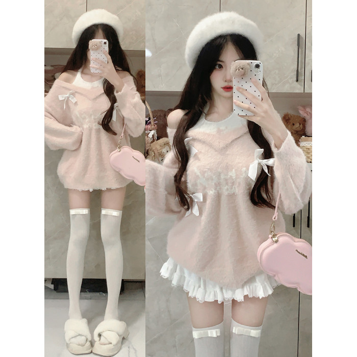 甜辣拼色假兩件v領掛脖毛衣女慵懶風軟糯寬松百搭長袖水貂絨上衣