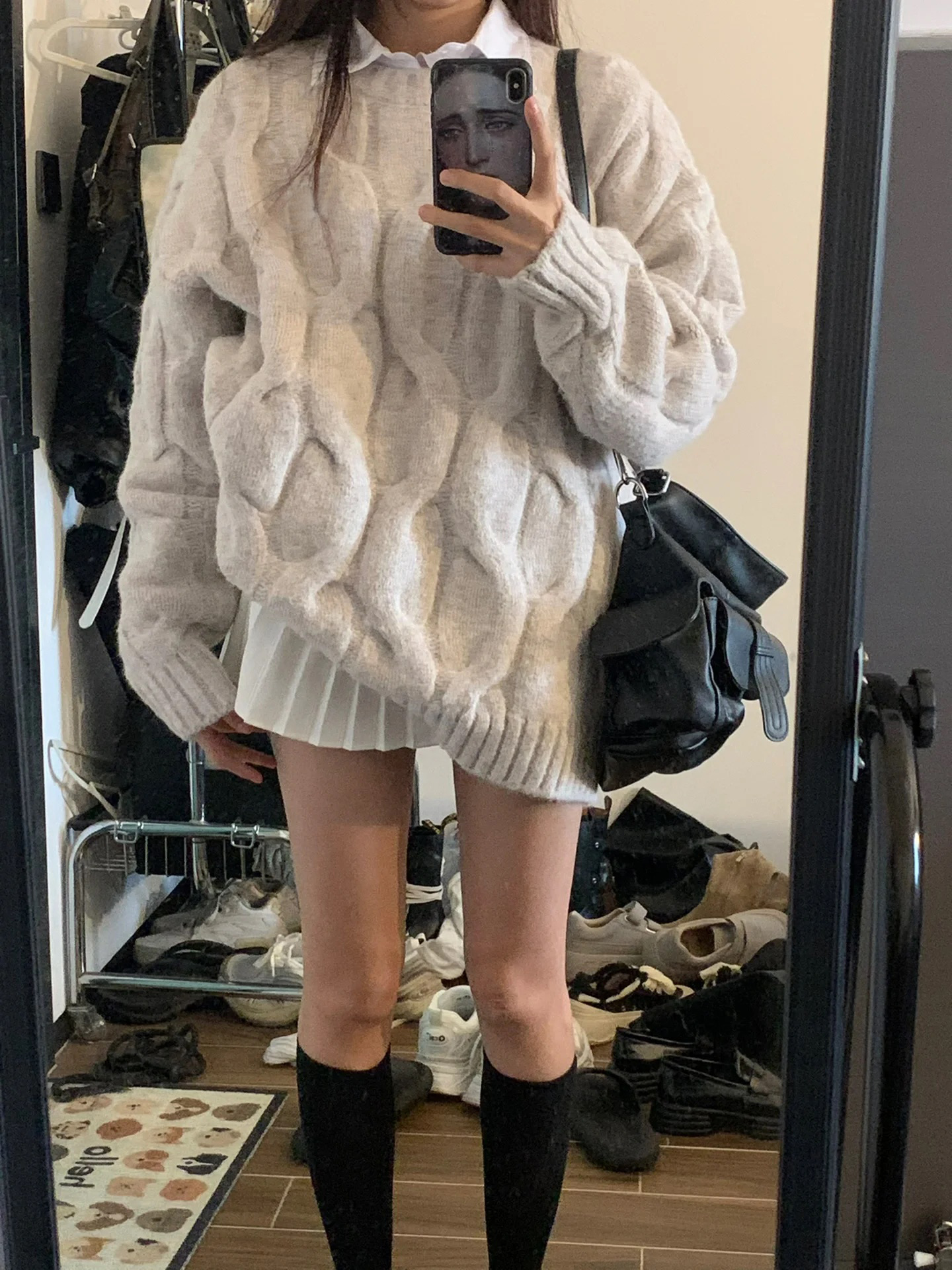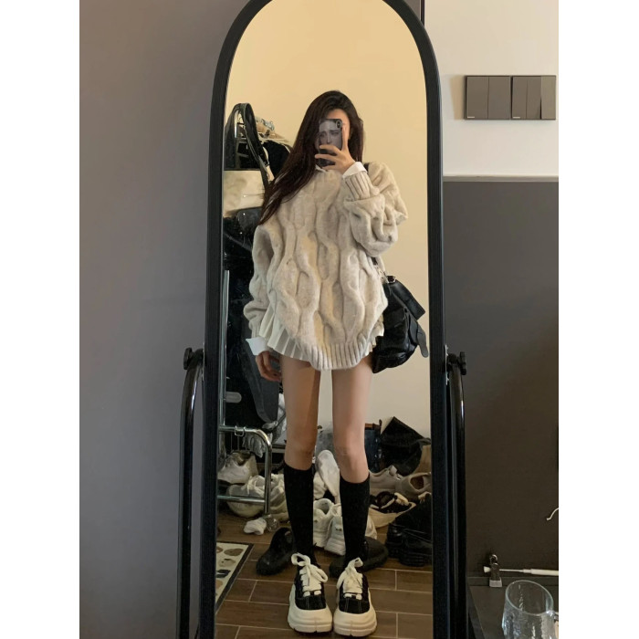 日系奶fufu麻花圓領毛衣女秋冬寬松慵懶風bf軟糯加厚針織衫外套潮