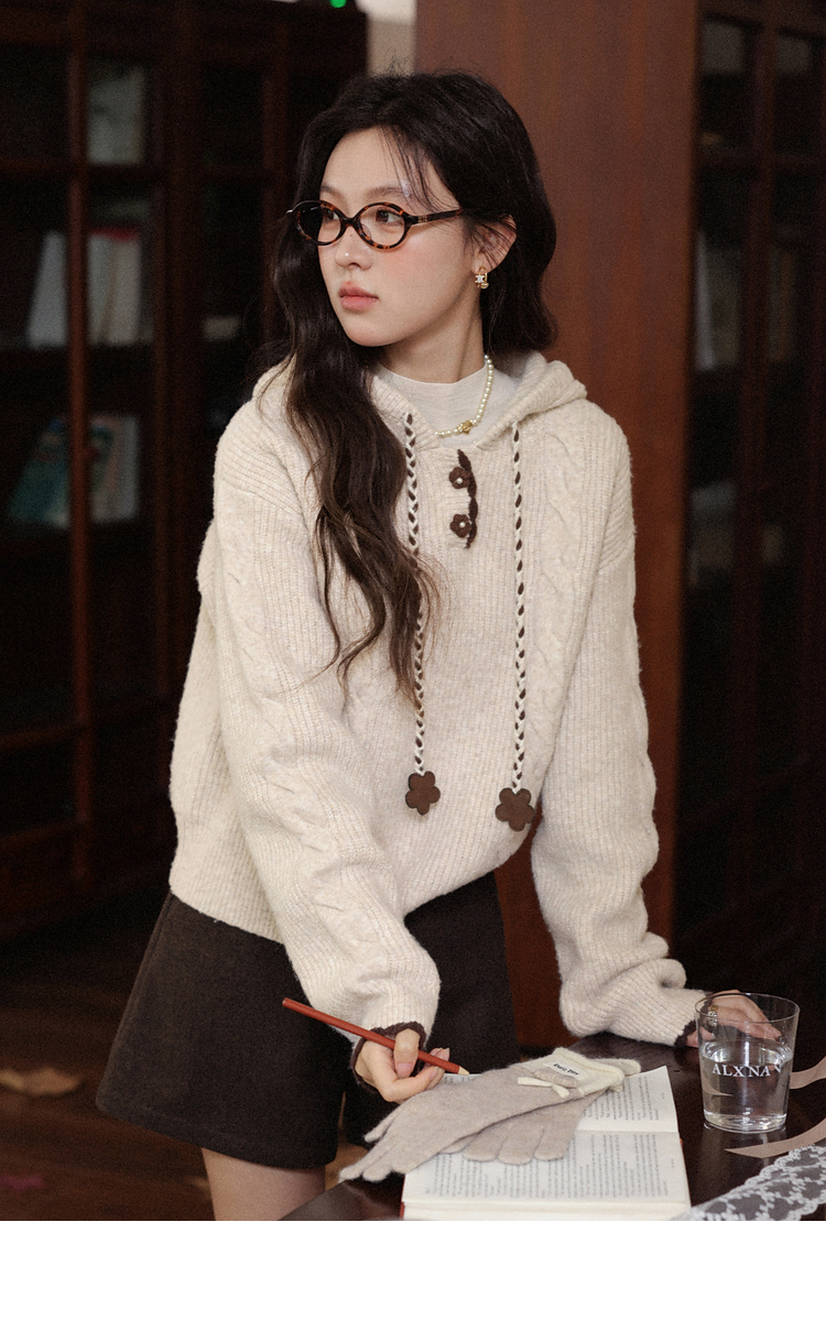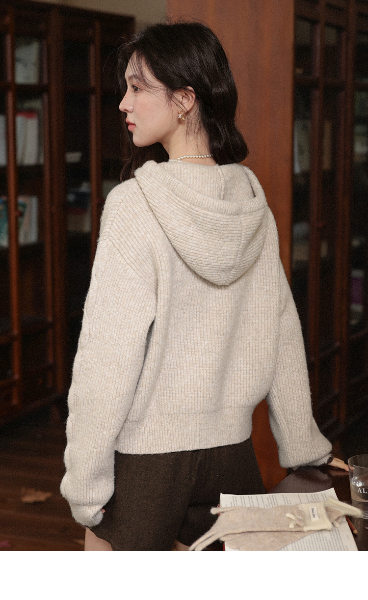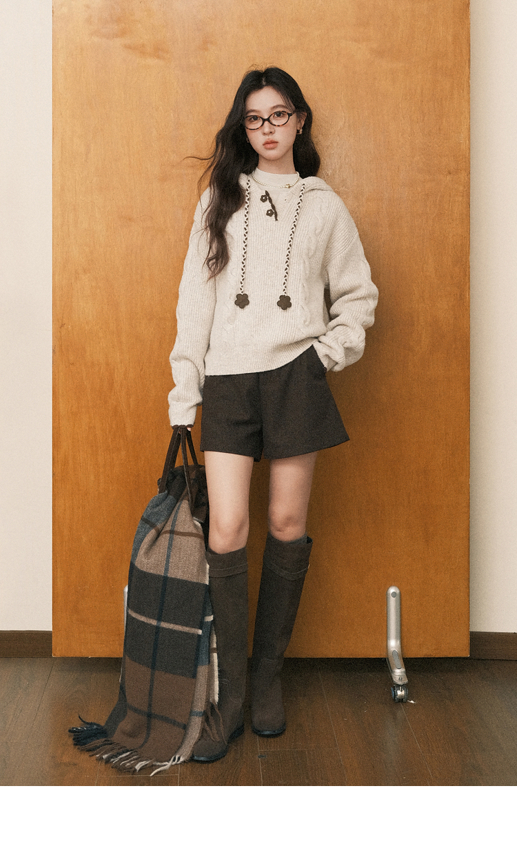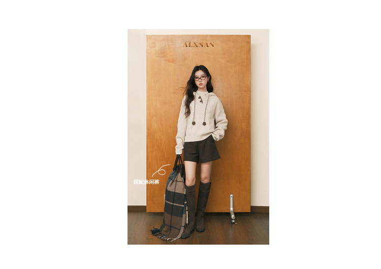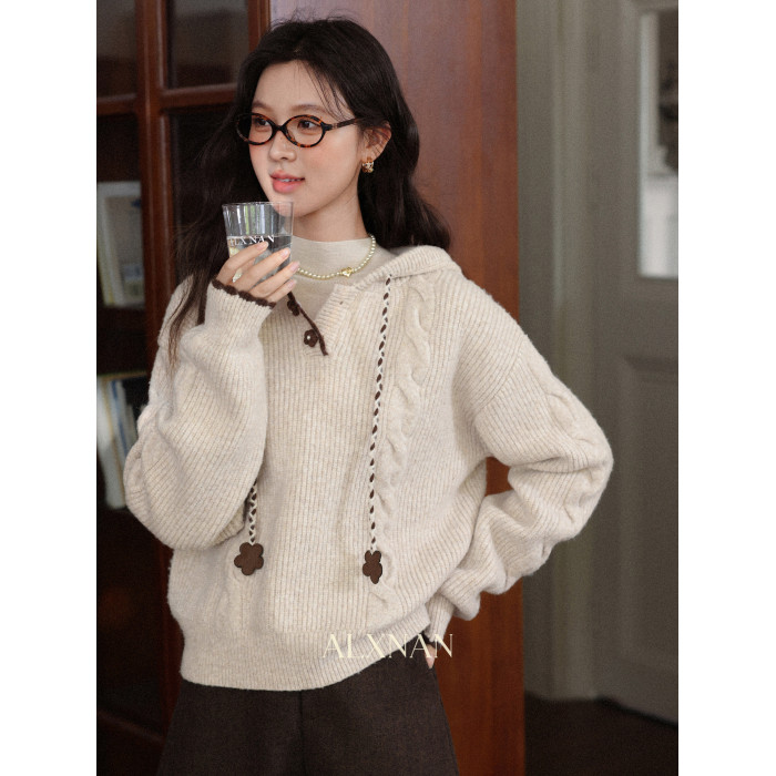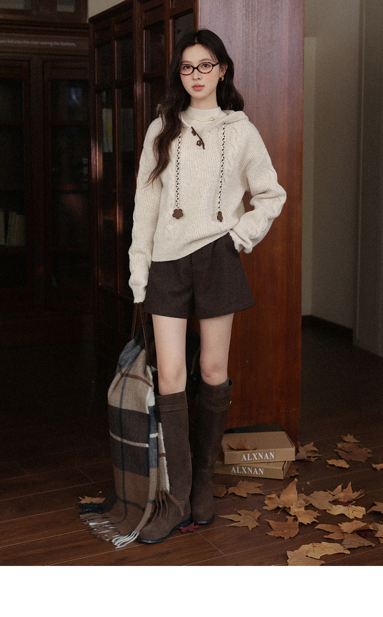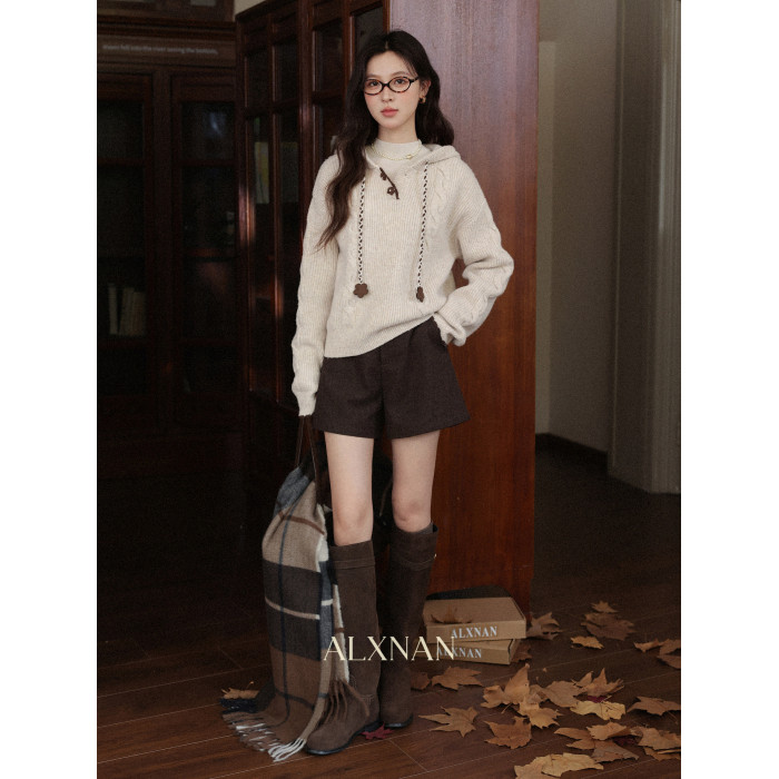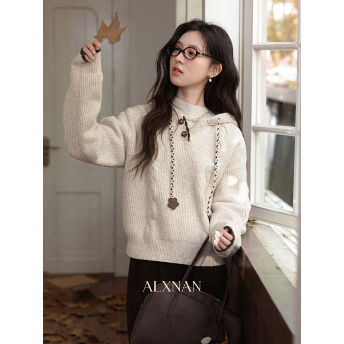 鹿向南「雪頂咖啡」杏色套頭針織毛衣女秋冬慵懶寬松長袖連帽上衣