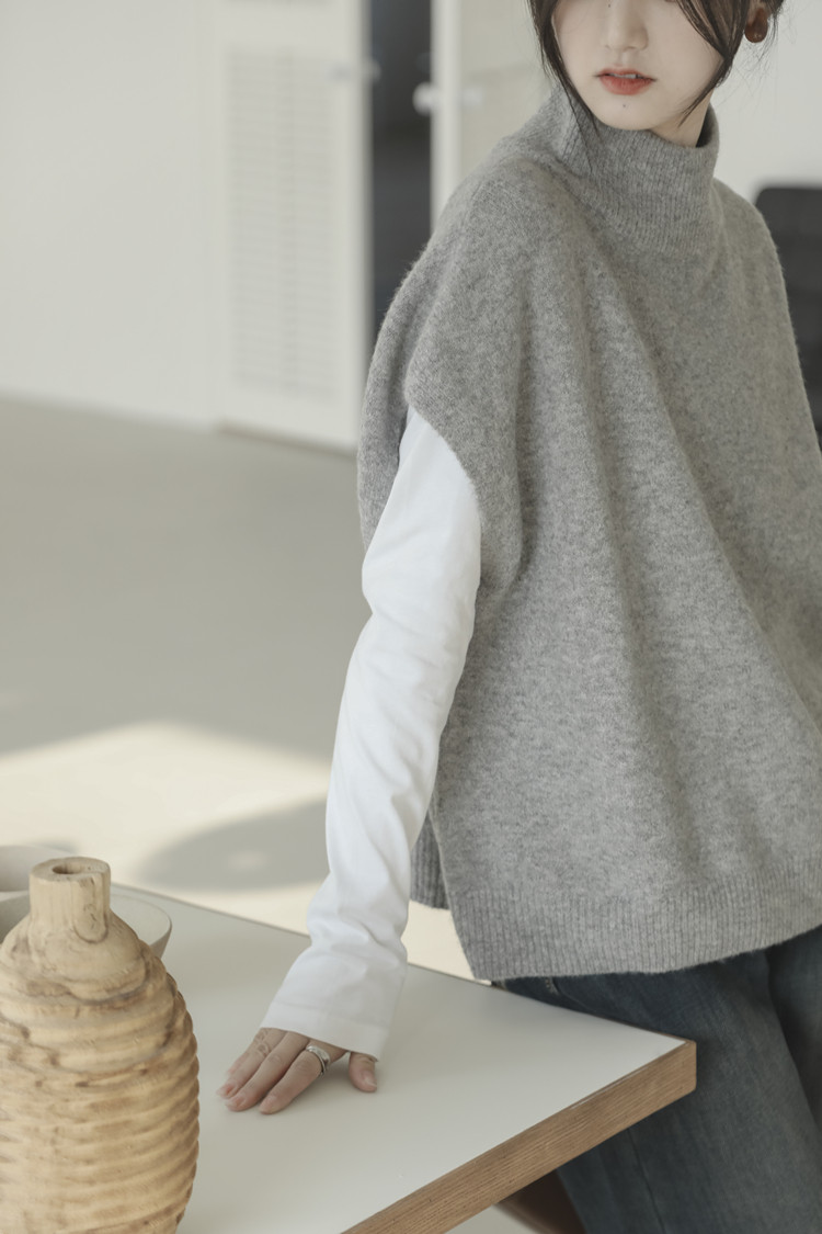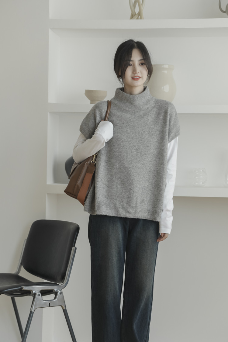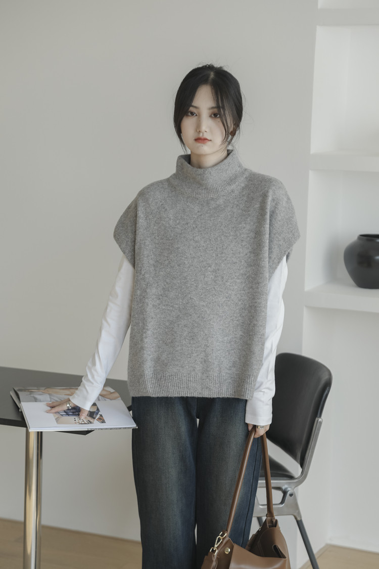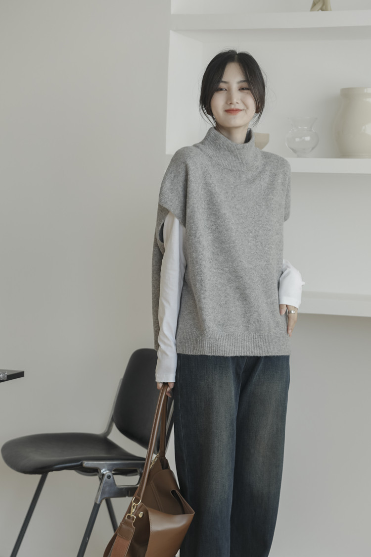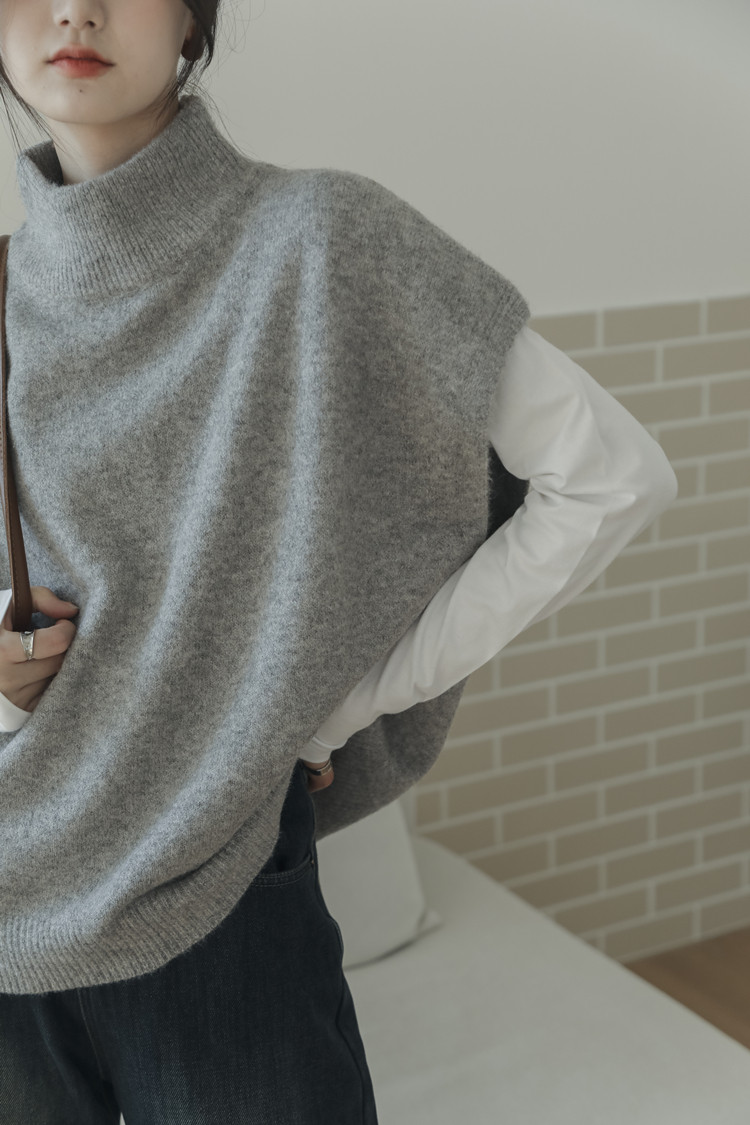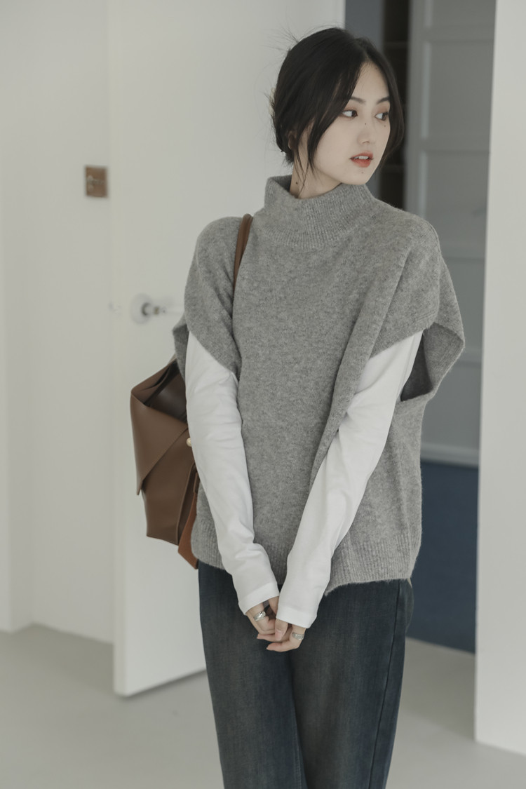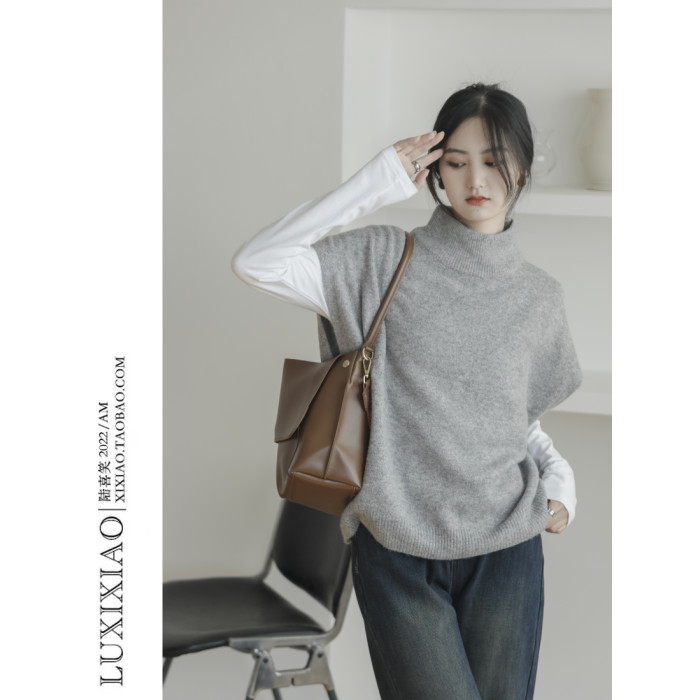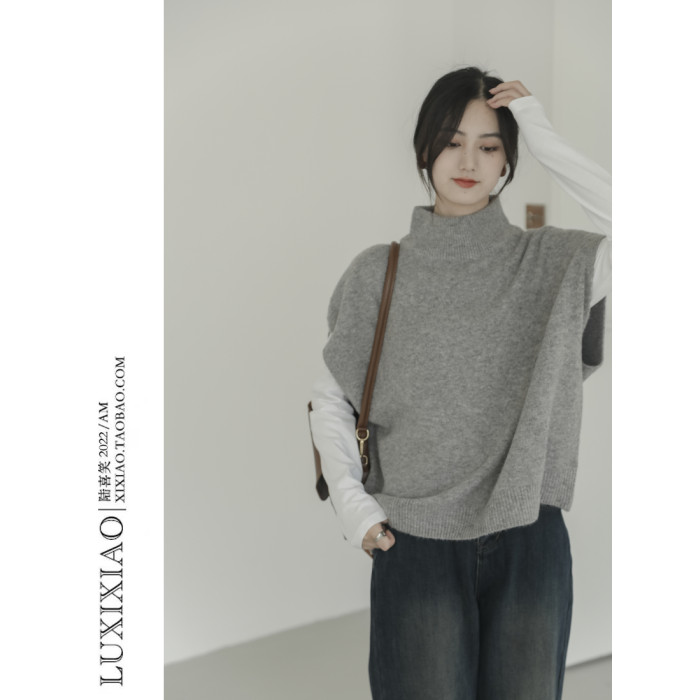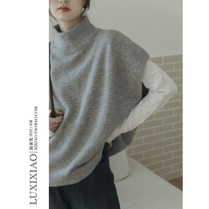 LUXIXIAO針織馬甲女外搭學院風無袖高領坎肩背心毛衣寬鬆灰色上衣