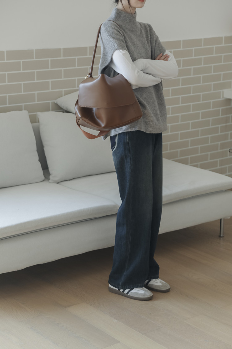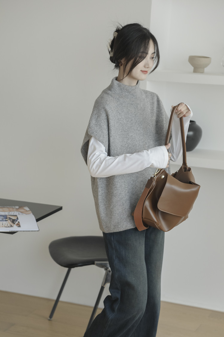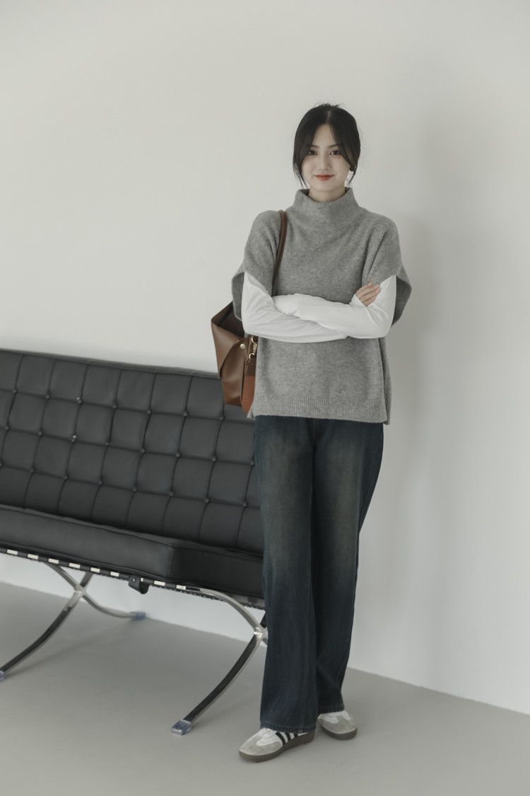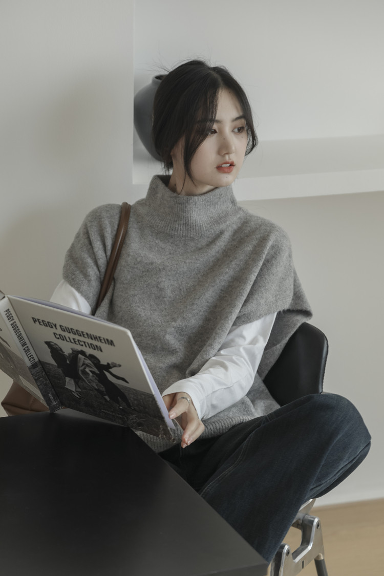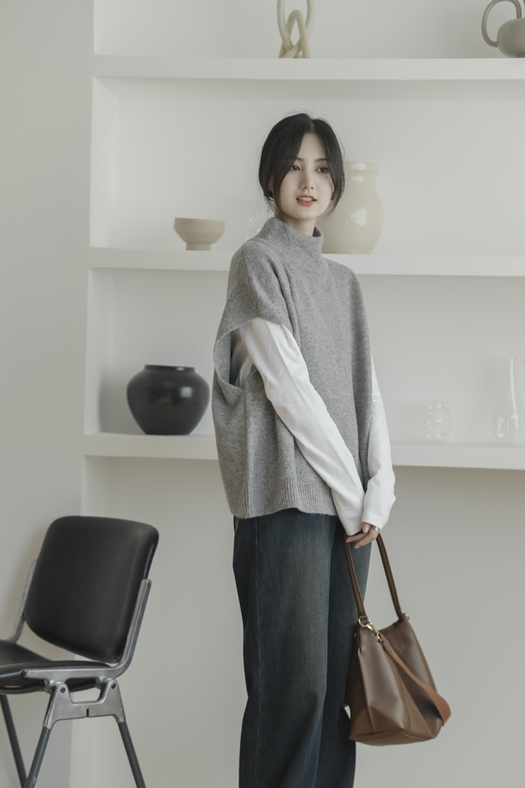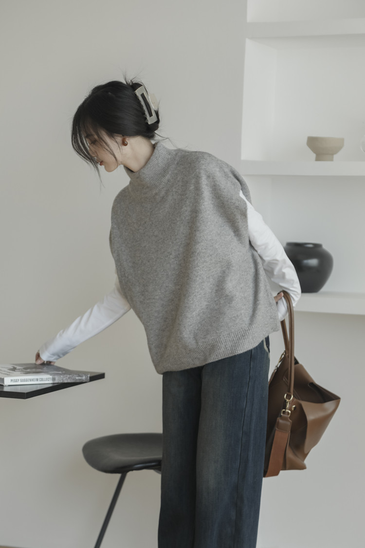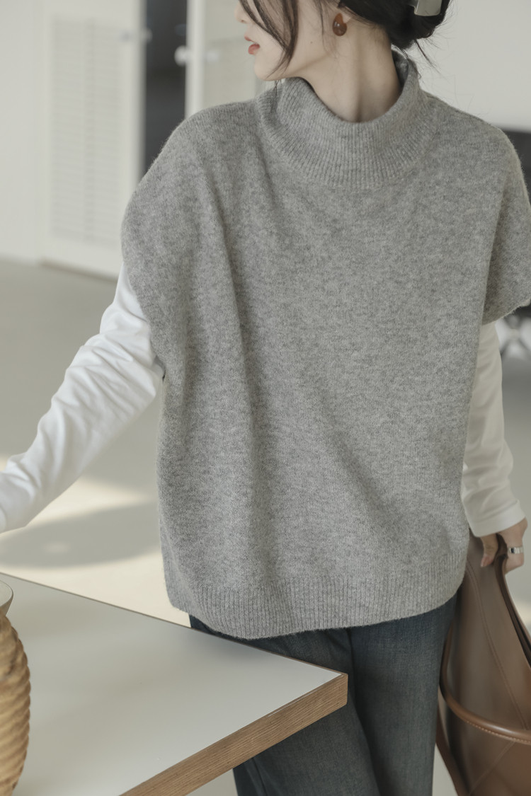LUXIXIAO針織馬甲女外搭學院風無袖高領坎肩背心毛衣寬鬆灰色上衣