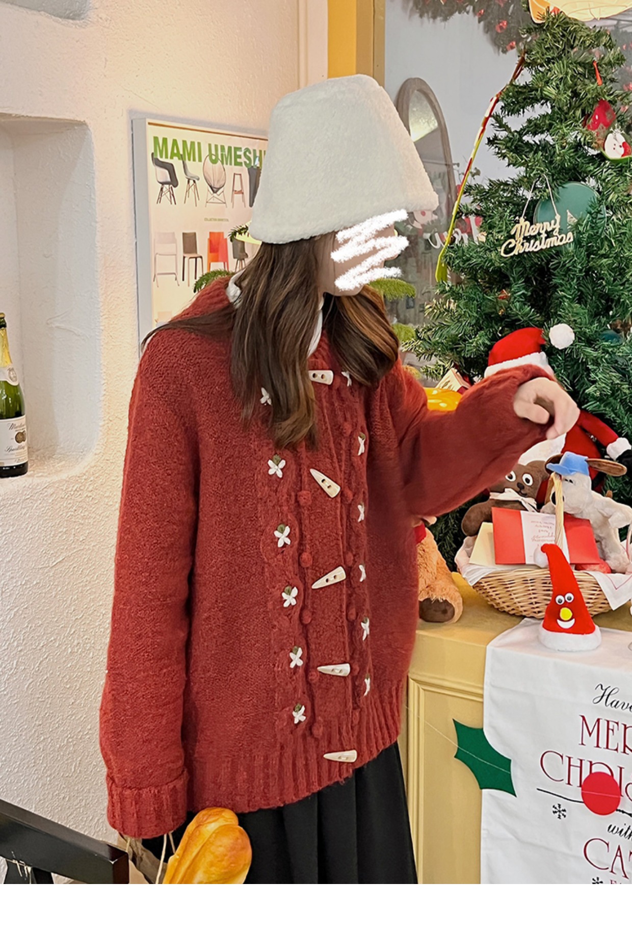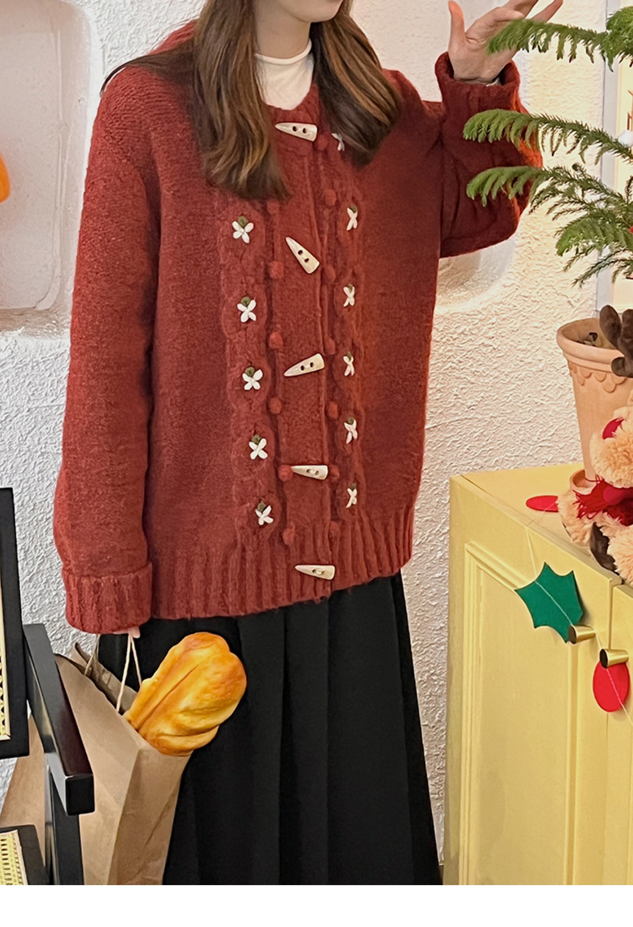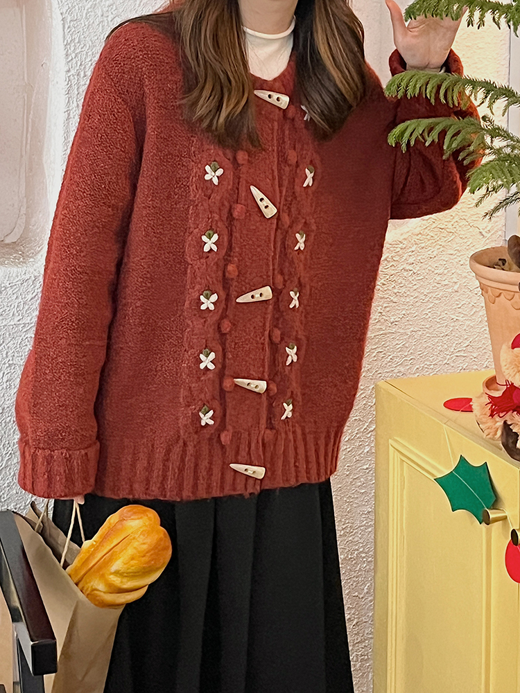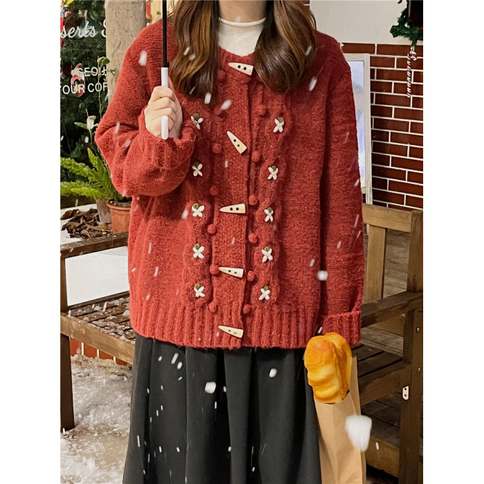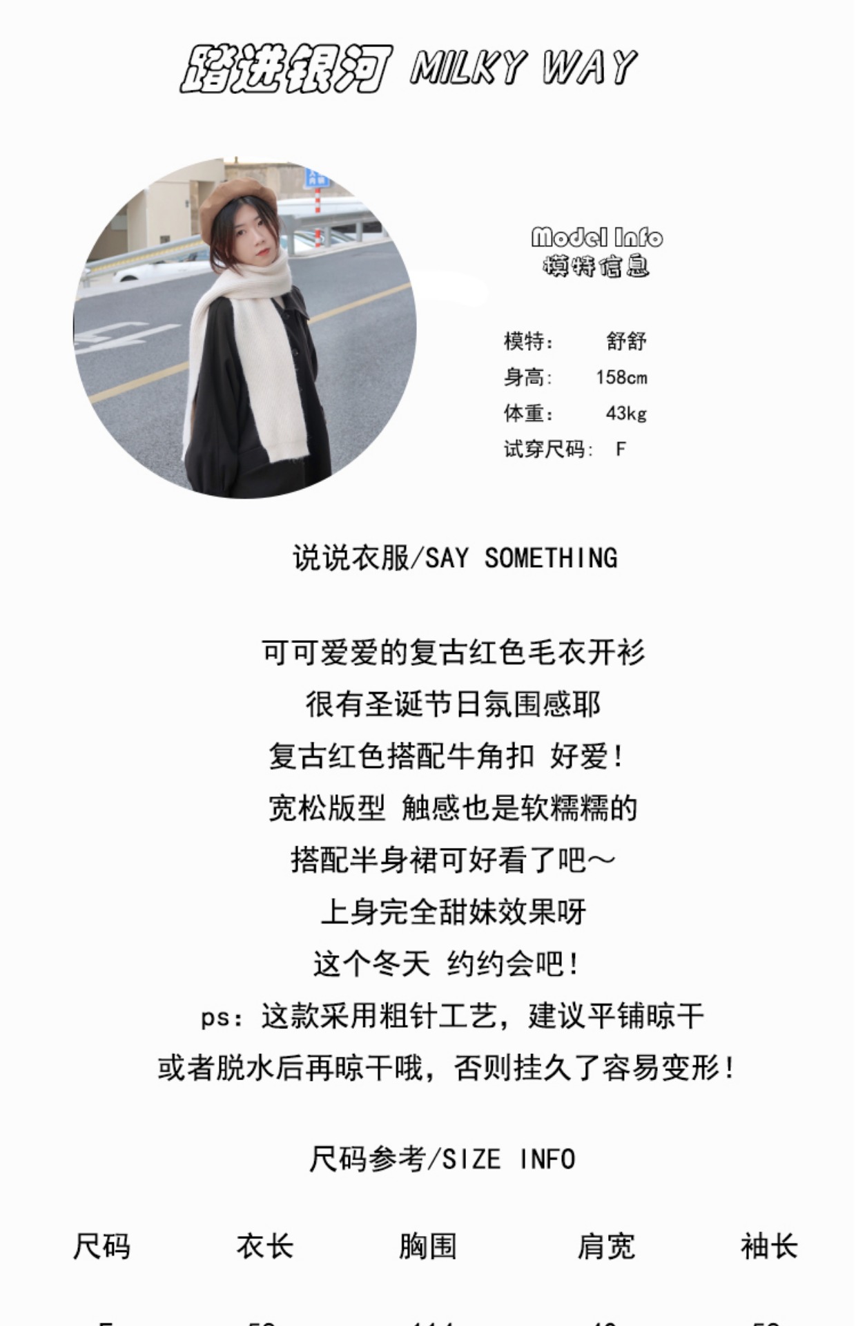 踏進銀河 日系復古刺綉牛角釦毛衣開衫小個子新年紅色甜美針織衫