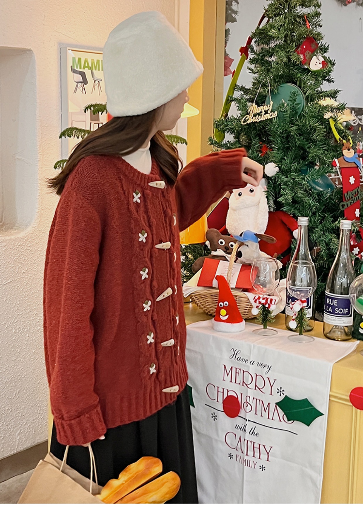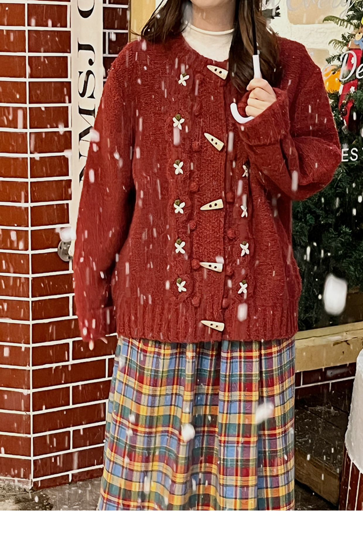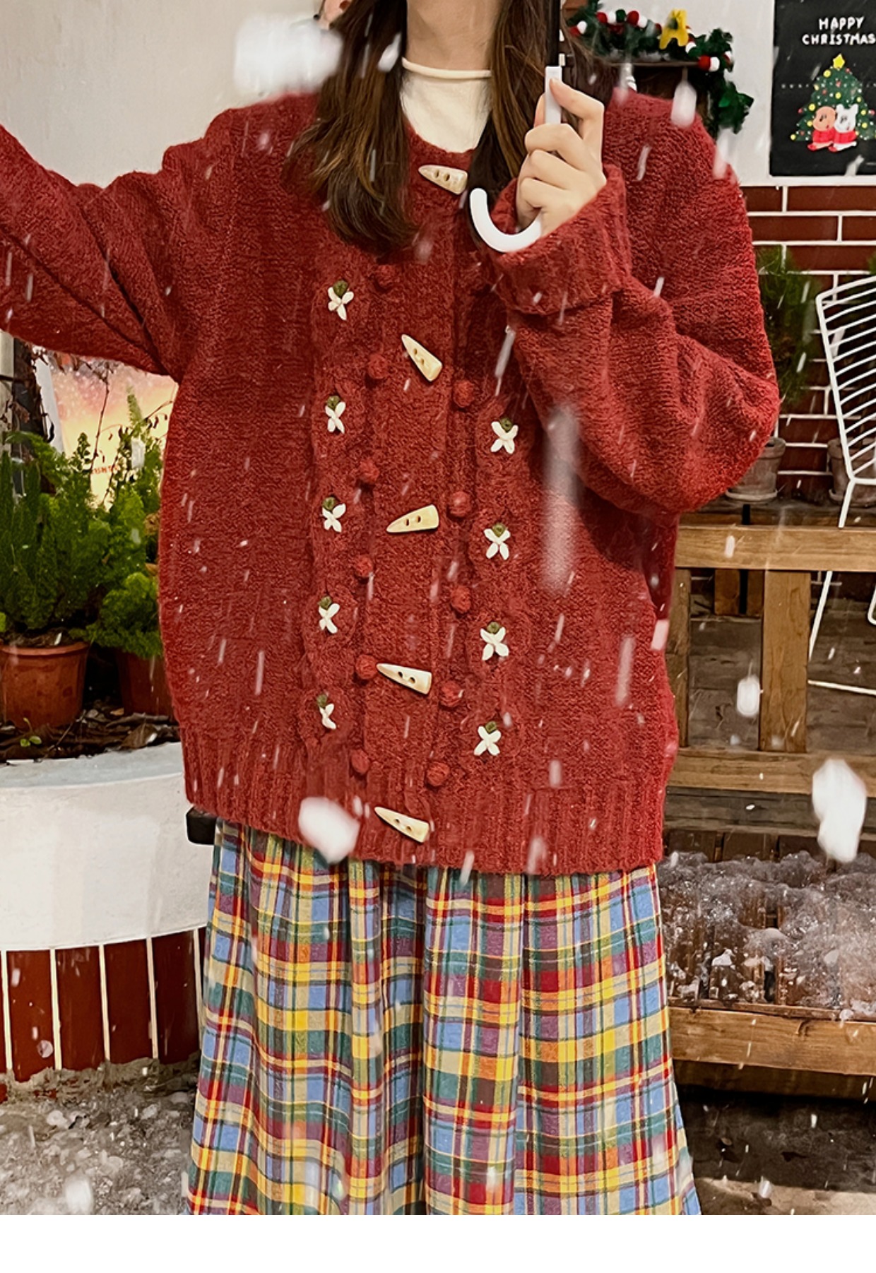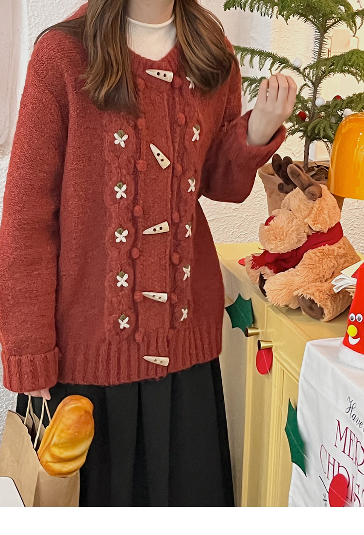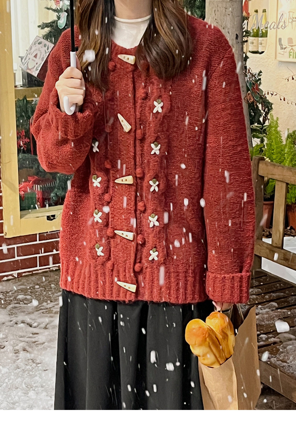 踏進銀河 日系復古刺綉牛角釦毛衣開衫小個子新年紅色甜美針織衫